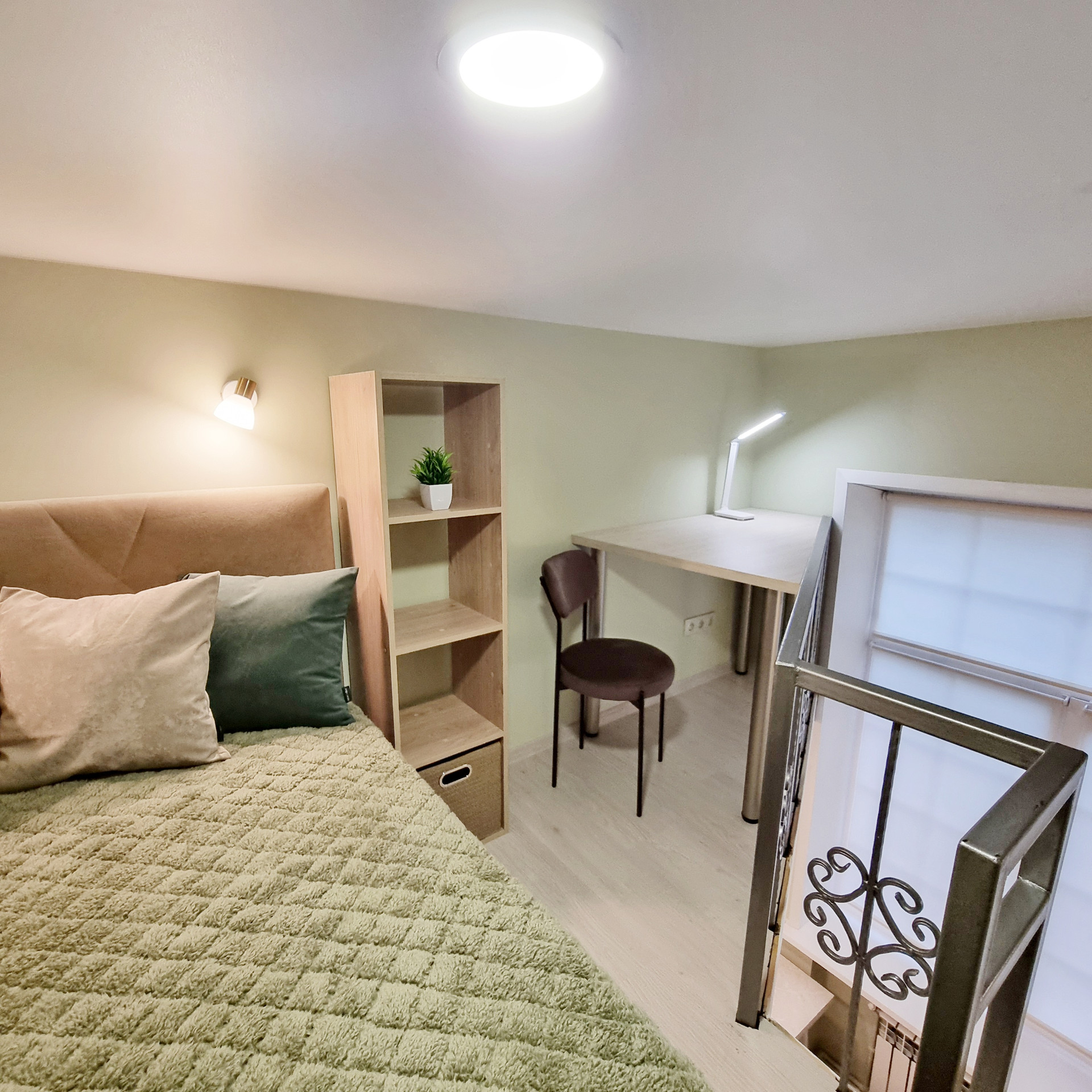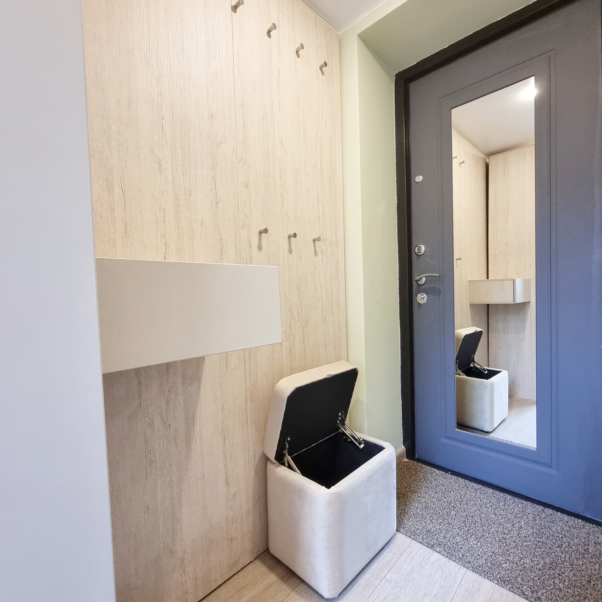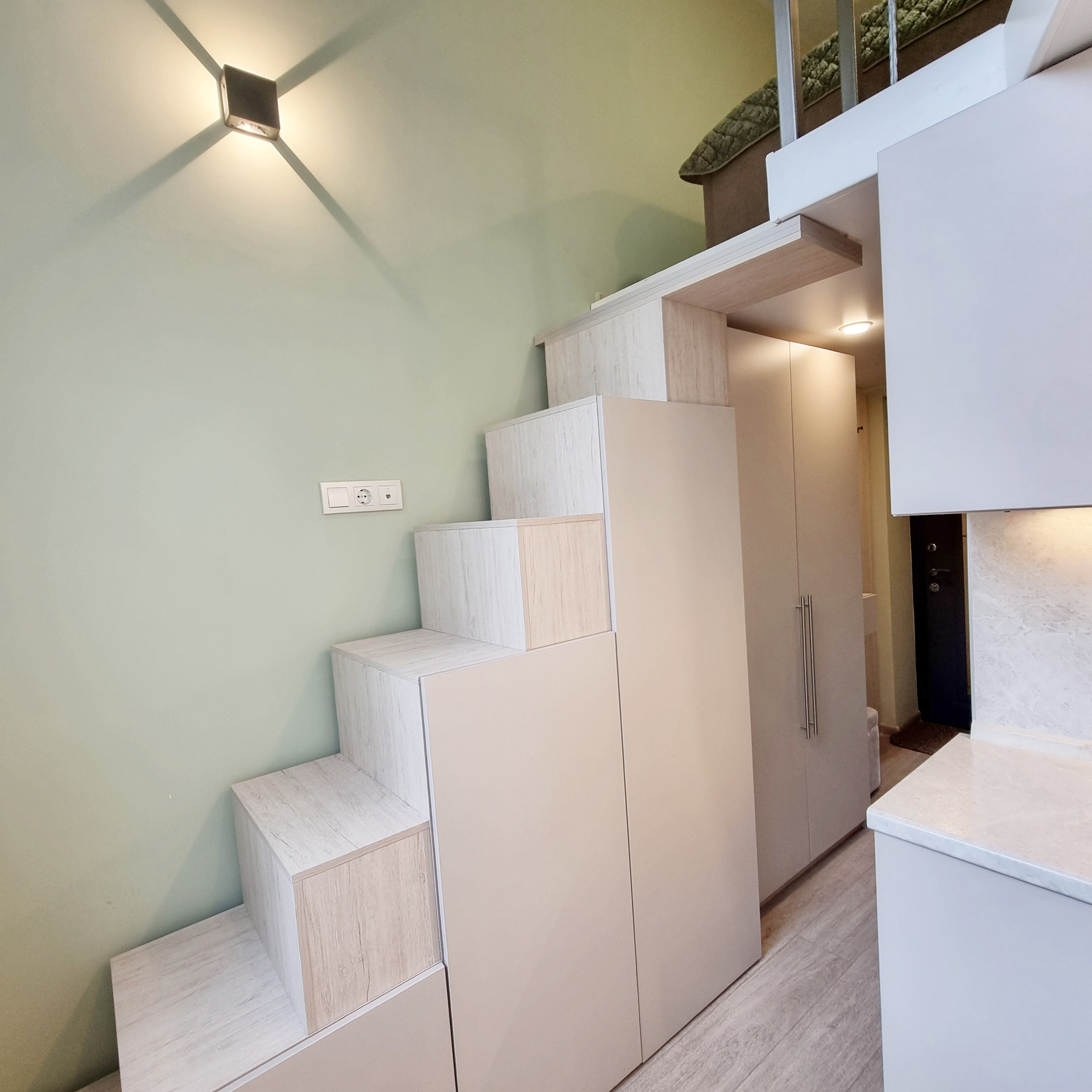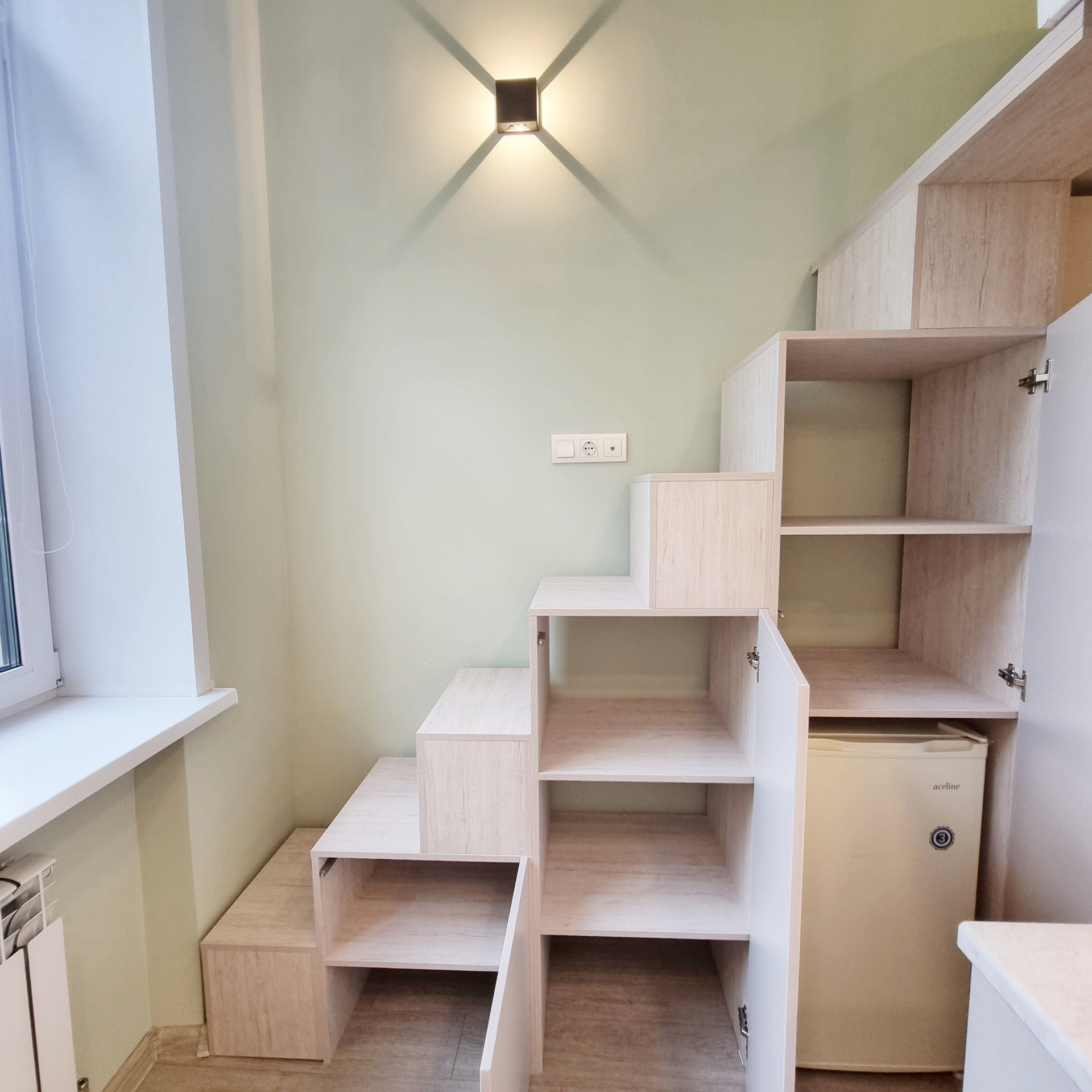 Благодаря специально разработанному дизайну мебели, в студии предусмотрено много удобных мест для хранения. В прихожей двустворчатый шкаф, консоль с выдвижным ящиком, пуфик с ящиком для хранения. Лестница на второй уровень организована, как дополнительные места хранения. Продумано даже, если новому хозяину будет нужен большой холодильник, он сможет с лёгкостью поменять имеющийся, на холодильник большего размера, сняв полки в шкафу. На втором этаже полноценная кровать с подъёмным механизмом и с ящиками для хранения и новым ортопедическим матрасом средней жёсткости, 140х200. Стеллаж с ящиком. Большой письменный стол для занятий и/или работы. В студии предусмотрены компактные табуреты и стул одинаковой конструкции, чтобы при необходимости их можно было легко штабелировать. Много разных решений освещения. На каждой створке окна установлена своя рулонная штора, что очень удобно, для регулирования приватности или освещённости Вашего пространства.