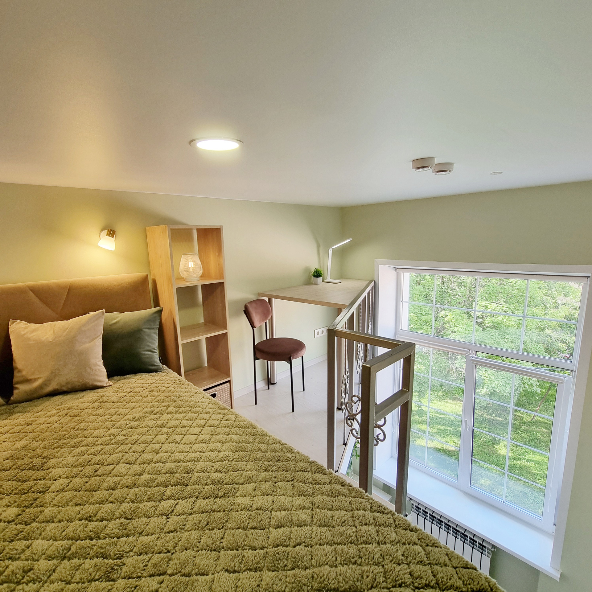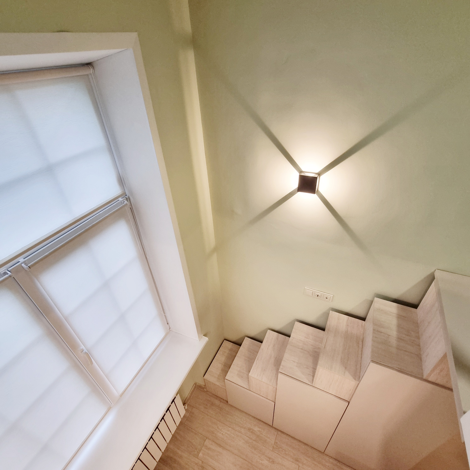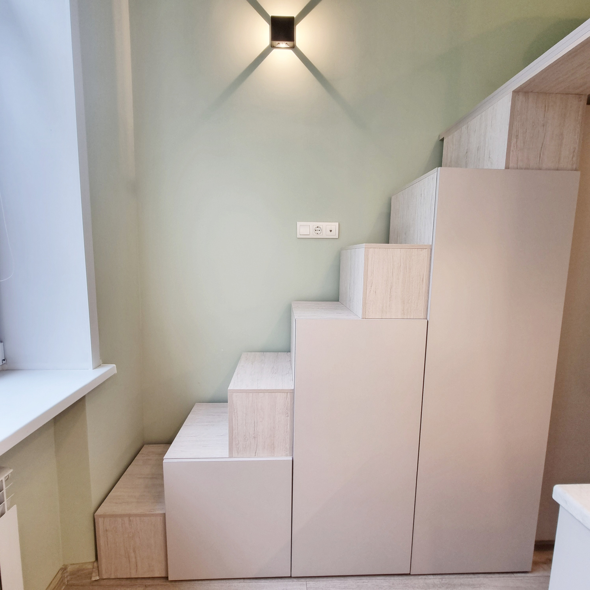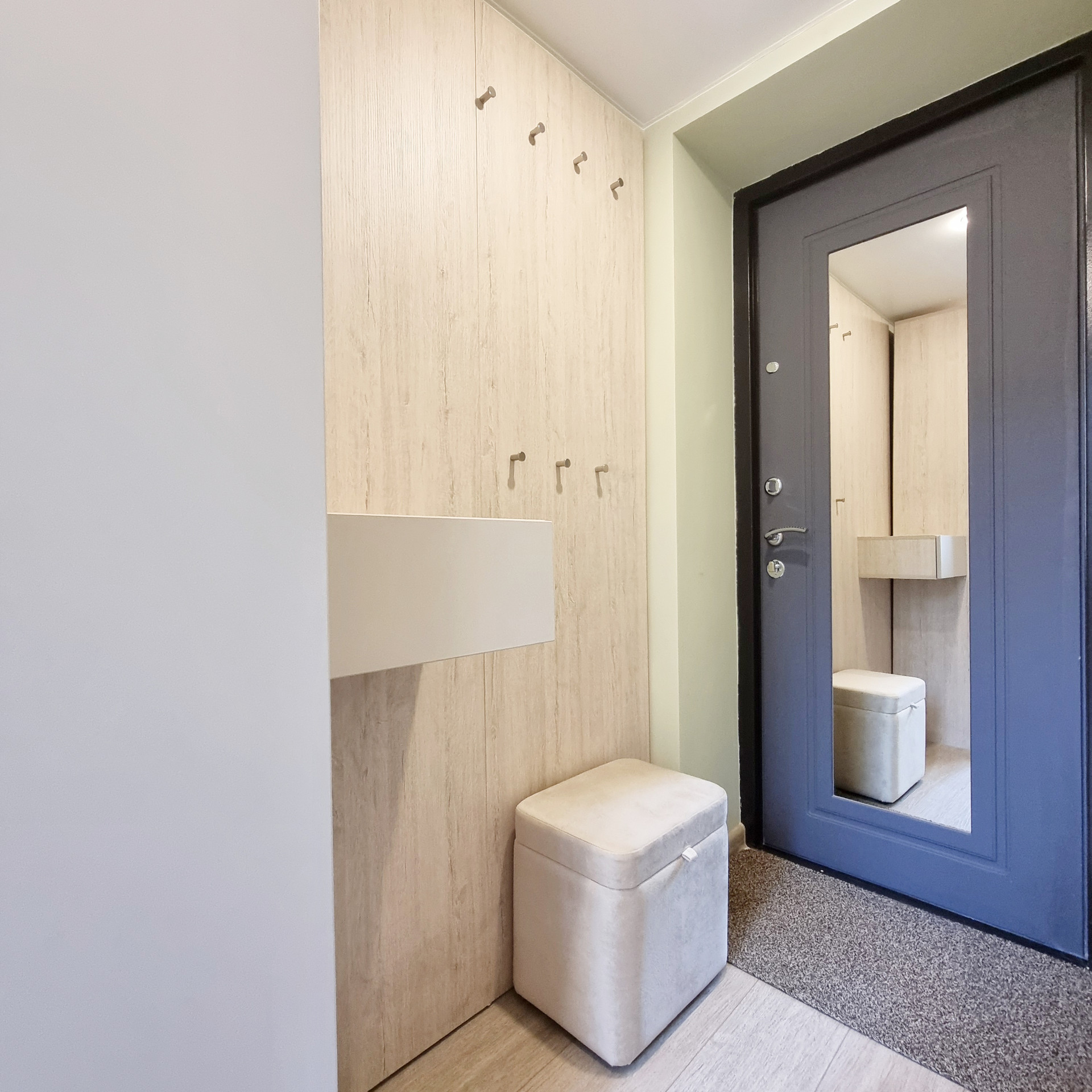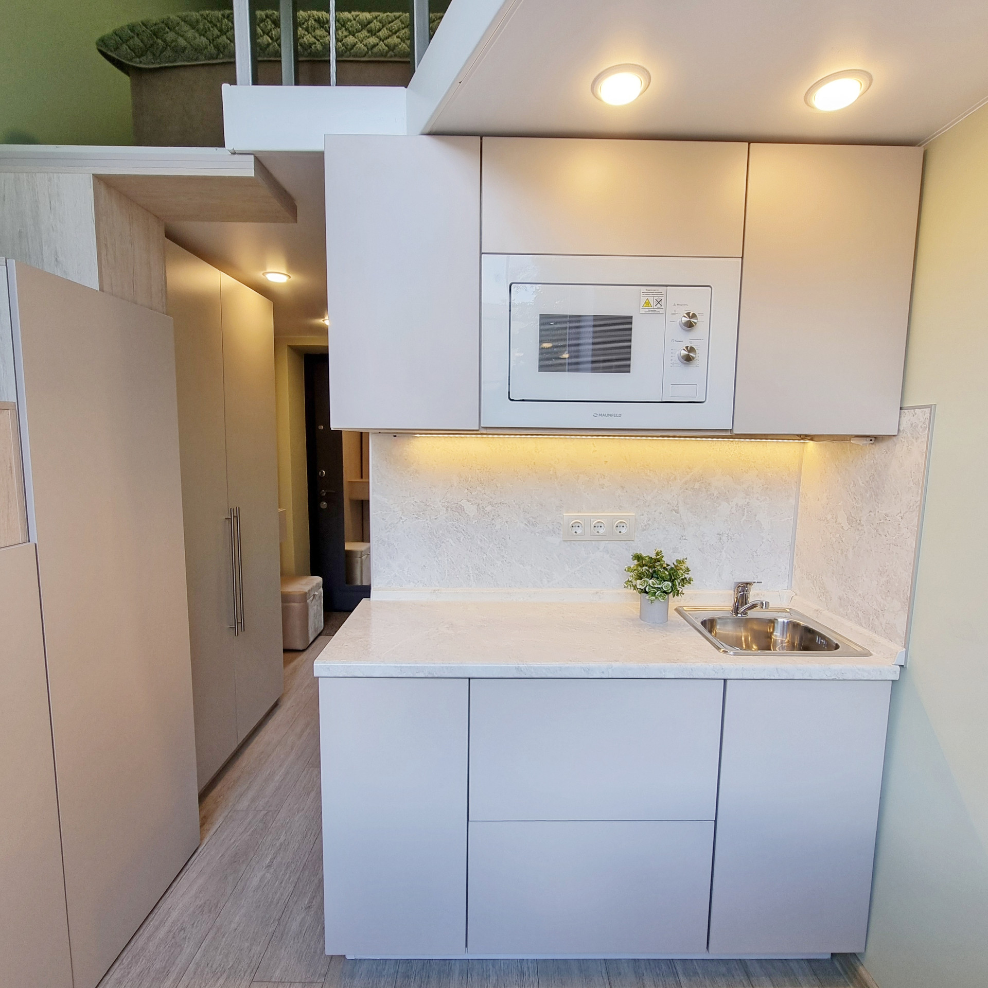 Благодаря специально разработанному дизайну мебели, в студии предусмотрено много удобных мест для хранения. В прихожей двустворчатый шкаф, консоль с выдвижным ящиком, пуфик с ящиком для хранения. Лестница на второй уровень организована, как дополнительные места хранения. Продумано даже, если новому хозяину будет нужен большой холодильник, он сможет с лёгкостью поменять имеющийся, на холодильник большего размера, сняв полки в шкафу. На втором этаже полноценная кровать с подъёмным механизмом и с ящиками для хранения и новым ортопедическим матрасом средней жёсткости, 140х200. Стеллаж с ящиком. Большой письменный стол для занятий и/или работы. В студии предусмотрены компактные табуреты и стул одинаковой конструкции, чтобы при необходимости их можно было легко штабелировать. Много разных решений освещения. На каждой створке окна установлена своя рулонная штора, что очень удобно, для регулирования приватности или освещённости Вашего пространства.