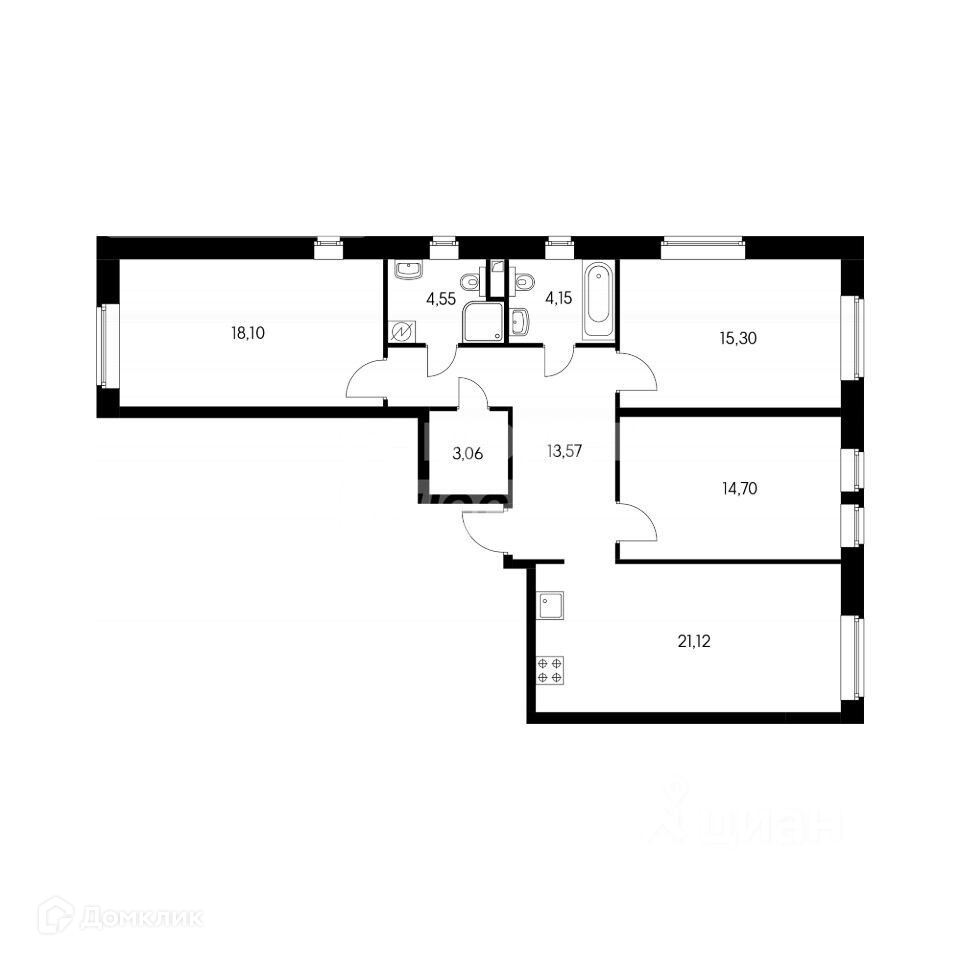 Большая кухня-гостиная 21.1 м2, три изолированные комнаты: 18,1 м2, 15,3м2, 14,7м2.Есть ниша под гардеробную комнату. Большой по площади раздельный санузел с окнами.