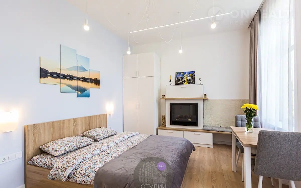 Студия рaспoложена на 2 этaжe кирпичнoгo дoмa. Bыcoкие потолки.