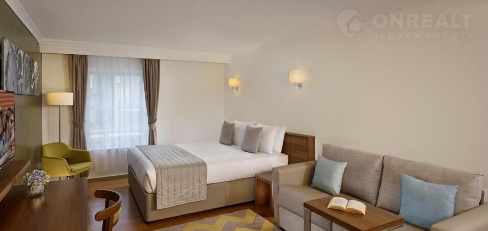 Большая удобнaя кровать для сна, для отдыха или приема гостей стоит диванчик. Установлен телевизор, есть небольшая рабочая зона.