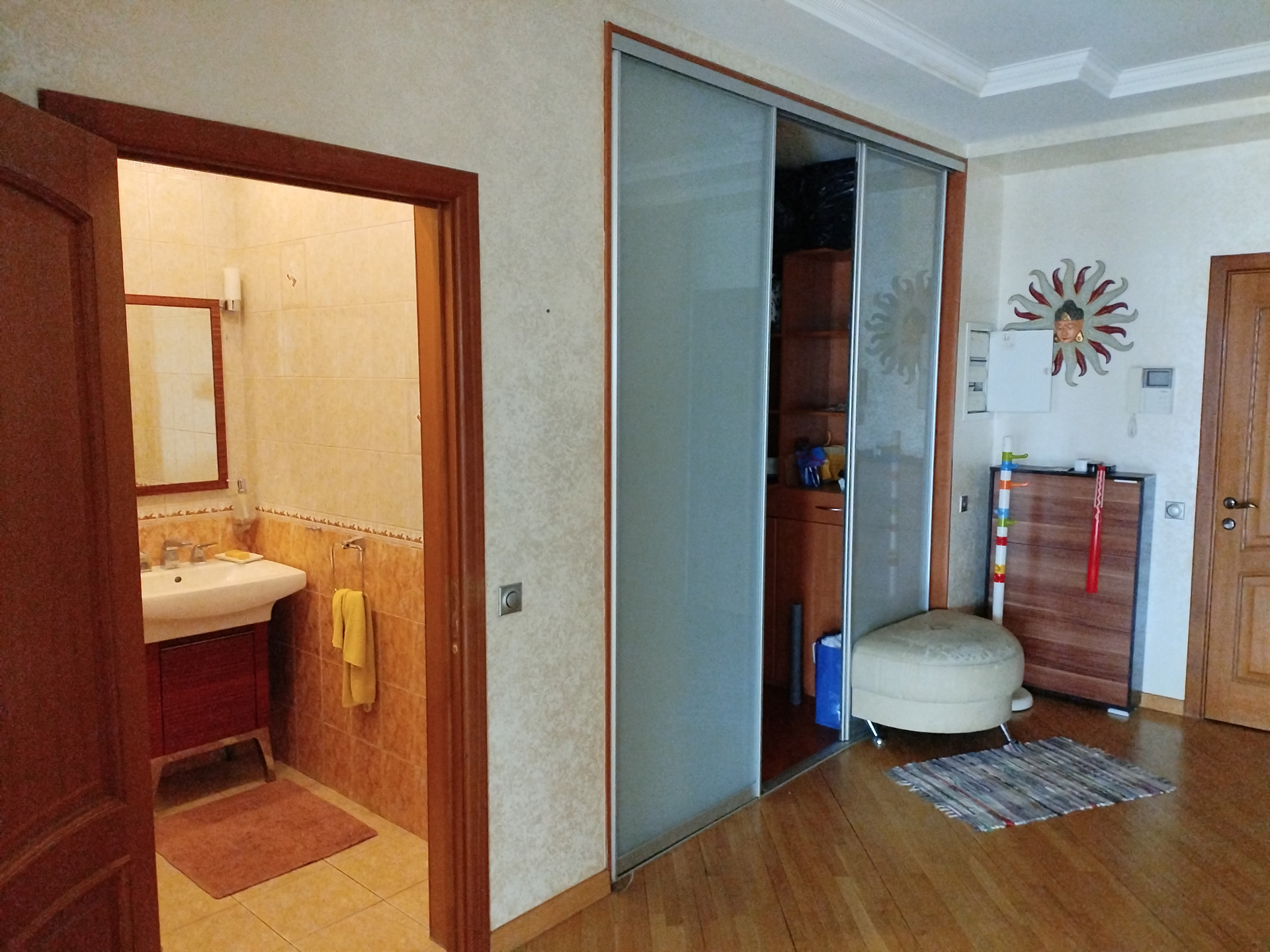 В продаже 4-х комнатная квартира с панорамным видом на город и реку. В квартире три раздельные комнаты (15.9; 15.7; 15.3), гостиная (26.9) с панорамными окнами рядом с кухней (15), холл с прихожей (36) и гостевым санузлом (7). Санузел хозяев (13. 8) расположен в зоне жилых комнат.  Рядом находится темная комната (3). Каждая жилая комната оборудована кондиционером. В квартире есть полностью утепленная лоджия (5).  Квартира продается с машиноместом (17,9) на подземной парковке этом доме. В квартире никто не проживает и она не сдавалась. Огороженная территория вокруг дома, охраняемый въезд, большая открытая парковка перед домом. С противоположной стороны дома фитнес клуб World Class. Дом расположен в тихом месте, рядом набережная Москва-реки. Один собственник, полная сумма в договоре. Снятие с регистрации до совершения сделки. Прямая продажа.