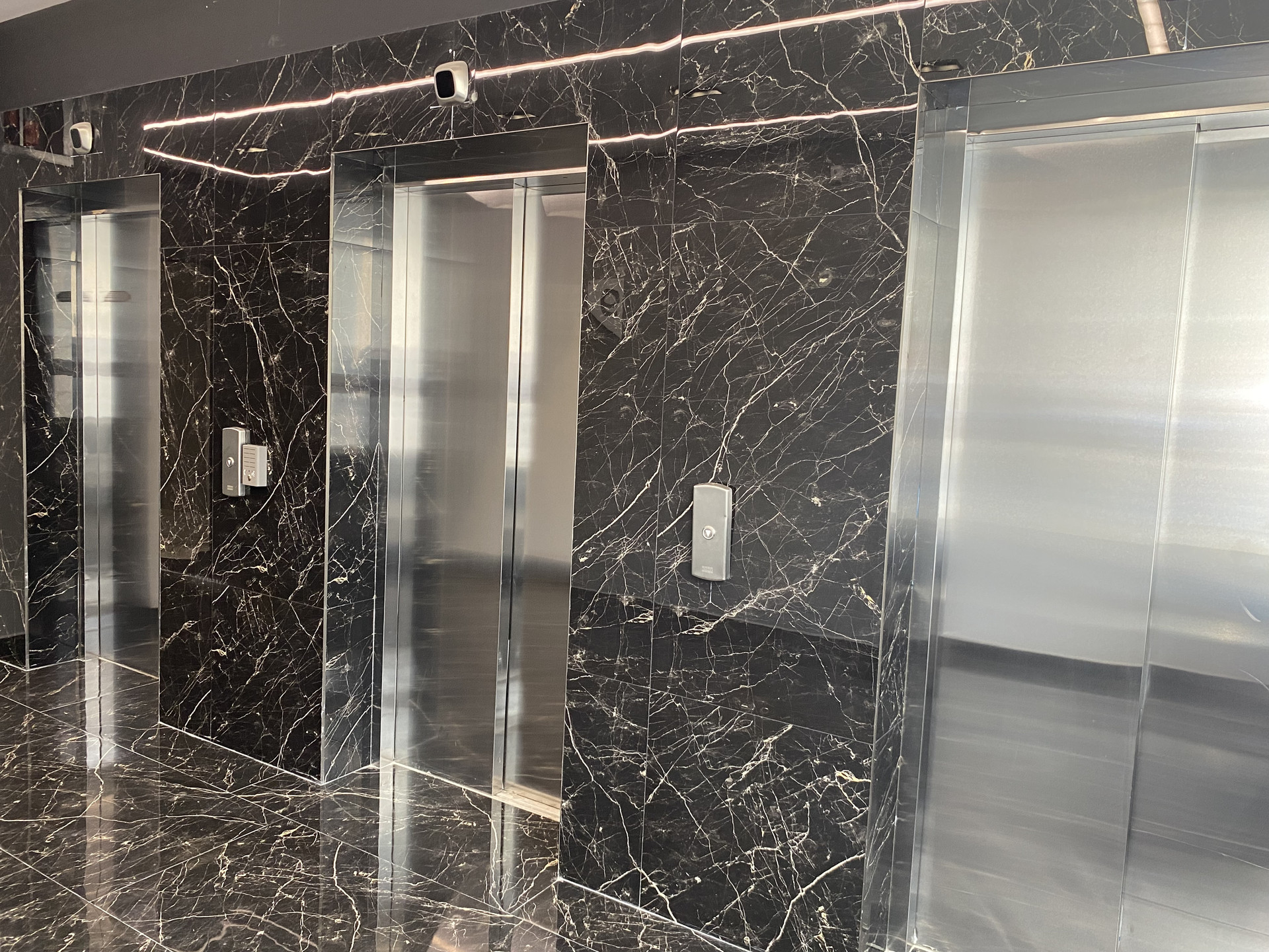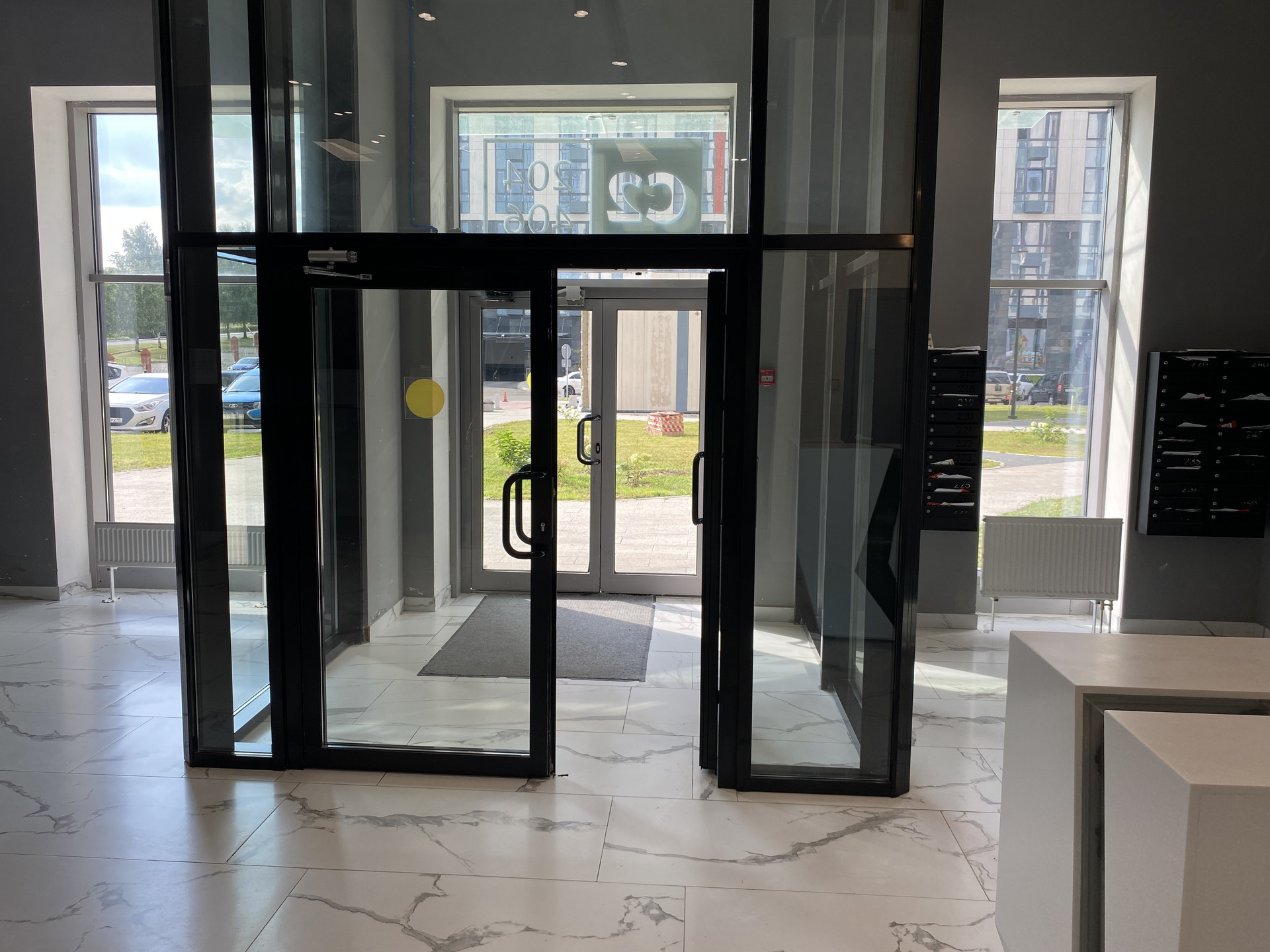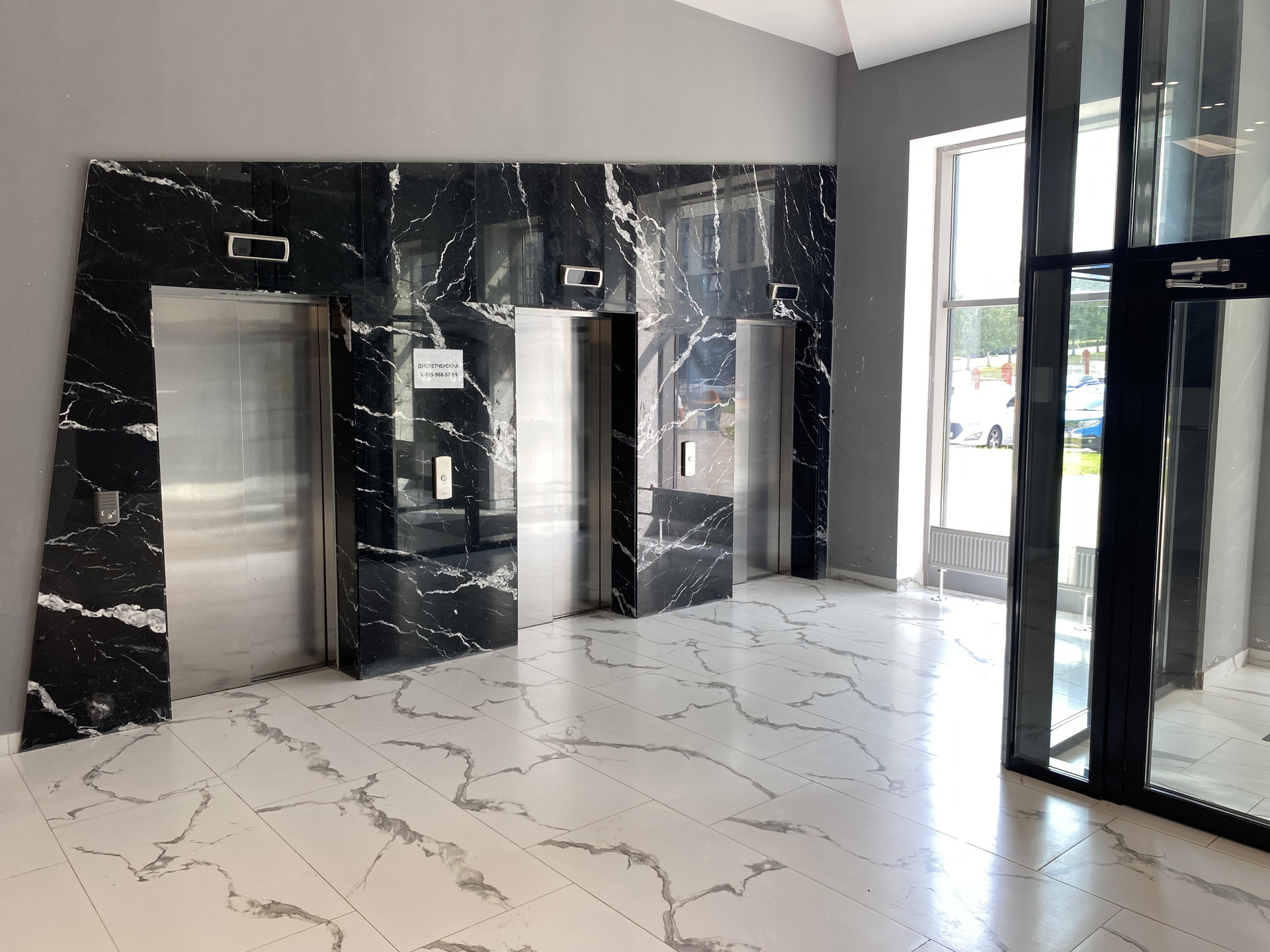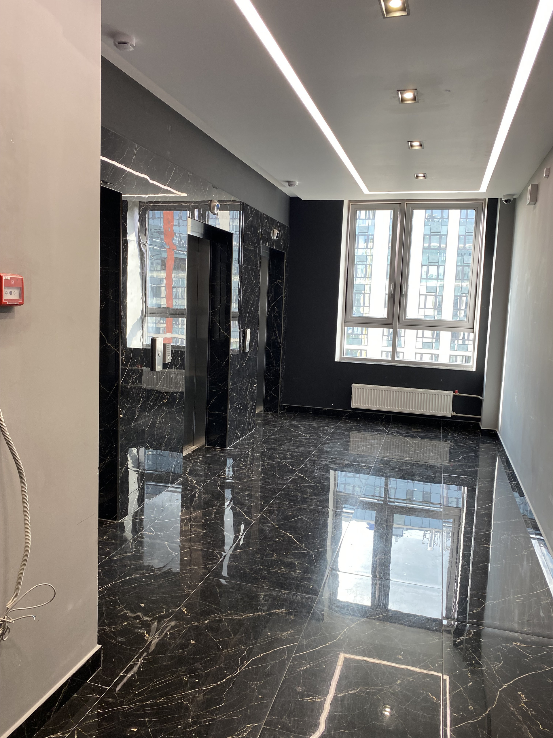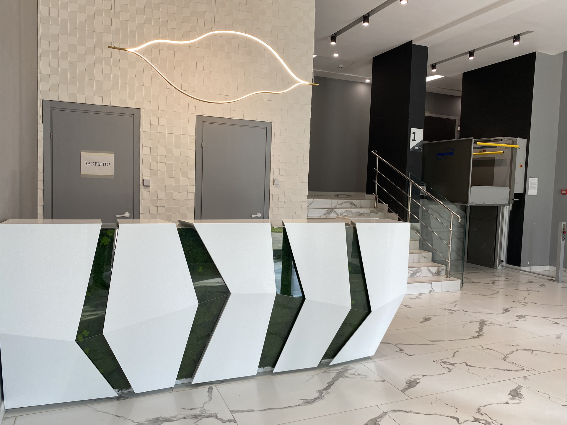 Лобби комплекса с высокими потолками, красивой дизайнерской отделкой, стойкой ресепшен, комнатой для корреспонденции, колясочной, зоной для хранения велосипедов и специальным оборудованием для людей с ограниченными возможностями. Для отделки использованы натуральный мрамор и керамогранит. Три тихих грузовых лифта, один спускается на 1 этаж, прям на подземный паркинг.