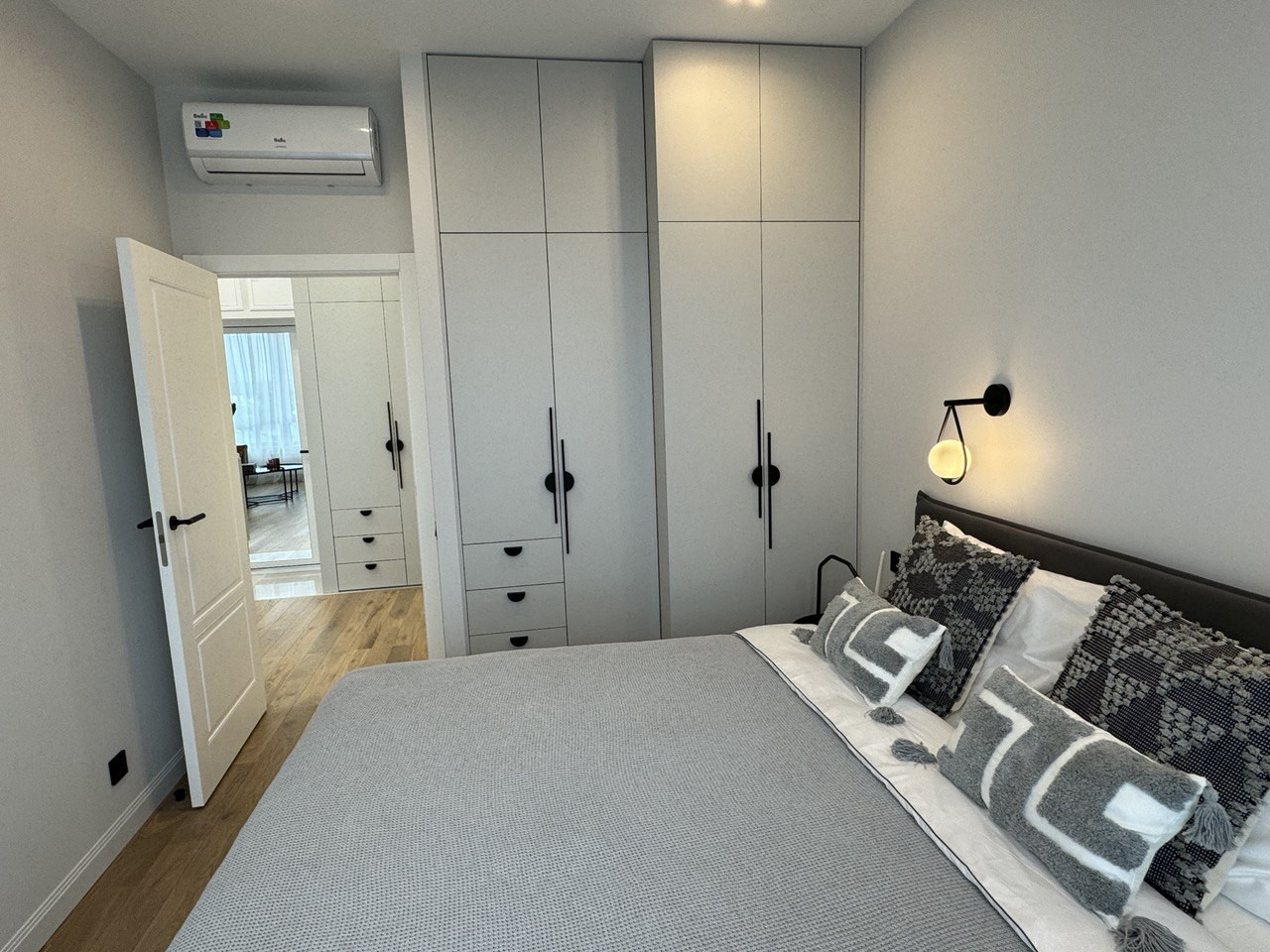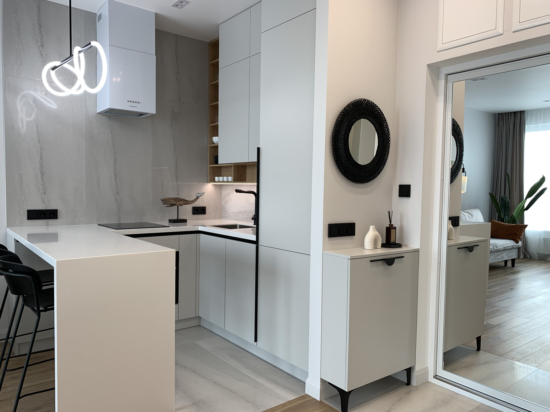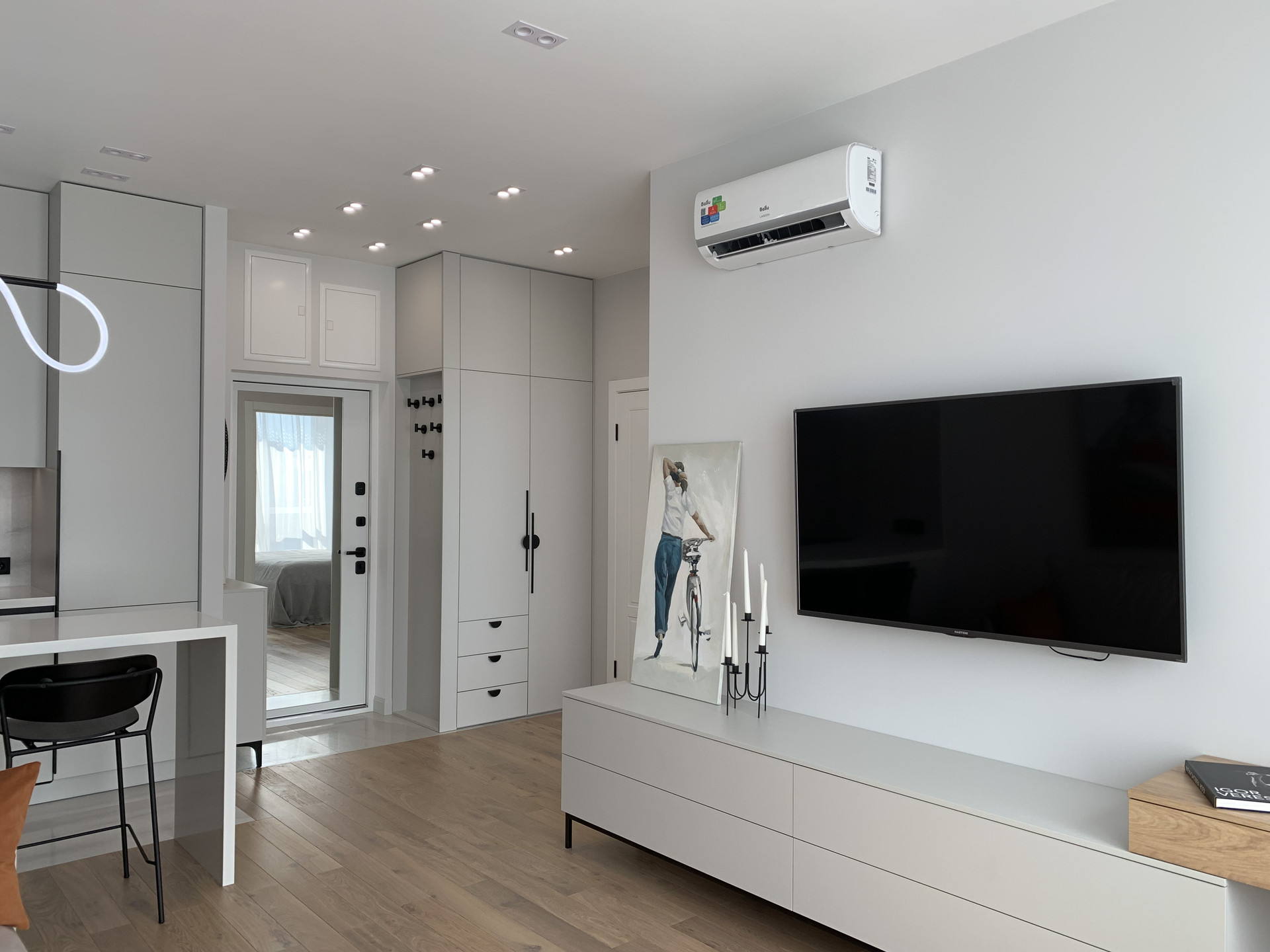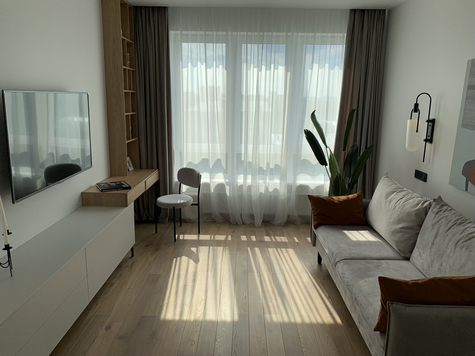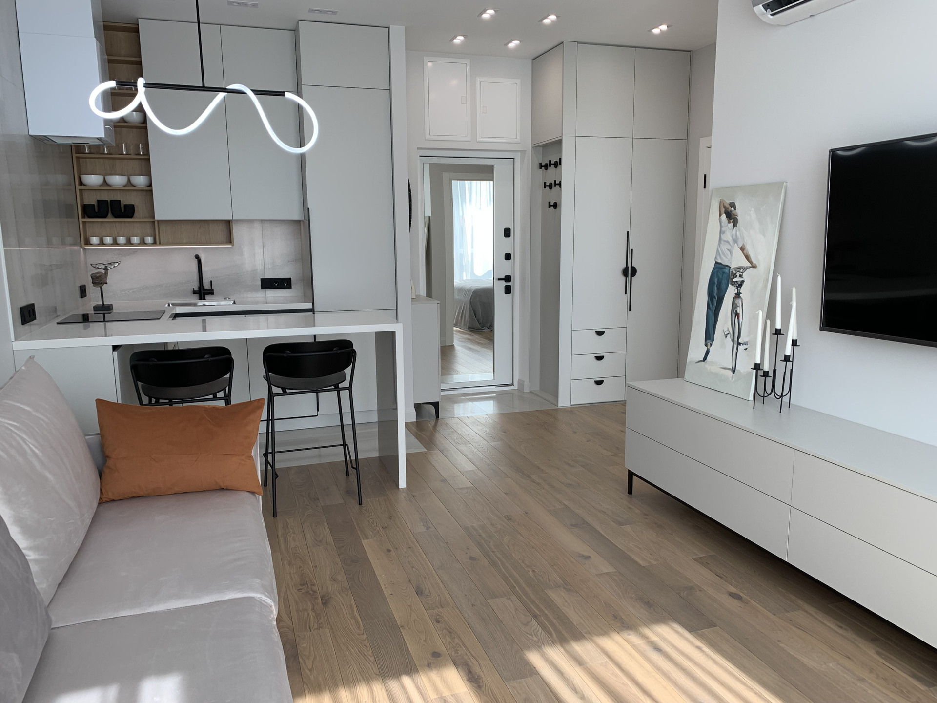 Встроенная кухня со встроенной бытовой техникой: холодильник Gorenje, духовой шкаф с функцией СВЧ, индукционная варочная панель, посудомоечная машина; фильтр для питьевой воды, измельчитель пищевых отходов, вытяжка. Установлены: сплит-система, накопительный бойлер, система от протечек. В гостиной диван раскладывается, телевизор 55 дюймов. Стиральная машина с сушкой в ванной. Теплый пол в прихожей, ванной и на кухне. Два встроенных шкафа: в прихожей и спальне. Пол: инженерная доска, керамогранит.