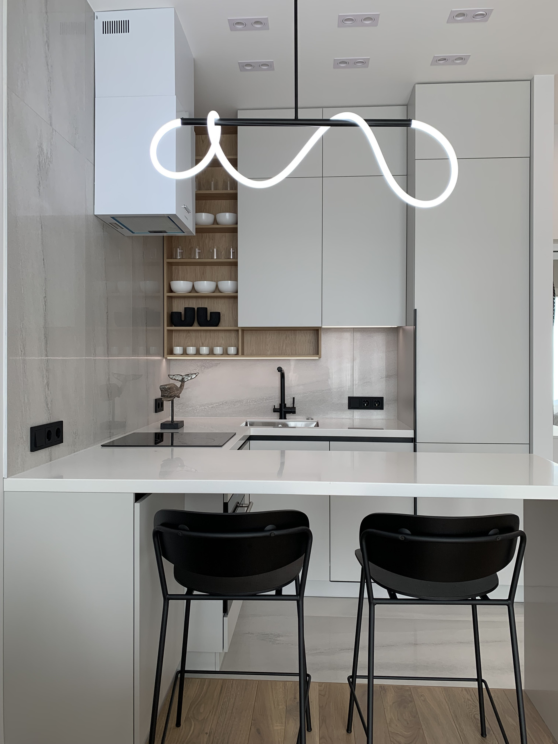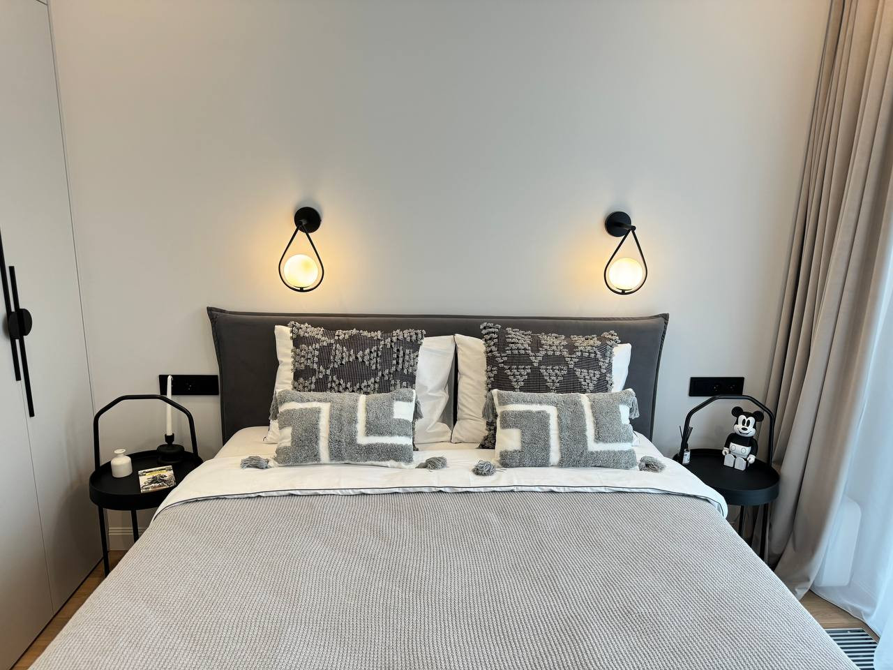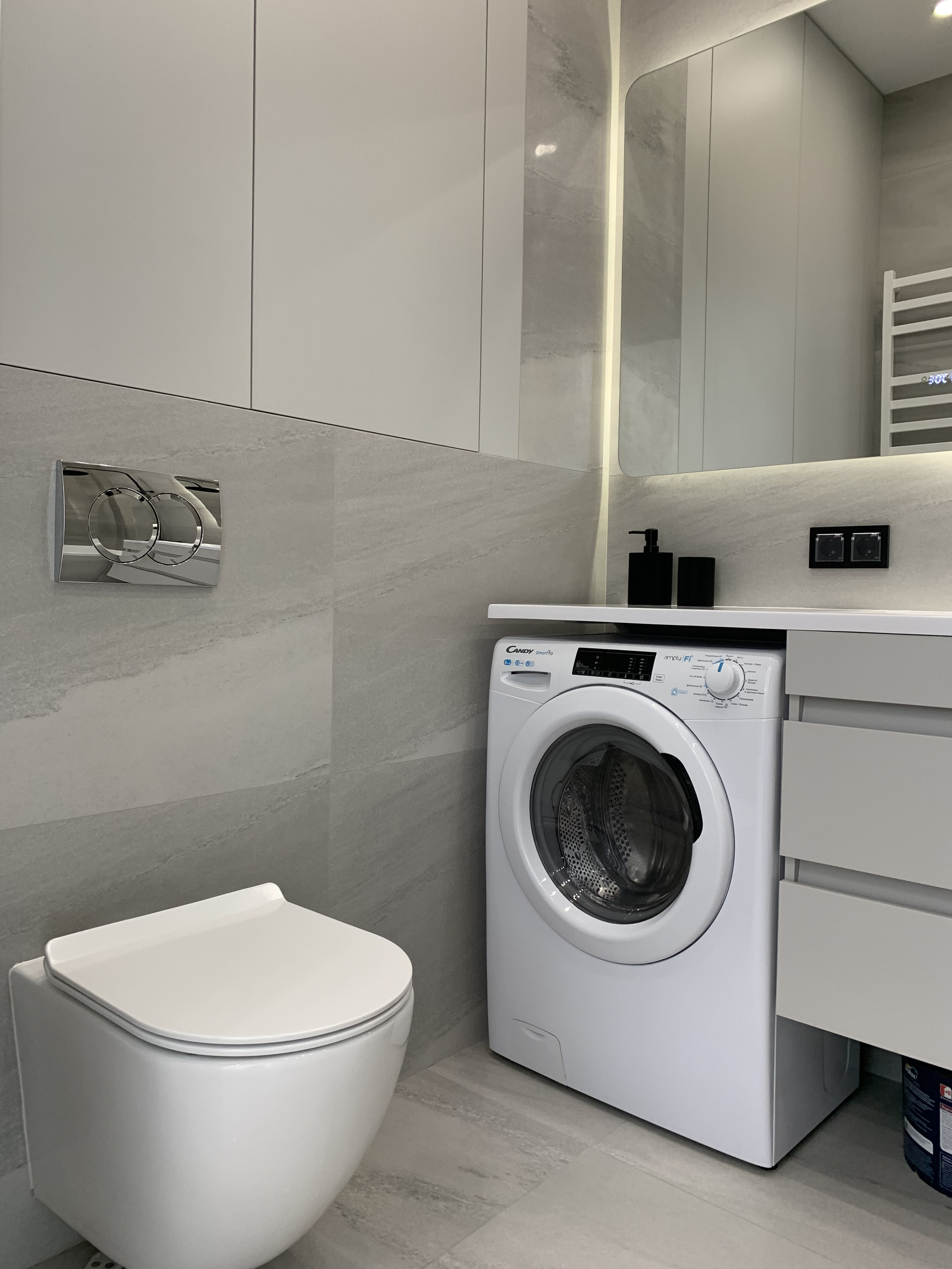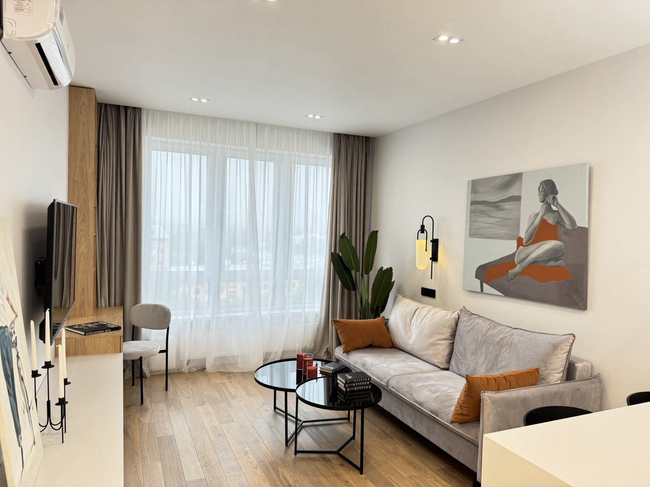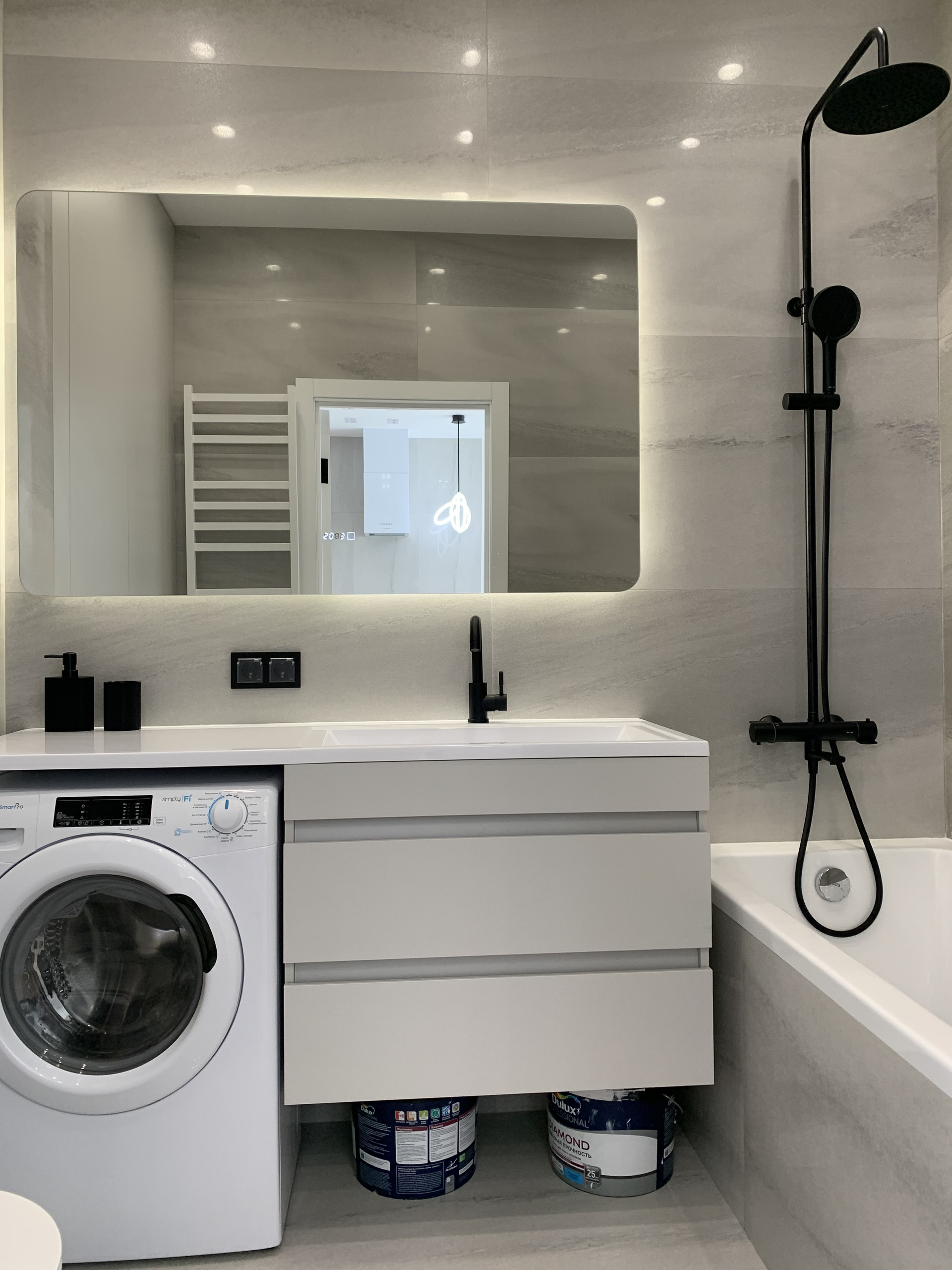 Встроенная кухня со встроенной бытовой техникой: холодильник Gorenje, духовой шкаф с функцией СВЧ, индукционная варочная панель, посудомоечная машина; фильтр для питьевой воды, измельчитель пищевых отходов, вытяжка. Установлены: сплит-система, накопительный бойлер, система от протечек. В гостиной диван раскладывается, телевизор 55 дюймов. Стиральная машина с сушкой в ванной. Теплый пол в прихожей, ванной и на кухне. Два встроенных шкафа: в прихожей и спальне. Пол: инженерная доска, керамогранит.