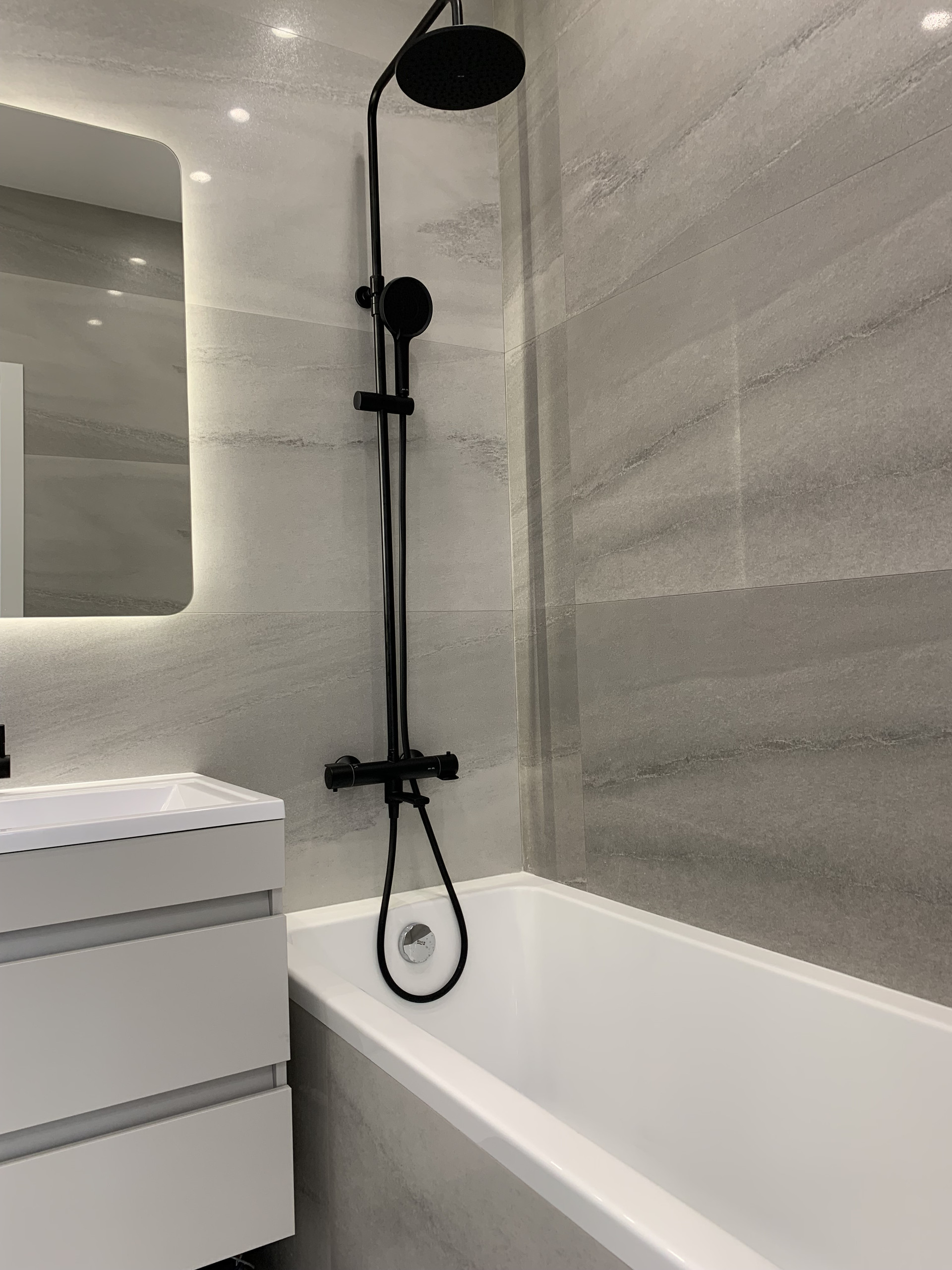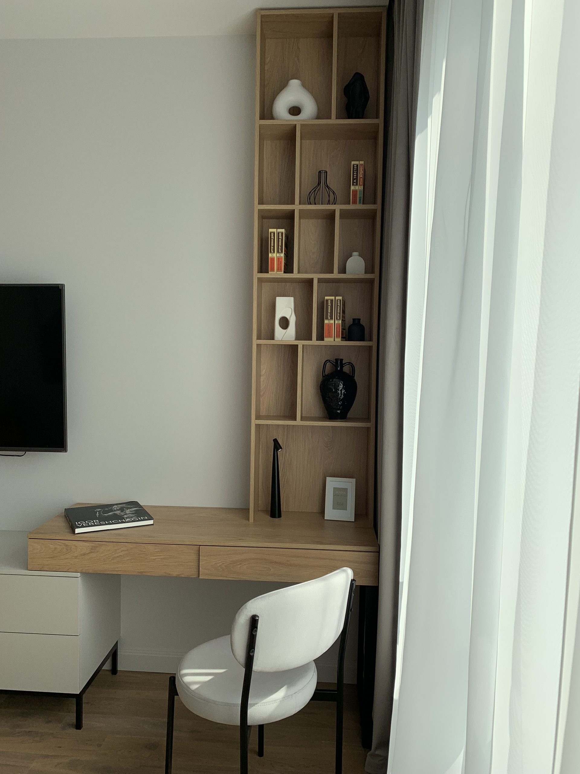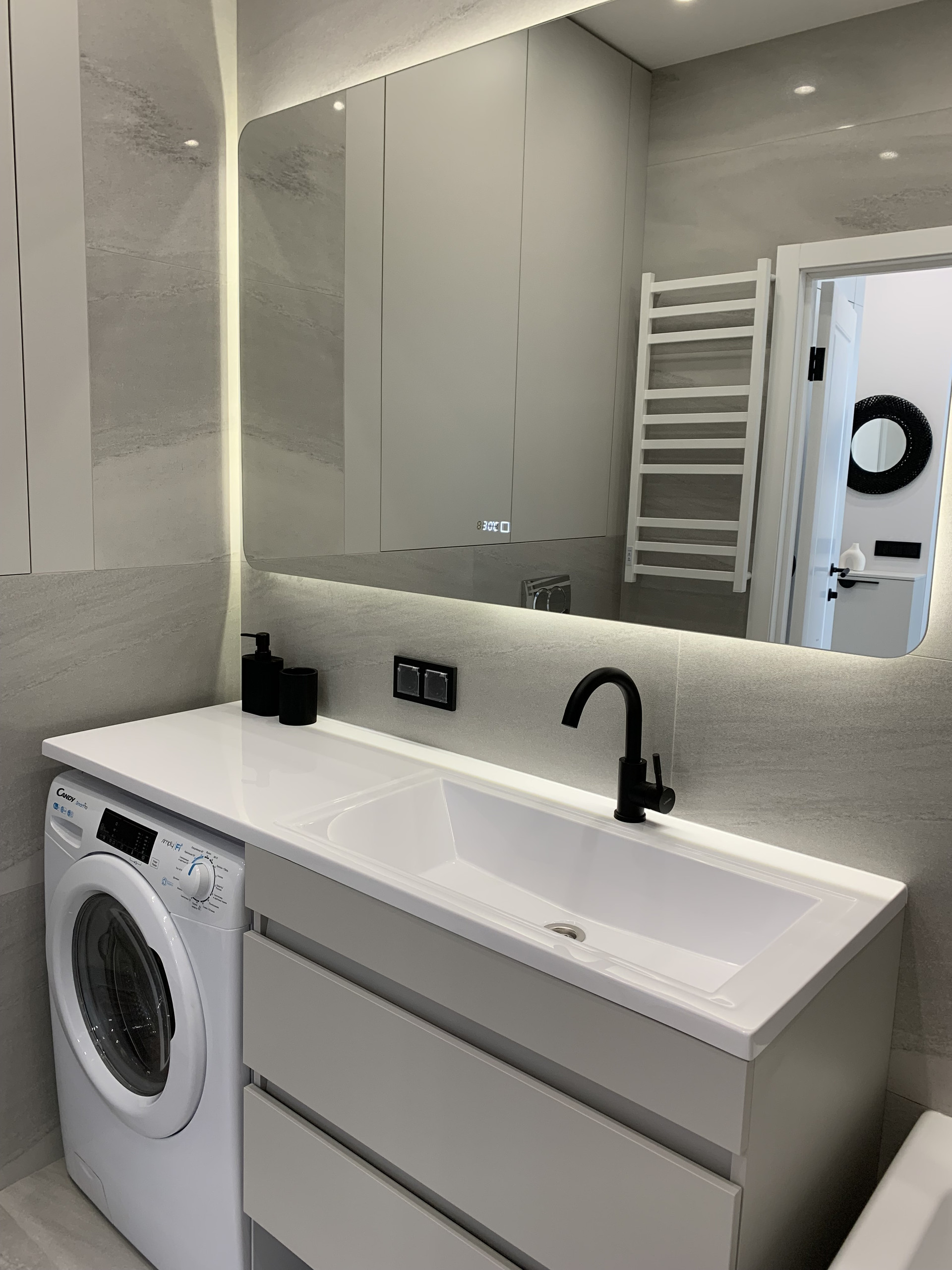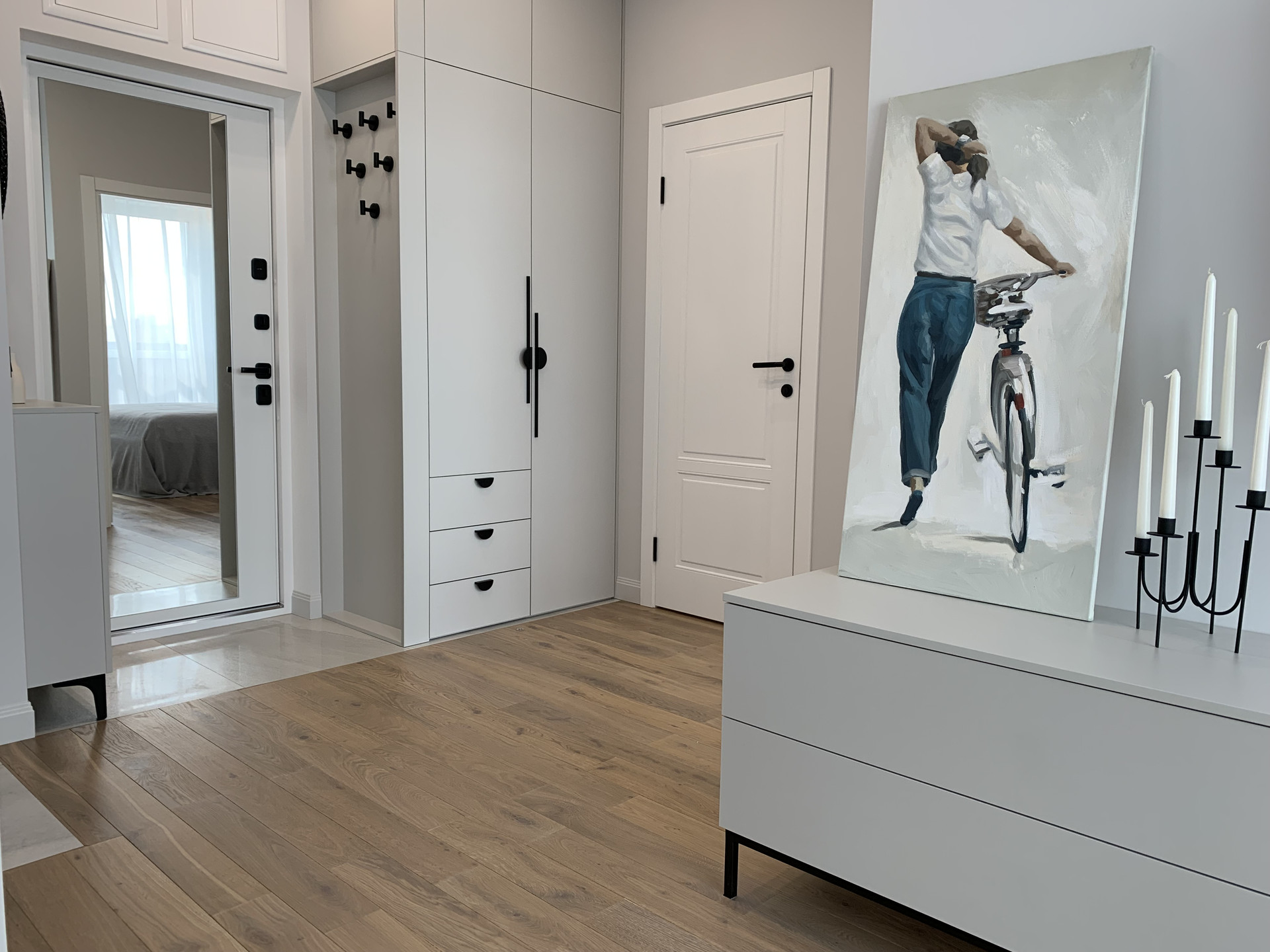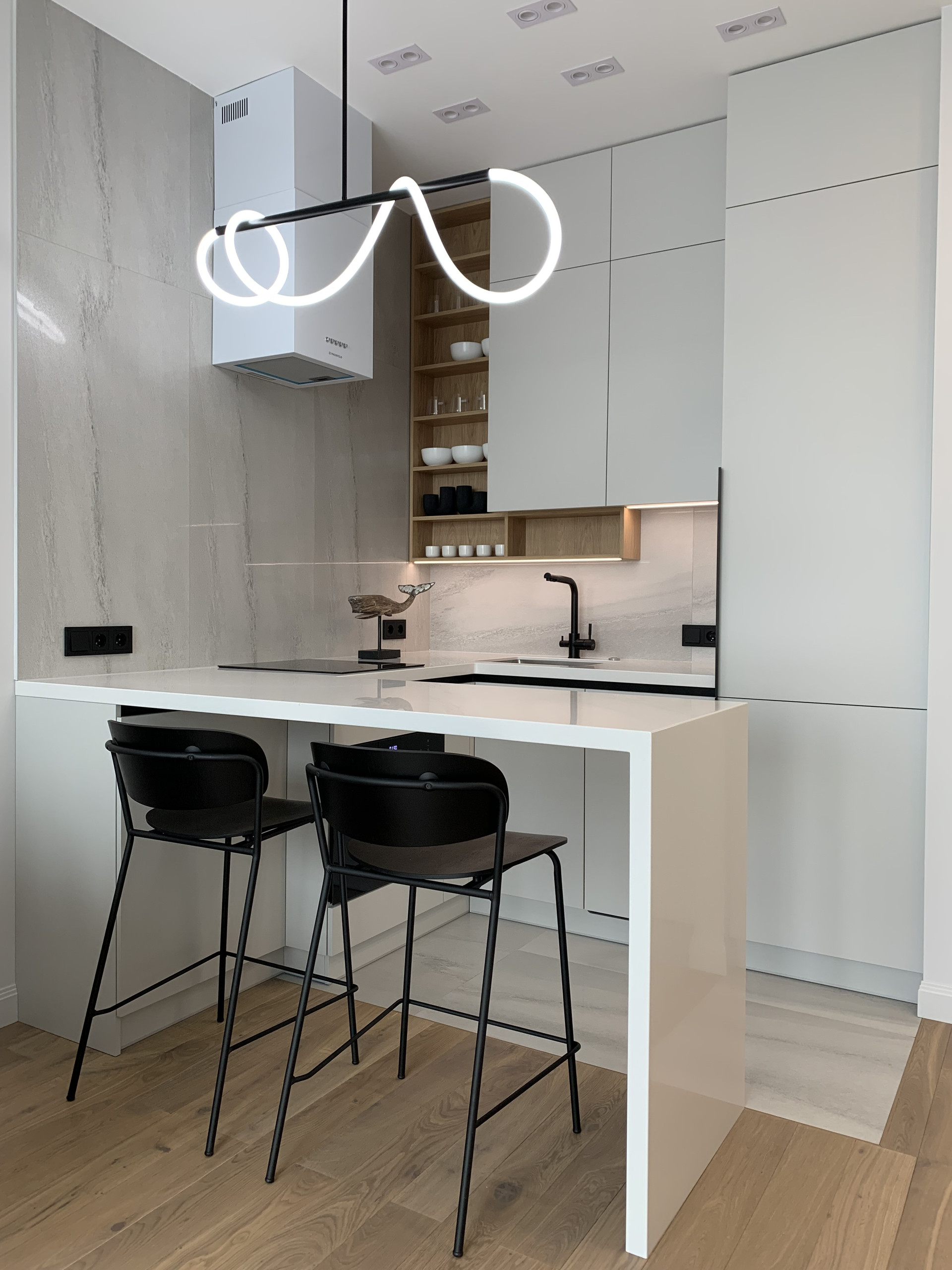 Встроенная кухня со встроенной бытовой техникой: холодильник Gorenje, духовой шкаф с функцией СВЧ, индукционная варочная панель, посудомоечная машина; фильтр для питьевой воды, измельчитель пищевых отходов, вытяжка. Установлены: сплит-система, накопительный бойлер, система от протечек. В гостиной диван раскладывается, телевизор 55 дюймов. Стиральная машина с сушкой в ванной. Теплый пол в прихожей, ванной и на кухне. Два встроенных шкафа: в прихожей и спальне. Пол: инженерная доска, керамогранит.