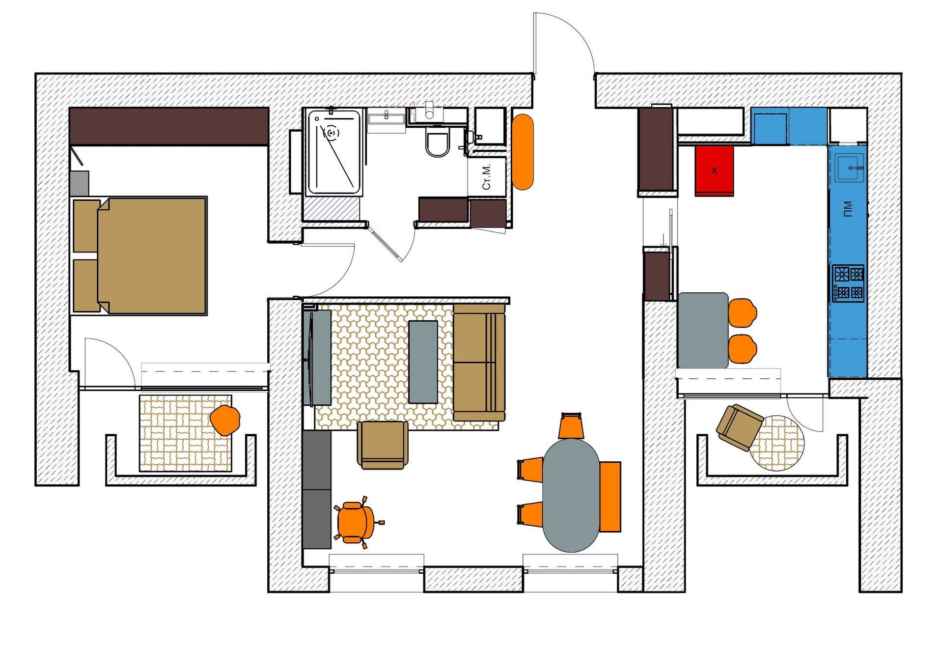 Две лоджии, Совмещенный санузел с тропическим душем в Испанском стиле (См фото и планировку)