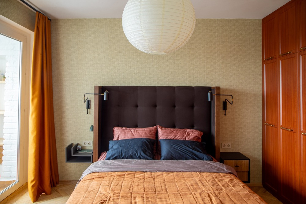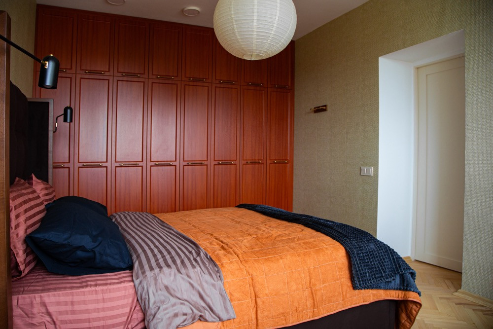 Спальня с кроватью и местами для хранения вещей.