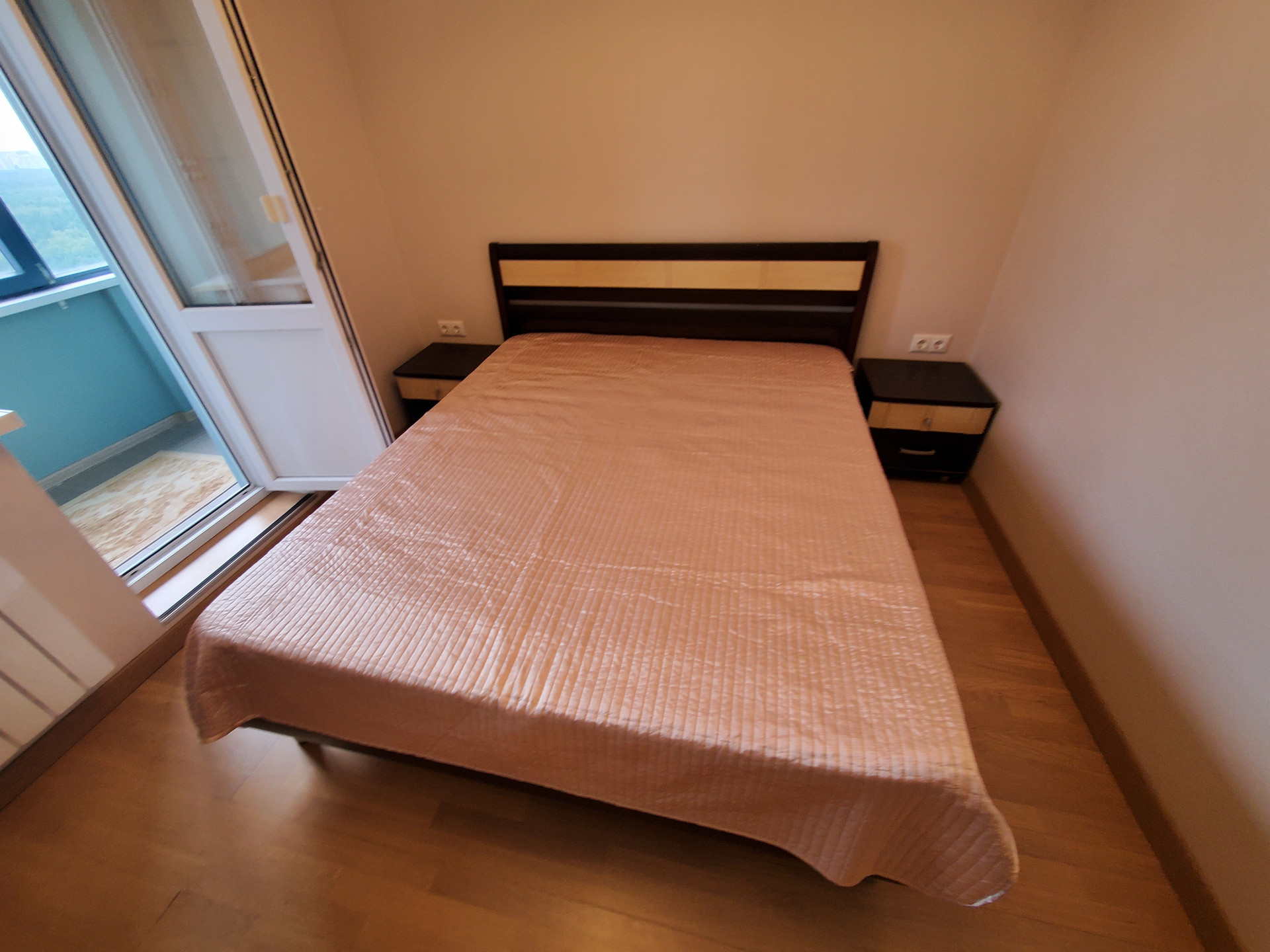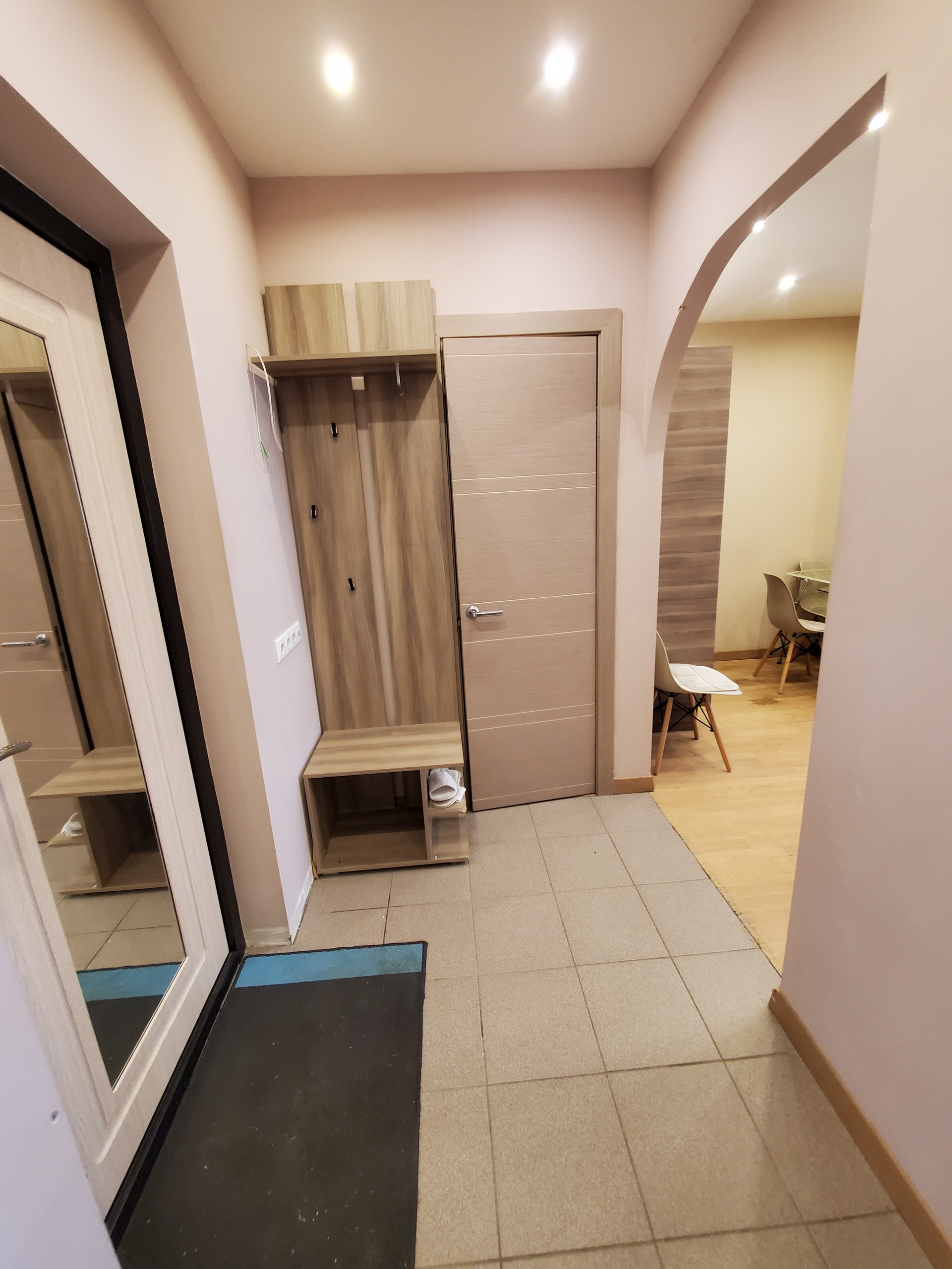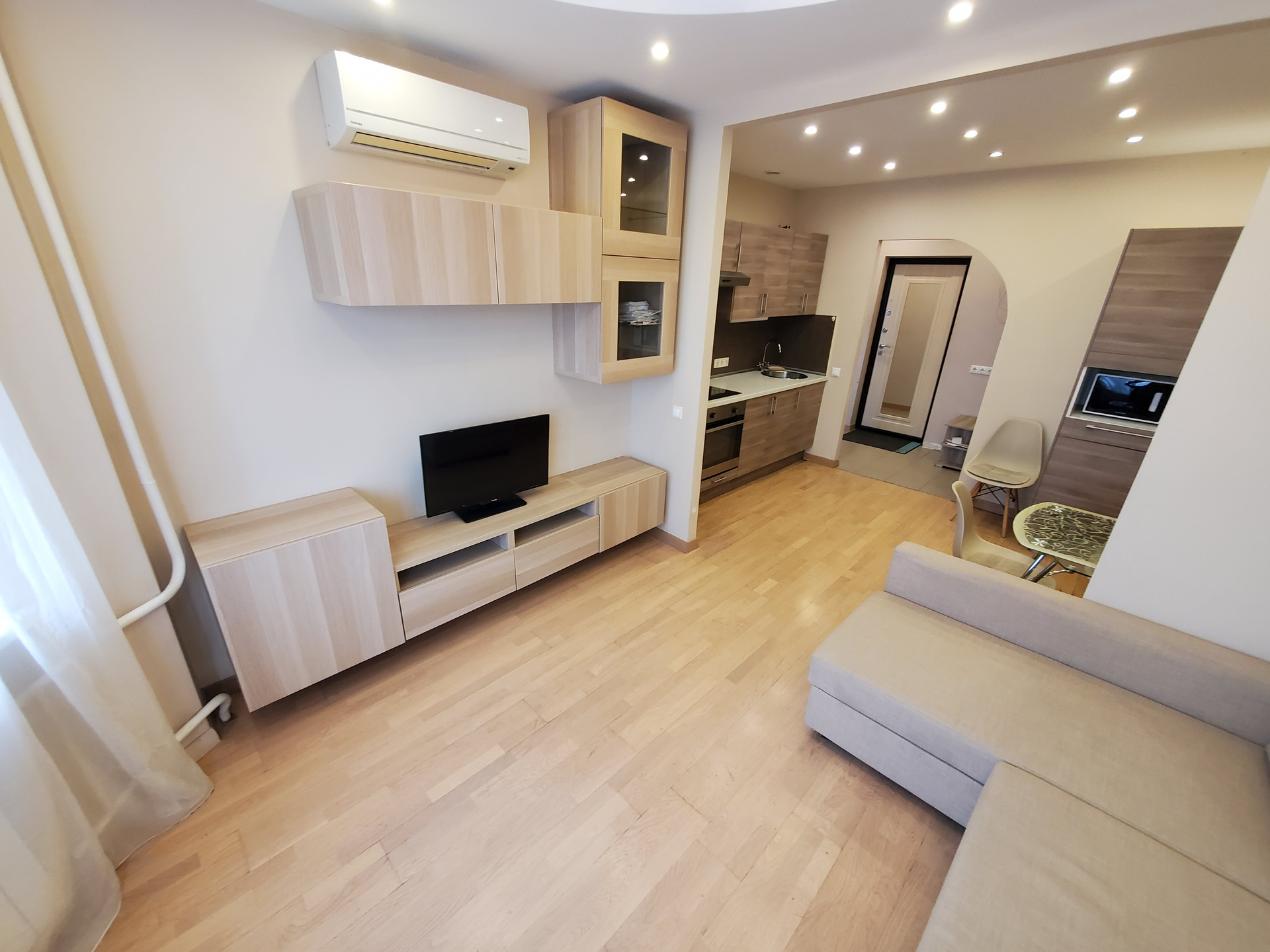 В коридоре есть оборудованная гардеробная комната. Спальная зона в отдельной комнате. Установлены два кондиционера.