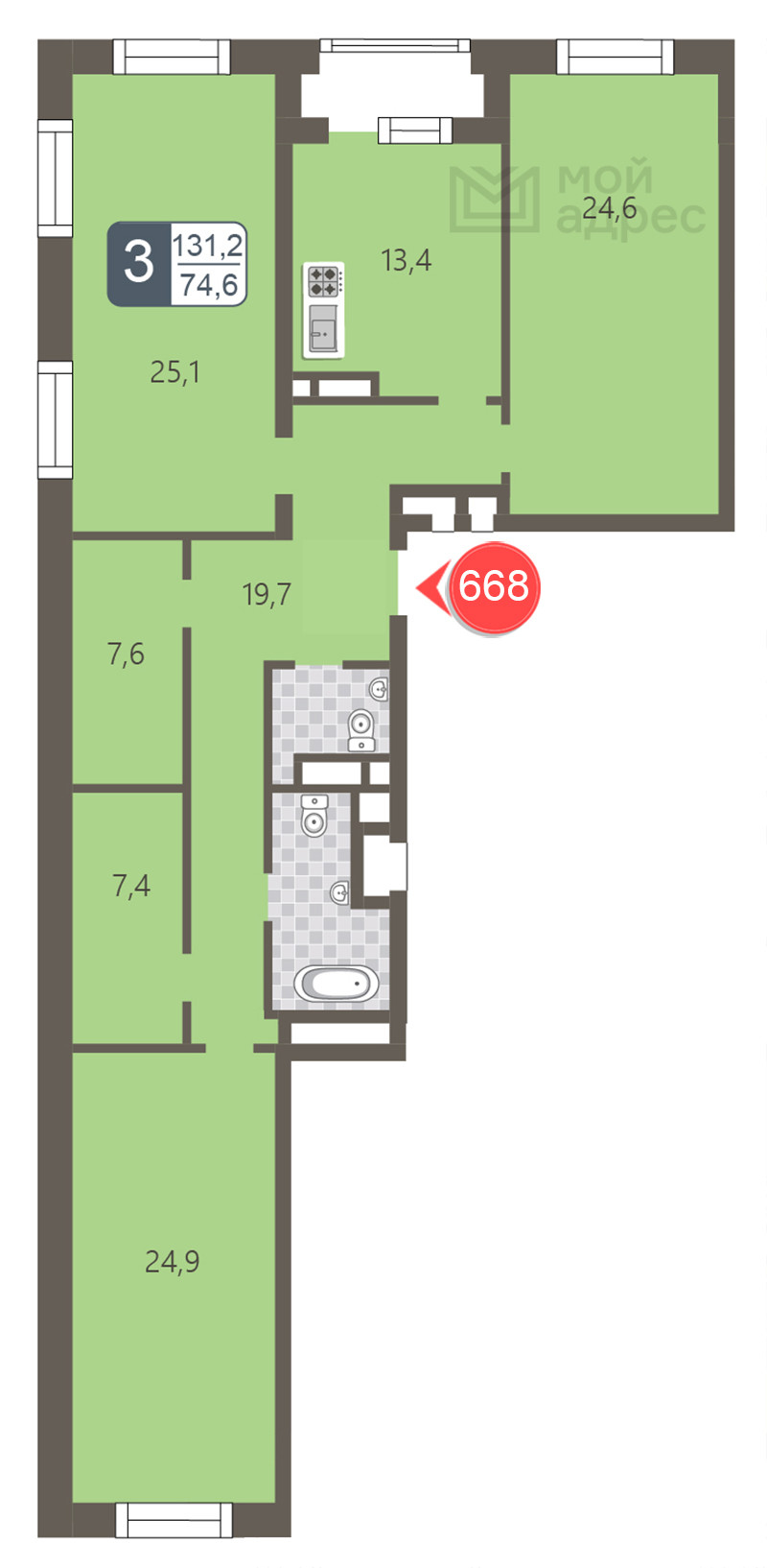 Жилая площадь 74.6 м2