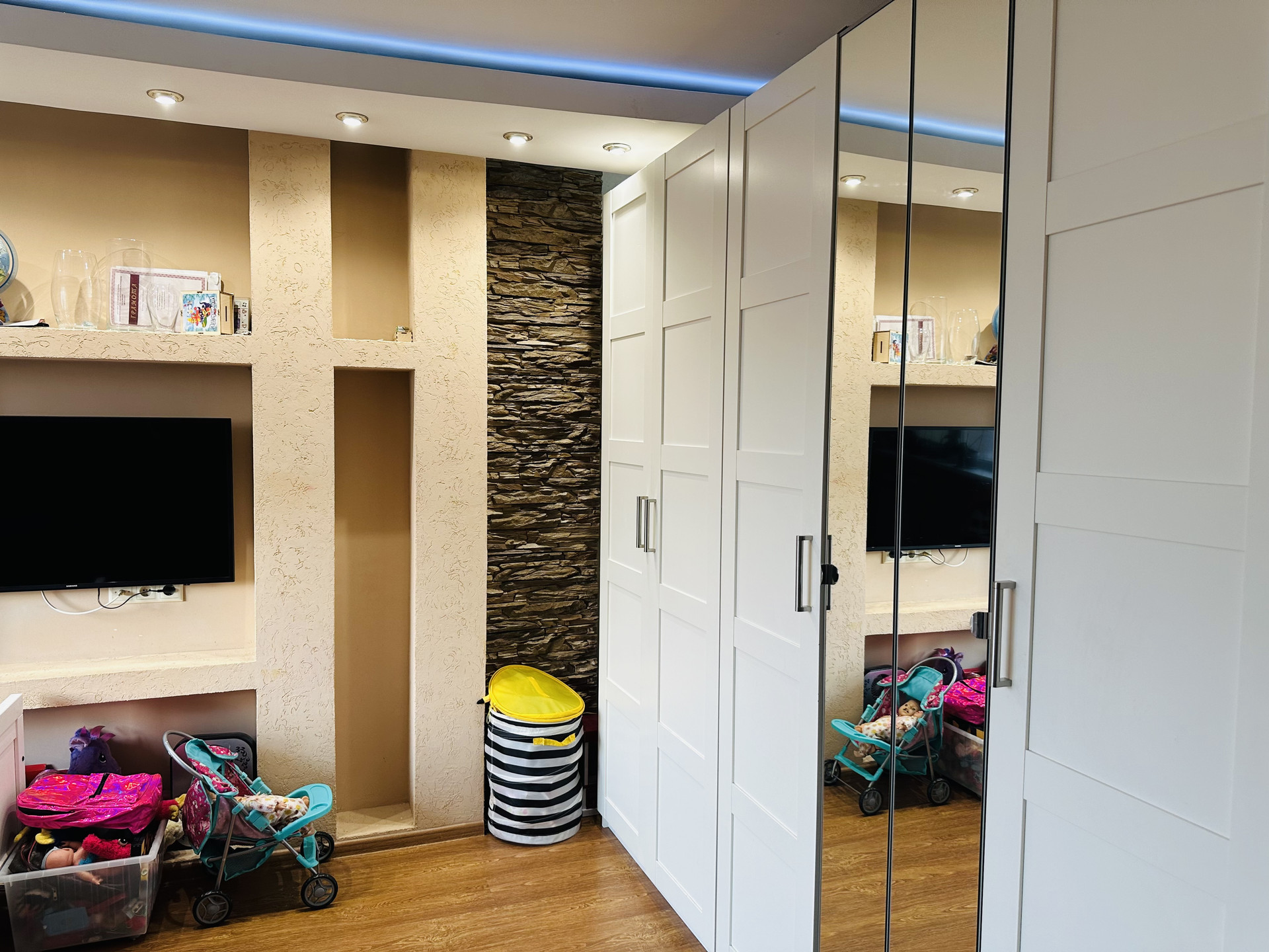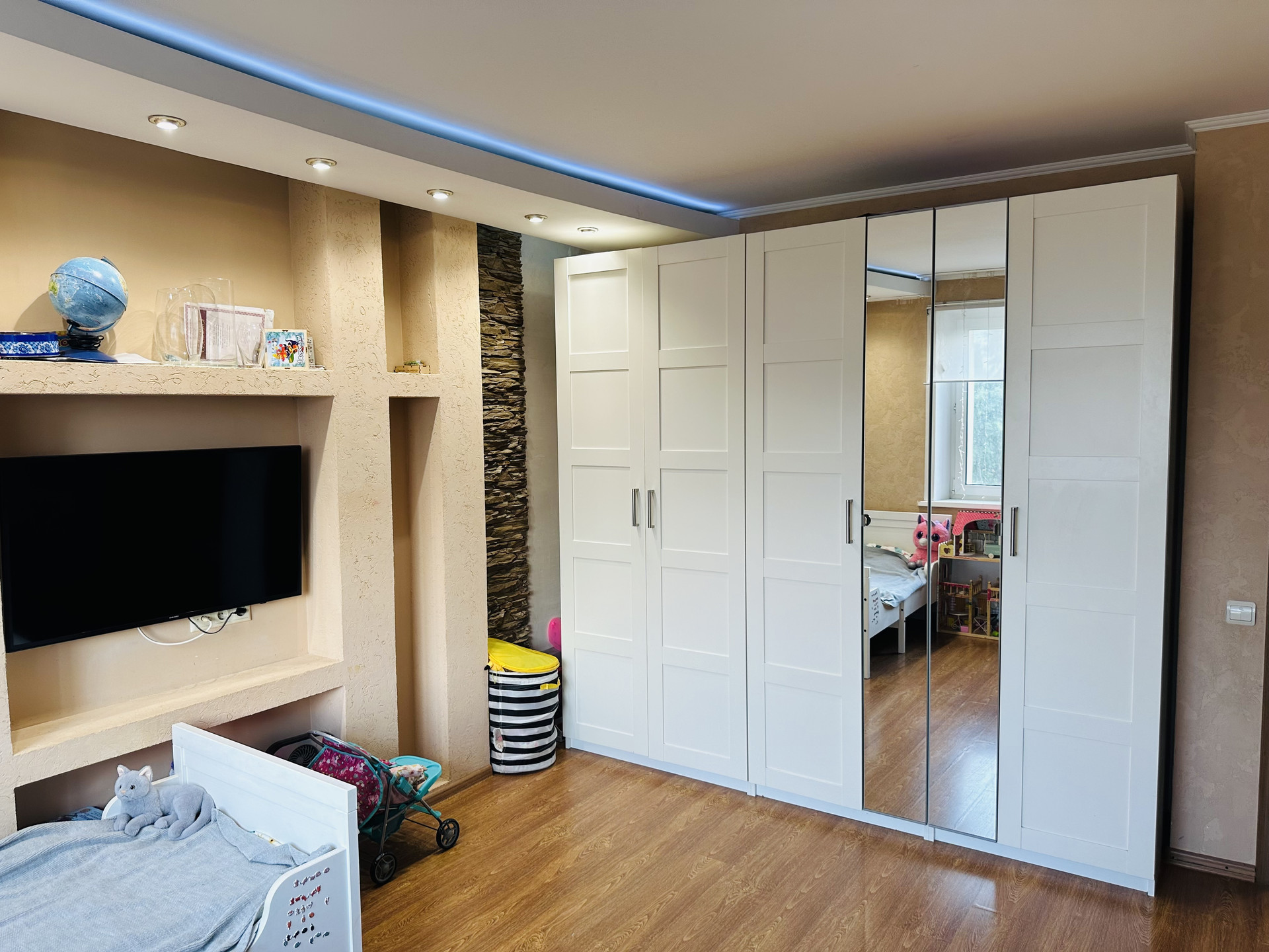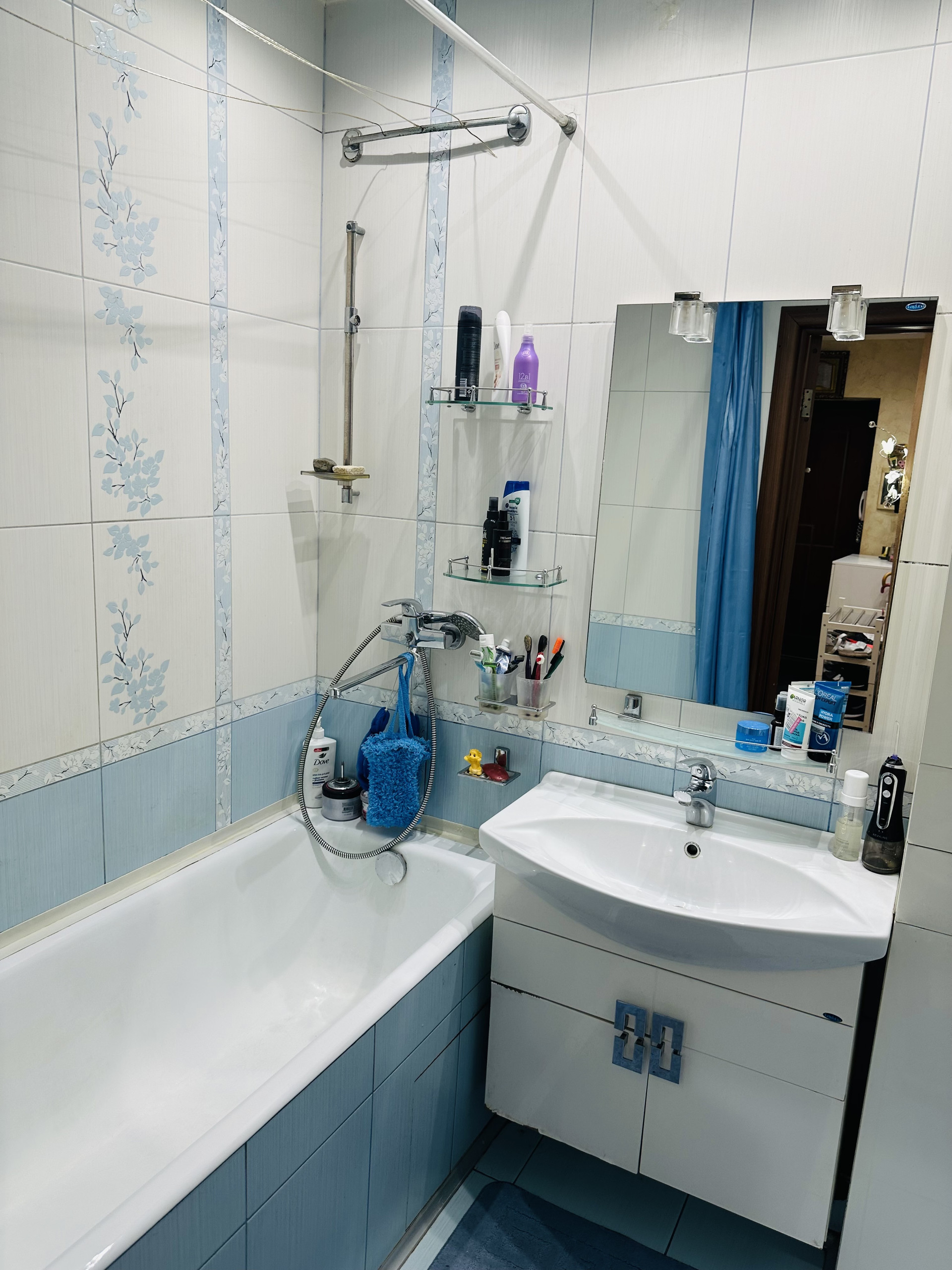 Комнаты раздельные (изолированные) 18 кв.м. и 12,2 кв.м., санузлы раздельные, хорошая сантехника, плитка, счетчики установлены, просторный холл с большим зеркалом, европотолки с подсветкой.