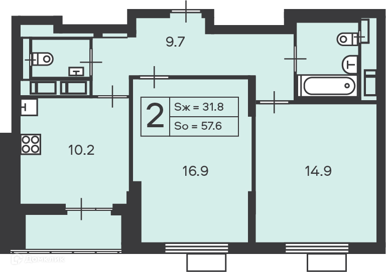 Общая площадь 57.6 м2