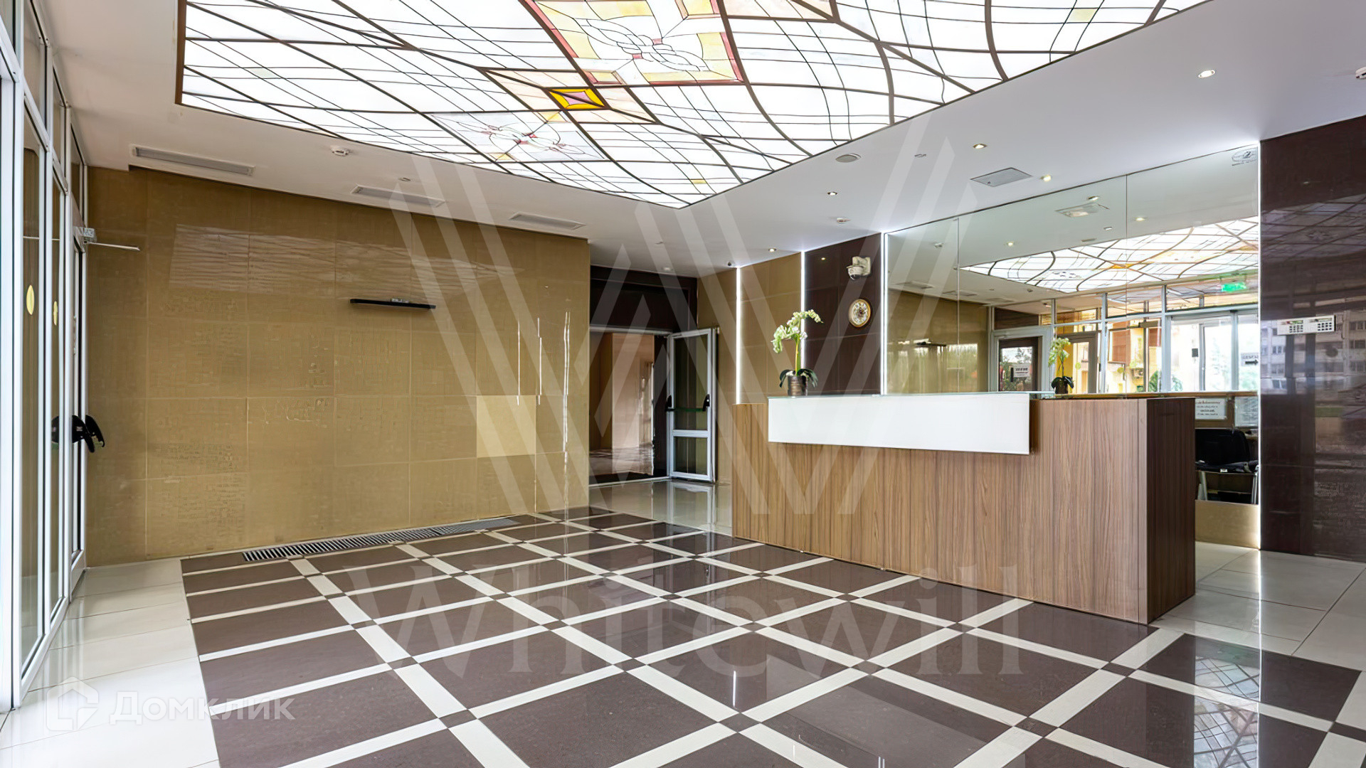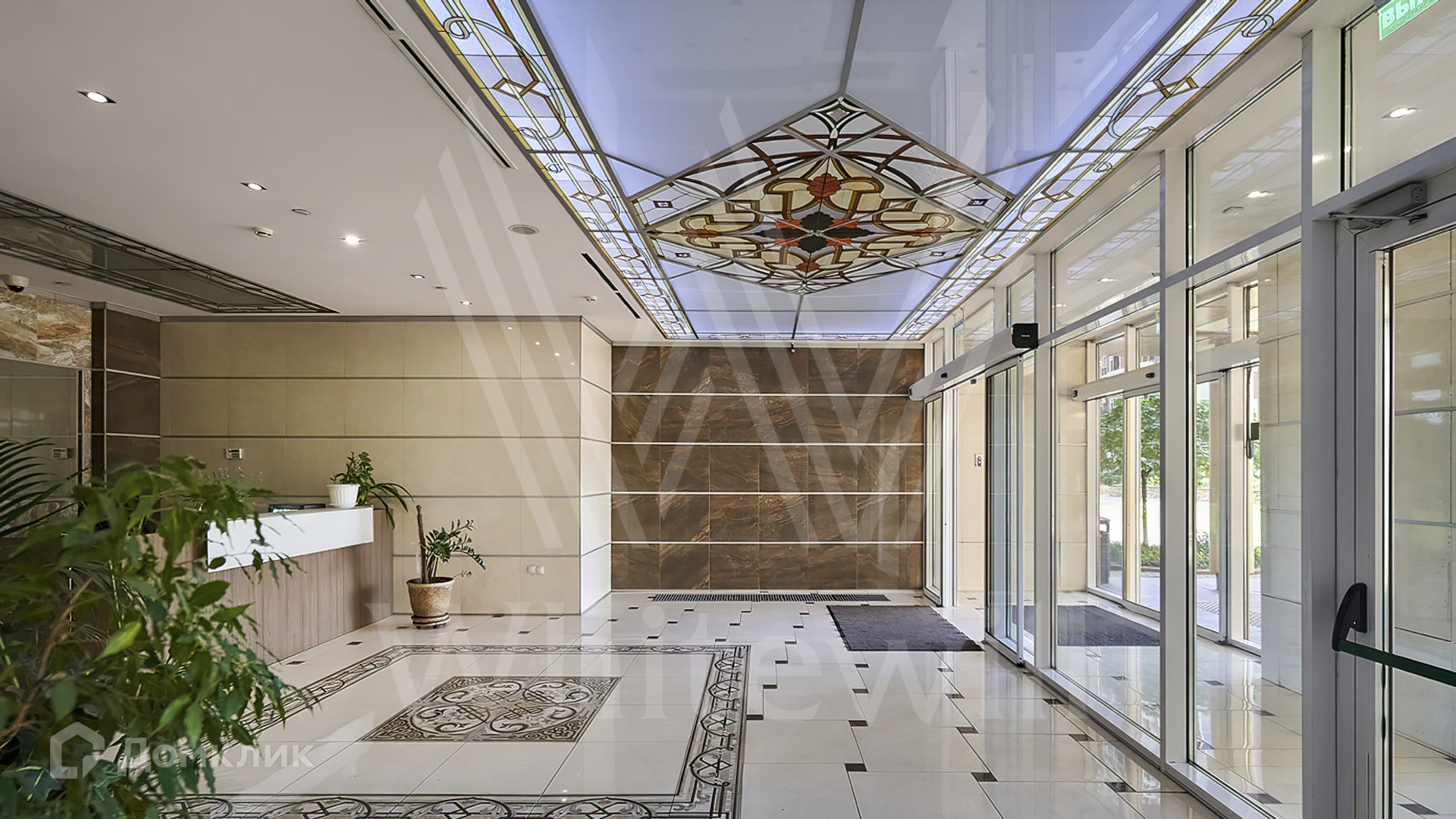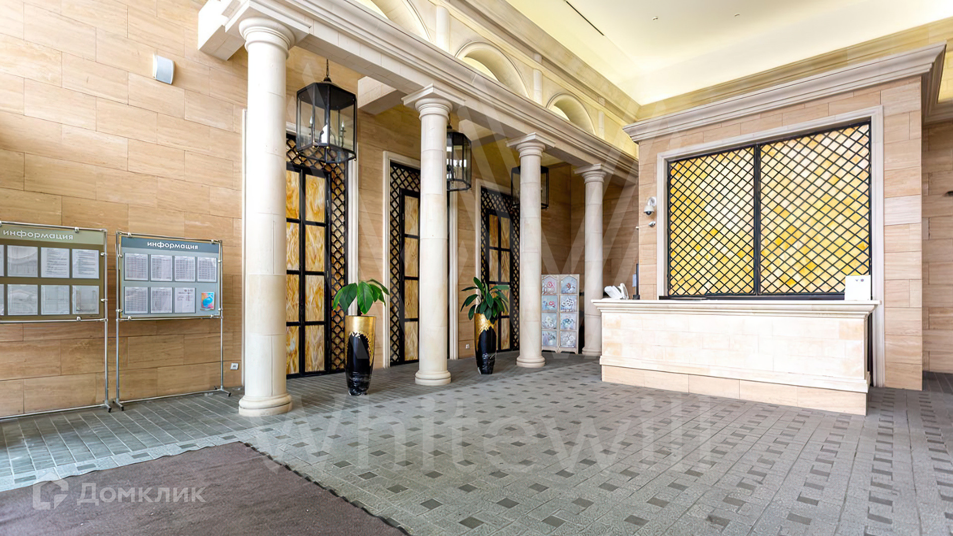 Входные группы комплекса выполнены в классическом стиле и оформлены в песочных тонах с использованием премиальных материалов — натуральный камень, мрамор, элементы из ценных пород дерева. Дополнительным украшением лобби выступают колонны и витражные потолки. В доме работает консьерж-сервис, а также предусмотрены лаундж-зоны, где можно отдохнуть или провести переговоры.