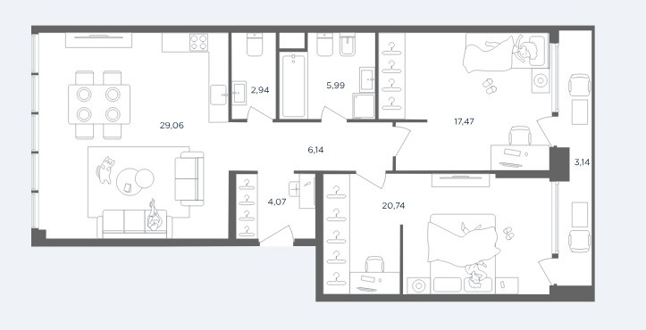 Шикарная уникальная  планировка квартиры !  Общая площадь 86,41 кв.м,  просторная кухня гостиная  29,06  кв.м; две спальни  20,74 и 17,47 кв.м;  два сан узла, гардеробная.