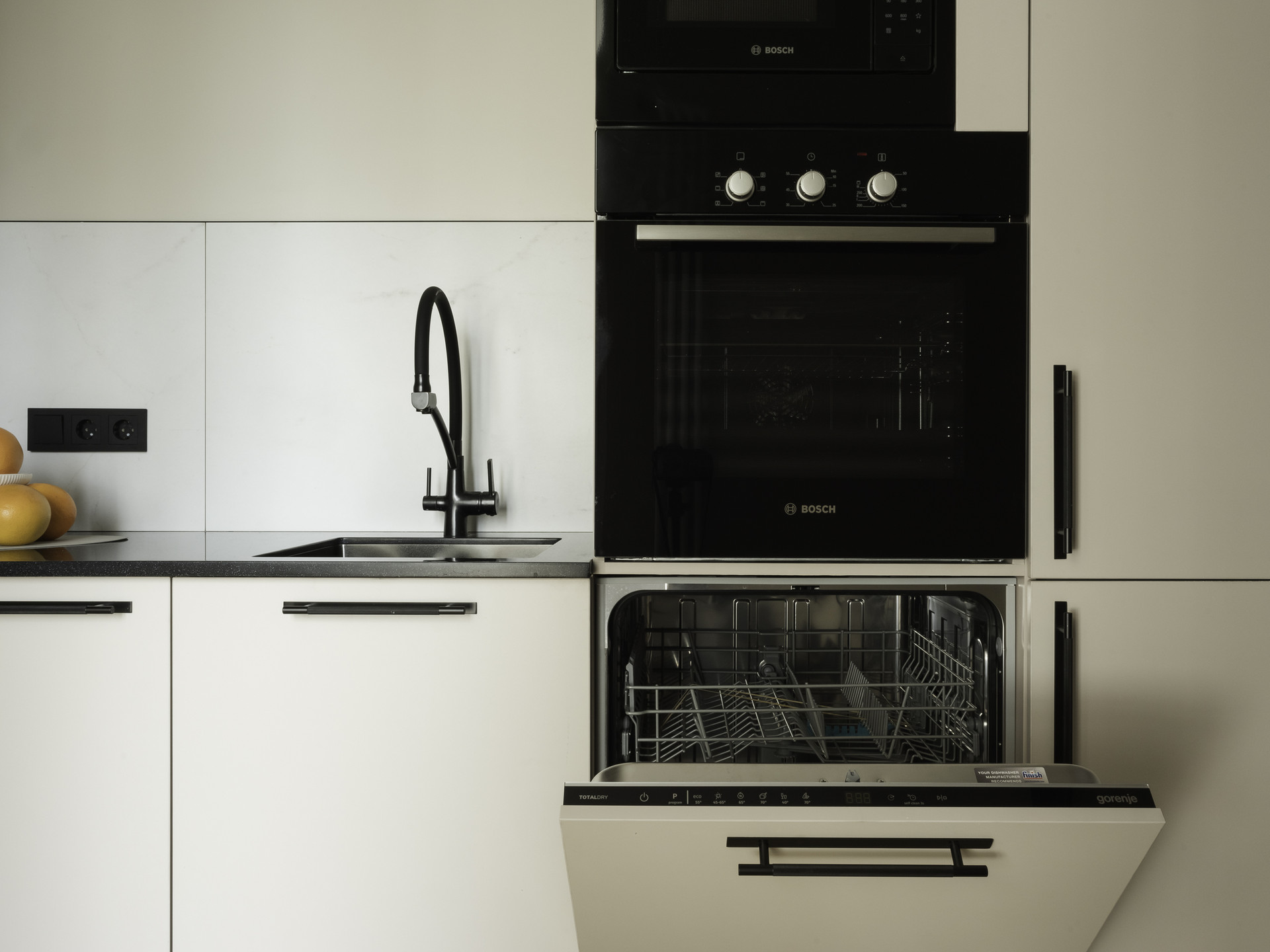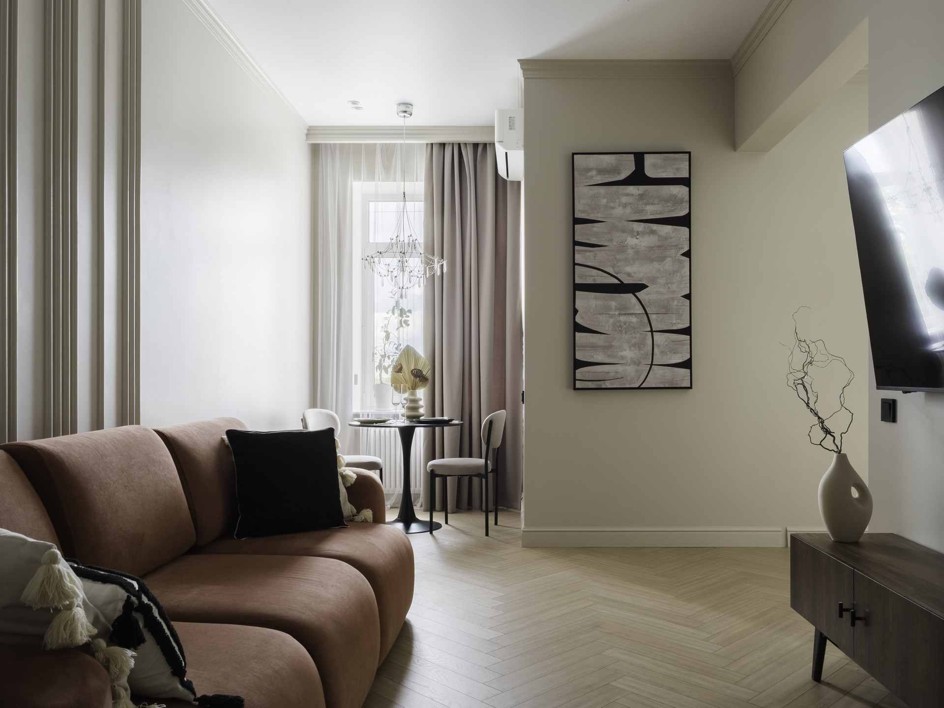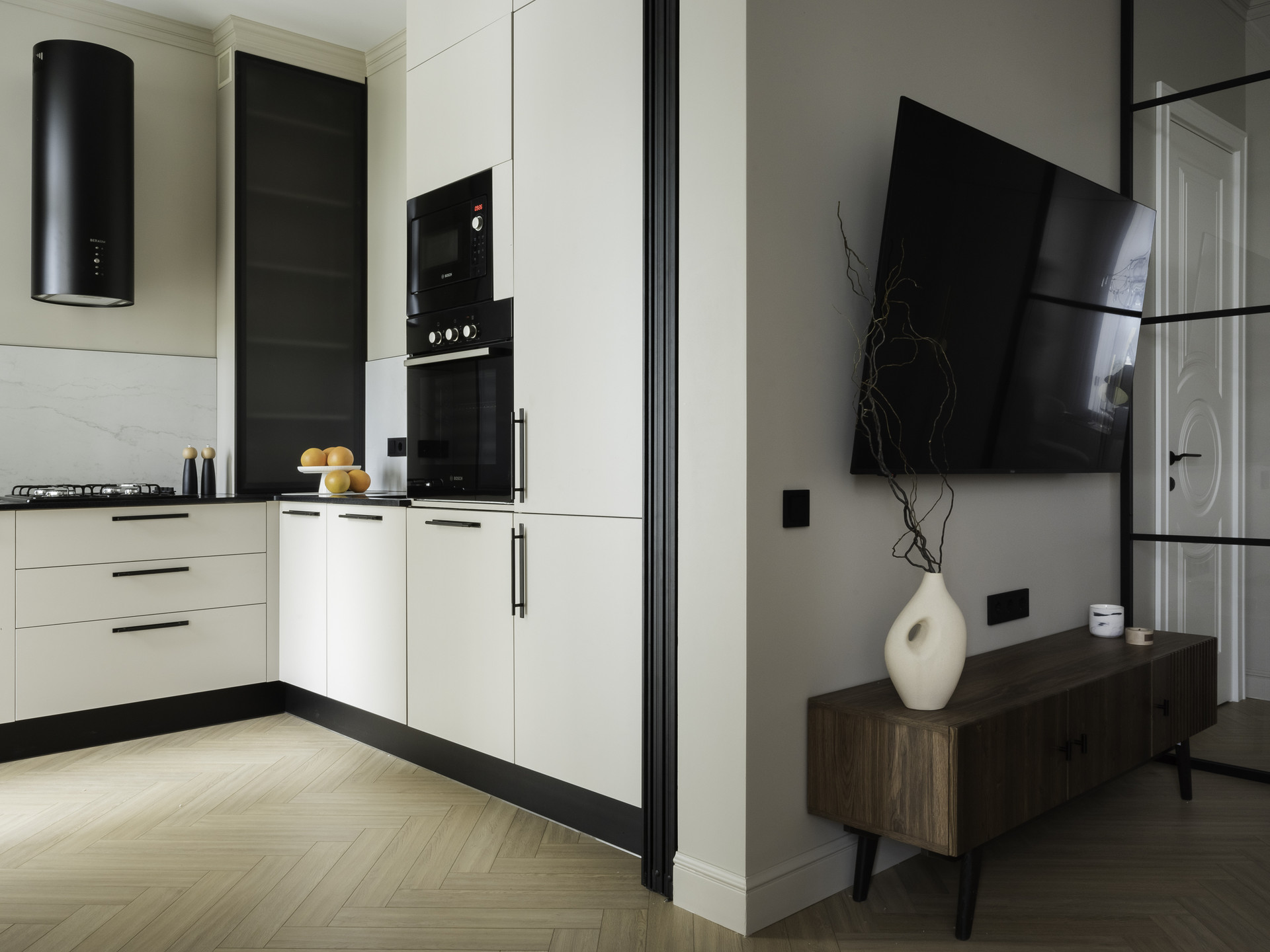 Пространство зонировано на гостиную 17 кв. м с большим диваном, телевизором, обеденной зоной; спальню 13,5 кв. м с большой двухместной кроватью, гардеробной и видовым летним балконом; кухню 7,3 кв.м, оборудованную встроенной техникой лучших брендов (варочная панель, вытяжка, духовой шкаф, микроволновая печь фирмы Bosch, посудомоечная машина и встроенный холодильник с морозильной камерой фирмы Gorenje), системой фильтрации и очистки воды, с панорамным остеклением и балконом, большой совмещенный санузел с постирочной, в которой установлены стиральная и сушильная машины фирмы Bosch, и хозяйственной зоной; и просторный коридор с местами хранения. Потолки 3 метра.