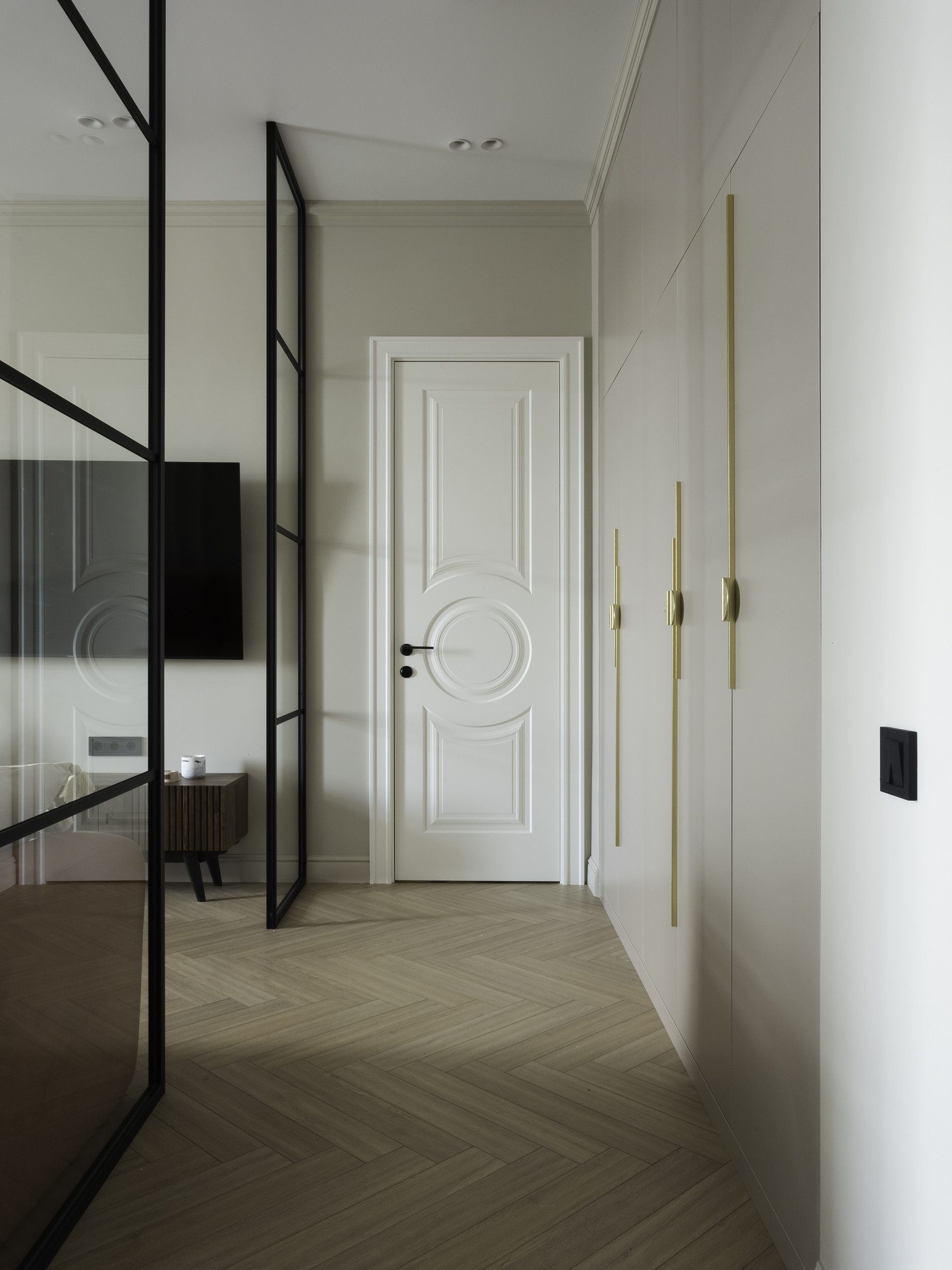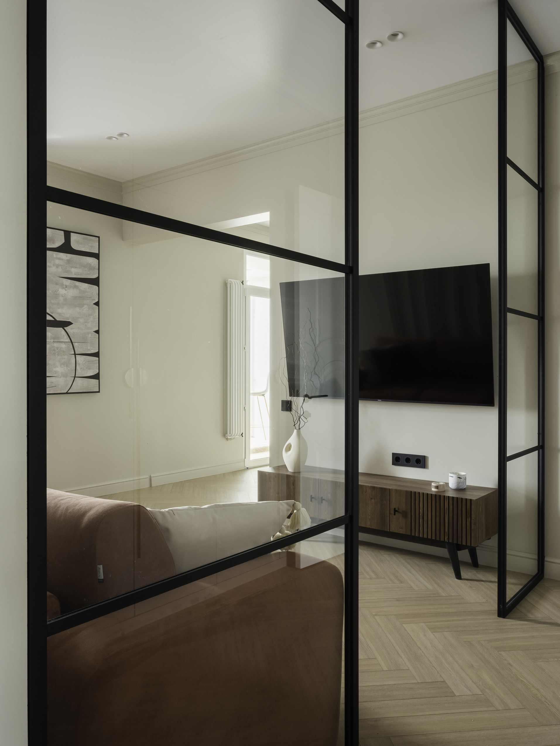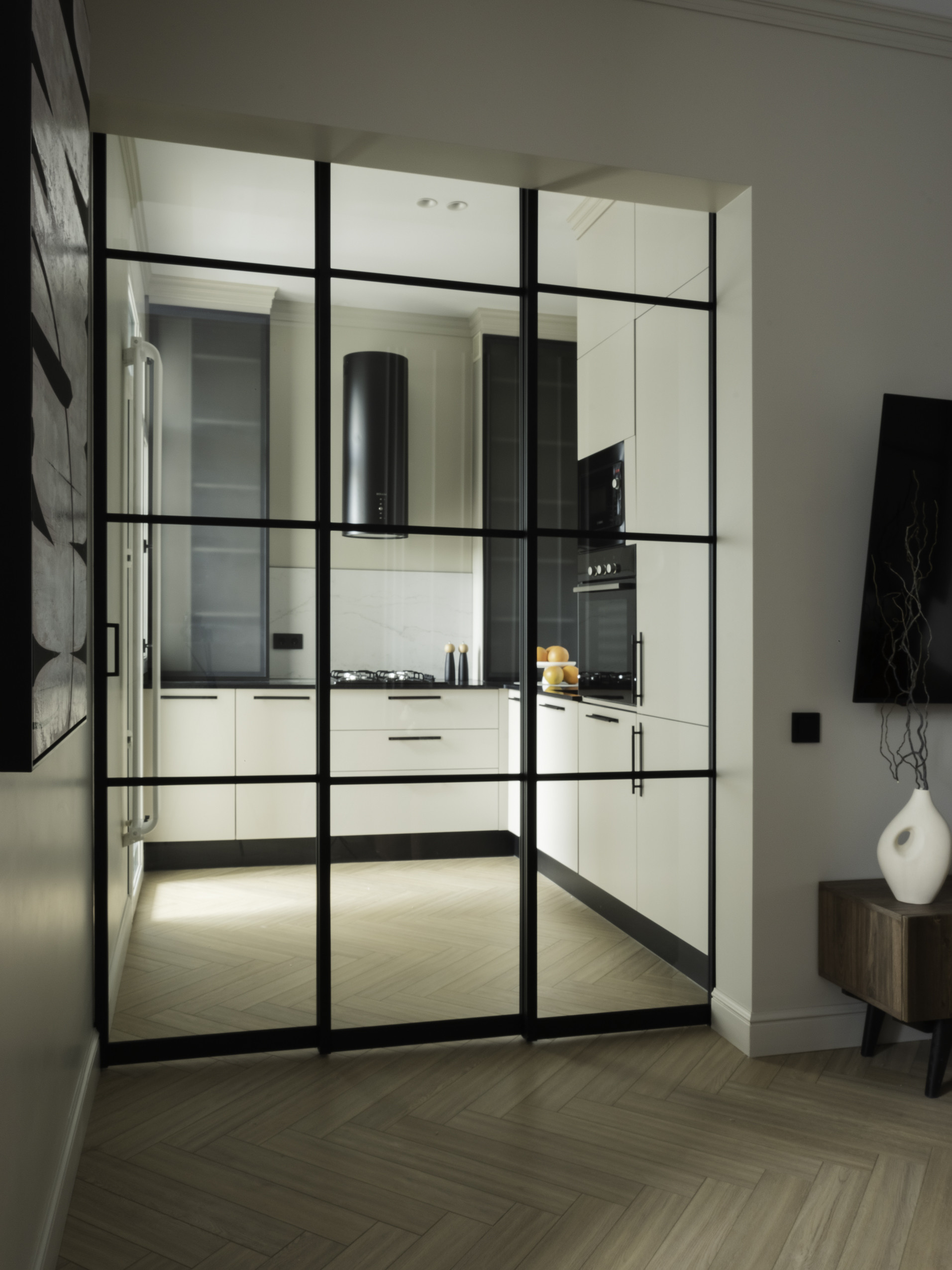 Пространство зонировано на гостиную 17 кв. м с большим диваном, телевизором, обеденной зоной; спальню 13,5 кв. м с большой двухместной кроватью, гардеробной и видовым летним балконом; кухню 7,3 кв.м, оборудованную встроенной техникой лучших брендов (варочная панель, вытяжка, духовой шкаф, микроволновая печь фирмы Bosch, посудомоечная машина и встроенный холодильник с морозильной камерой фирмы Gorenje), системой фильтрации и очистки воды, с панорамным остеклением и балконом, большой совмещенный санузел с постирочной, в которой установлены стиральная и сушильная машины фирмы Bosch, и хозяйственной зоной; и просторный коридор с местами хранения. Потолки 3 метра.