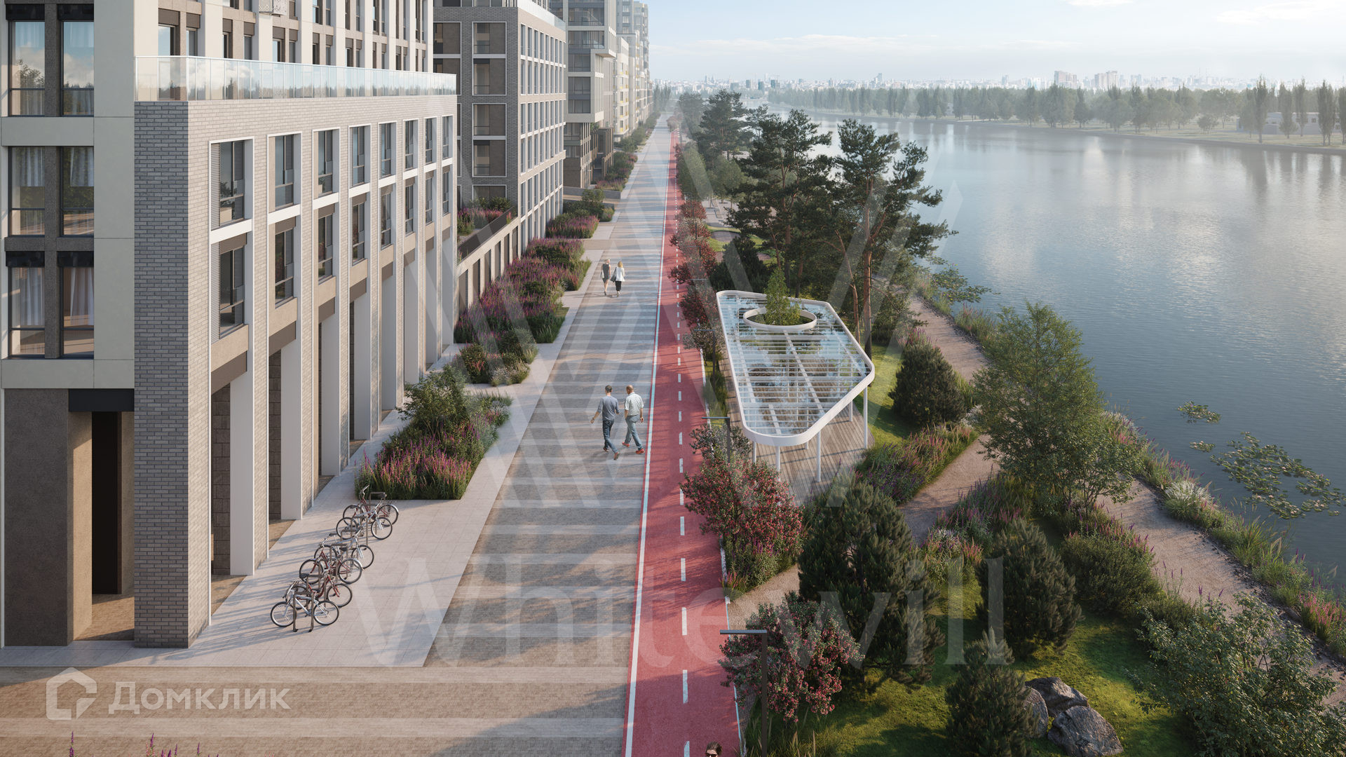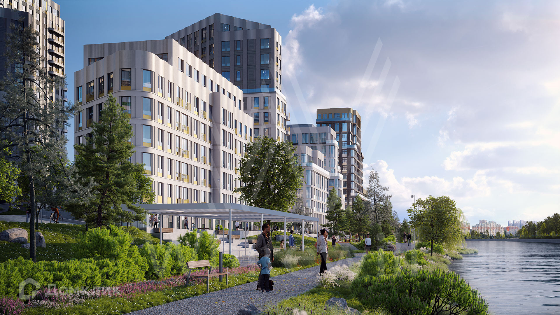 Дома квартала сгруппировали в четыре блока и соединили озелененными бульварами. Двор каждого блока закрыт для машин и посторонних. В каждом дворе обустроили детские игровые площадки. Территорию набережной облагородили — высадили зеленые кустарники и деревья, организовали прогулочные и спортивные дорожки, места для отдыха с беседками и качелями. Здесь будут проходить общественные мероприятия и дружеские вечера, обеды на траве и романтические прогулки, медитации под плеск волн и догонялки с детьми.