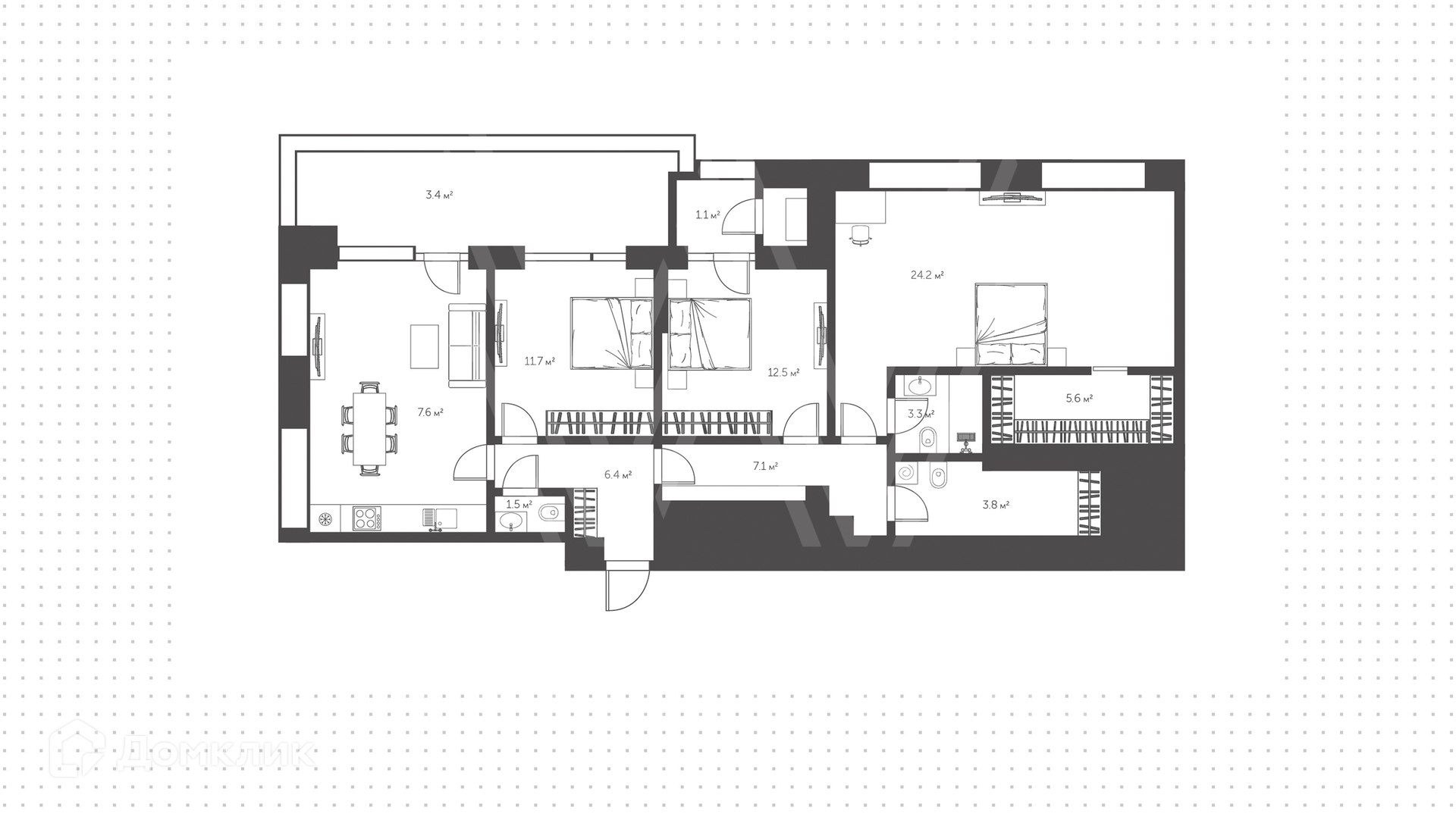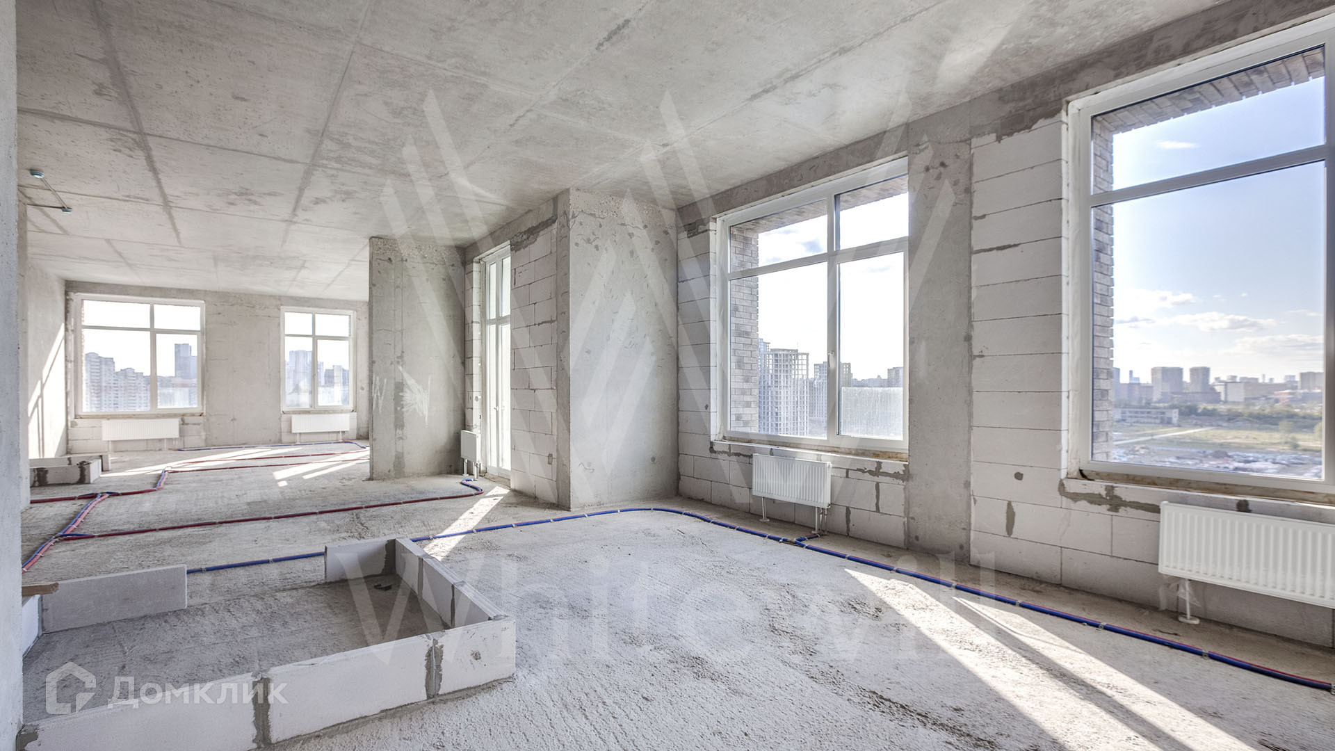 Квартира со свободной планировкой расположена на 12-м этаже. Возможная планировка: кухня-гостиная, мастер-спальня с собственной гардеробной и ванной, вторая спальня, гостевой санузел, холл.