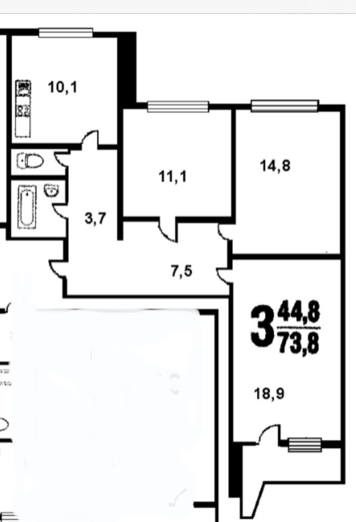 Общая площадь квартиры, без учета лоджии - 73,4 кв.м.