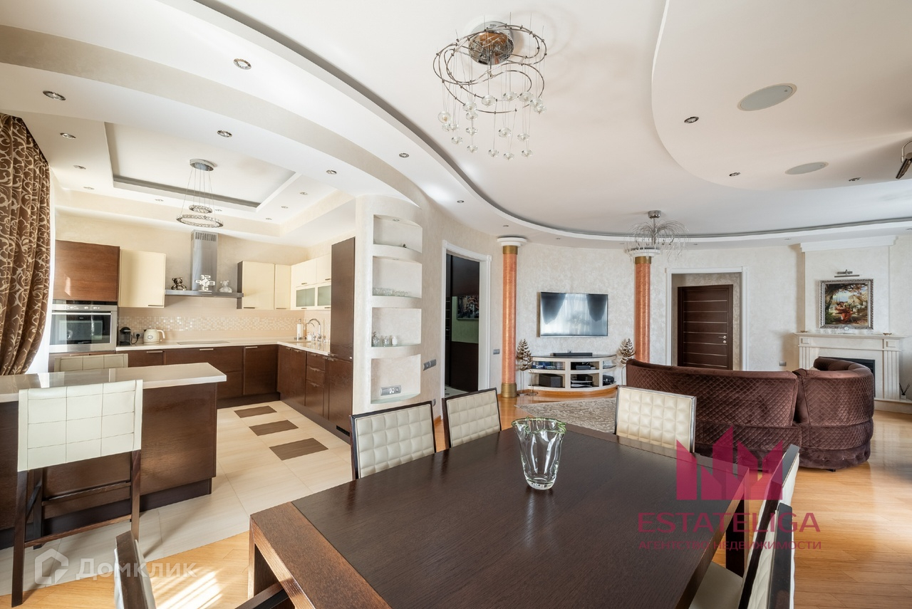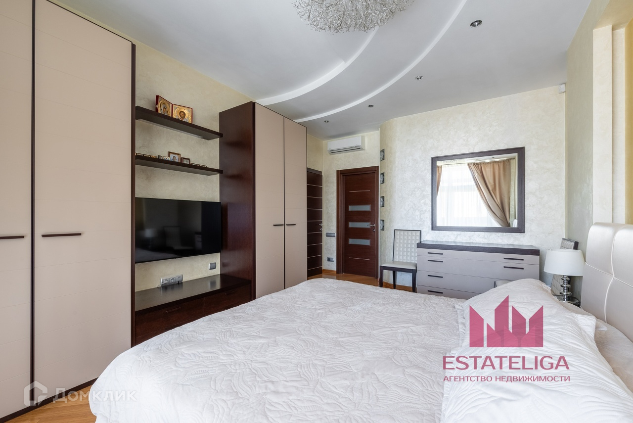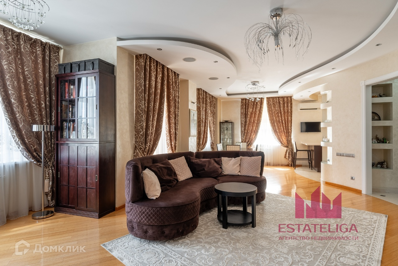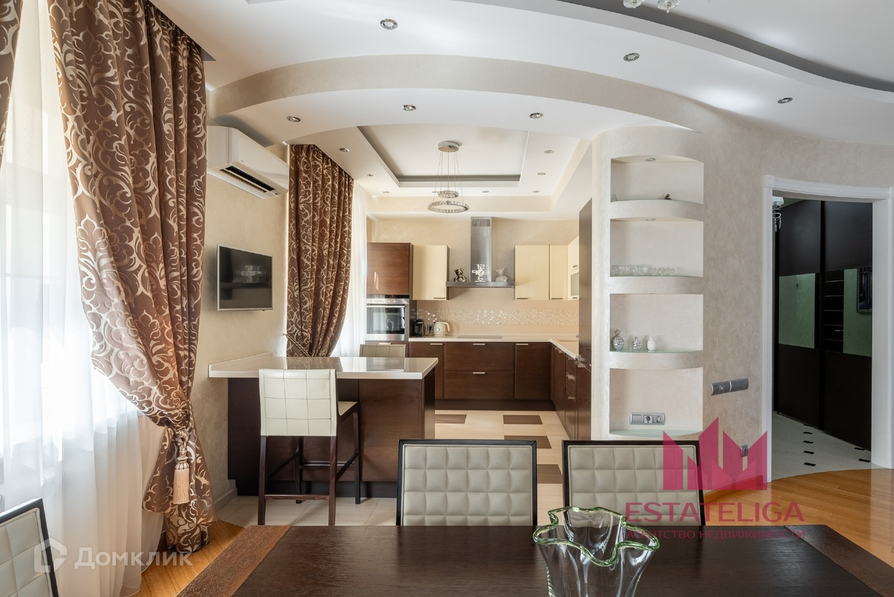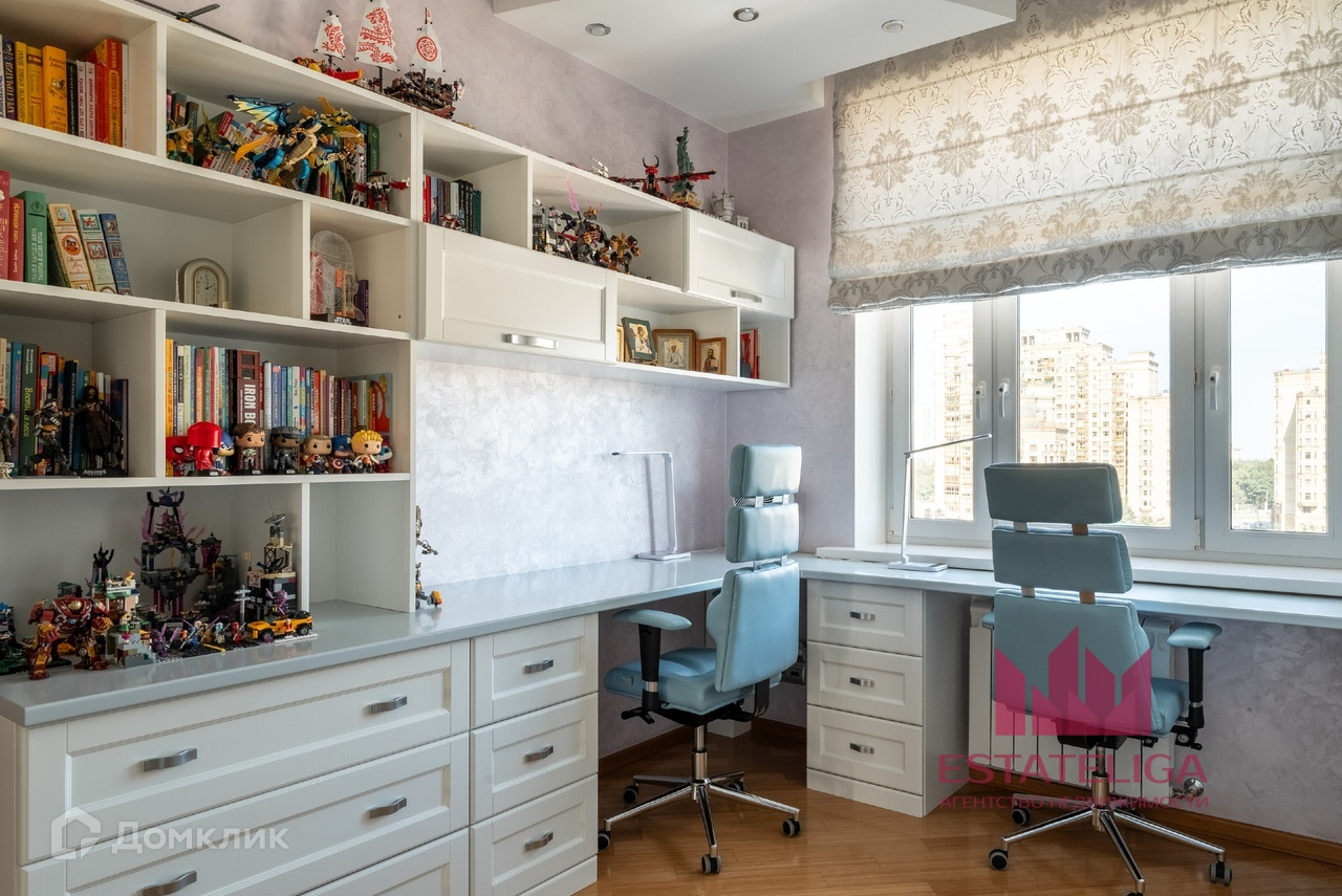 Квартира отличается удобной планировкой и включает в себя две просторные спальни, большую кухню, совмещенную с гостиной, два санузла и вместительную гардеробную. В гостиной, оформленной в современном стиле, установлены шесть окон, которые открывают захватывающий вид на МГУ и часть окон во двор.
