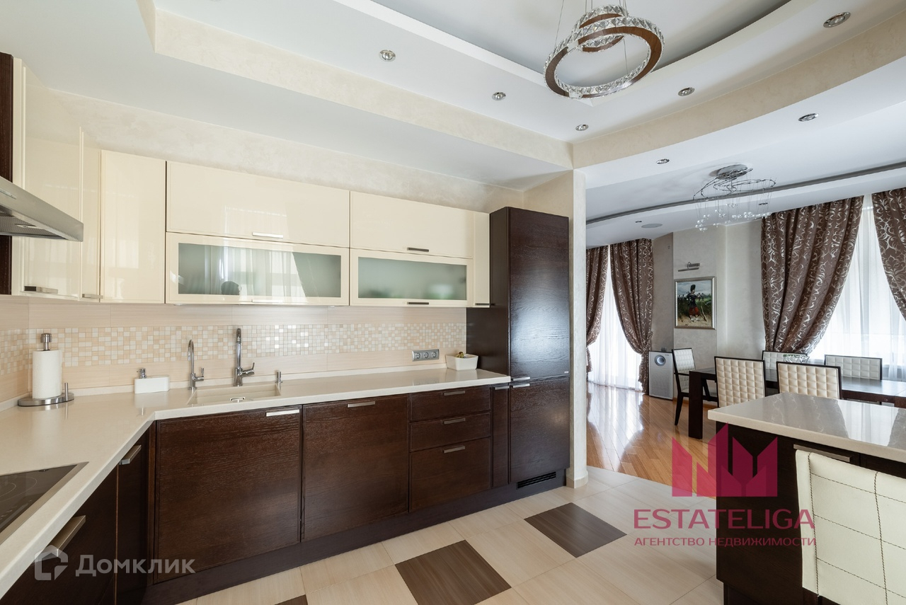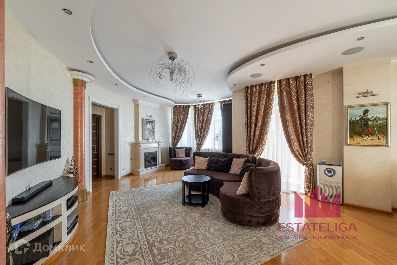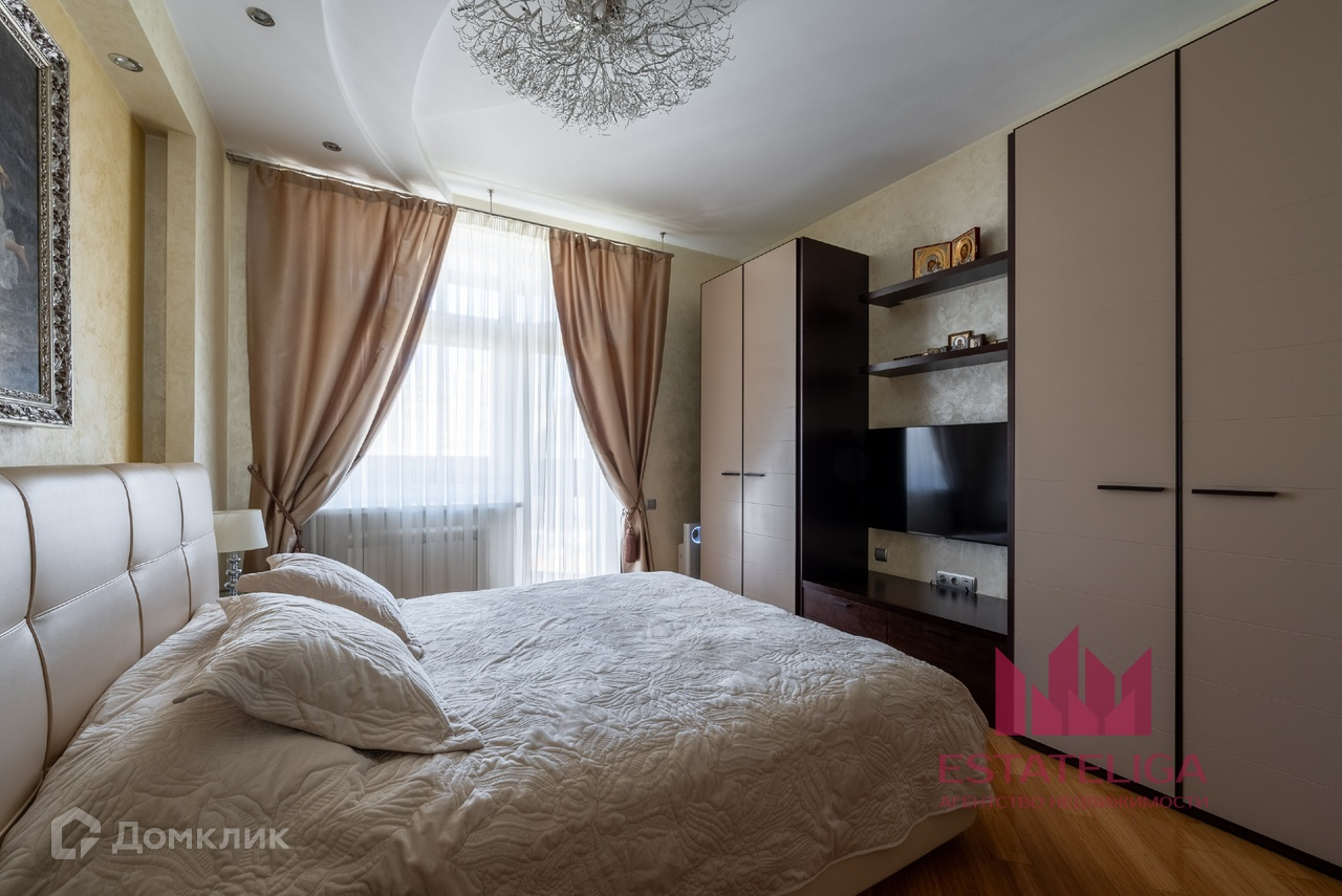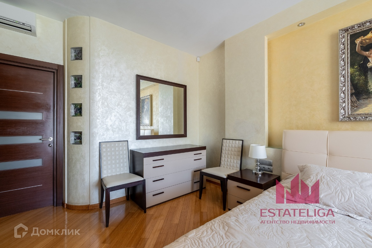 Квартира отличается удобной планировкой и включает в себя две просторные спальни, большую кухню, совмещенную с гостиной, два санузла и вместительную гардеробную. В гостиной, оформленной в современном стиле, установлены шесть окон, которые открывают захватывающий вид на МГУ и часть окон во двор.