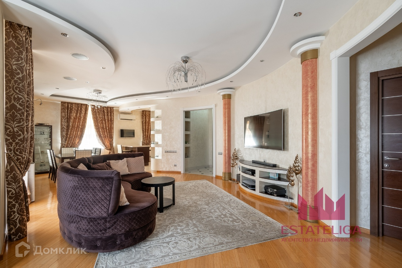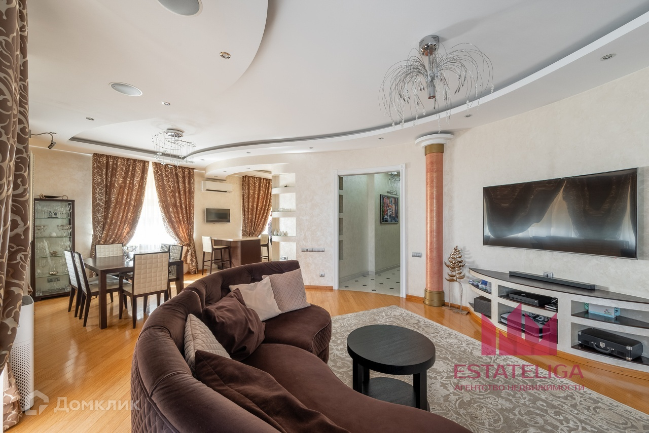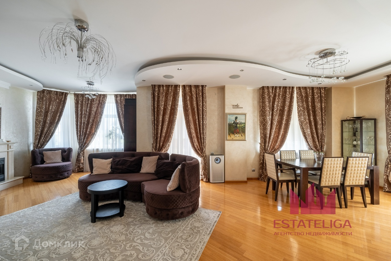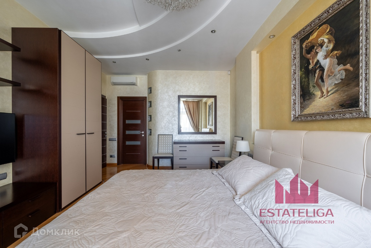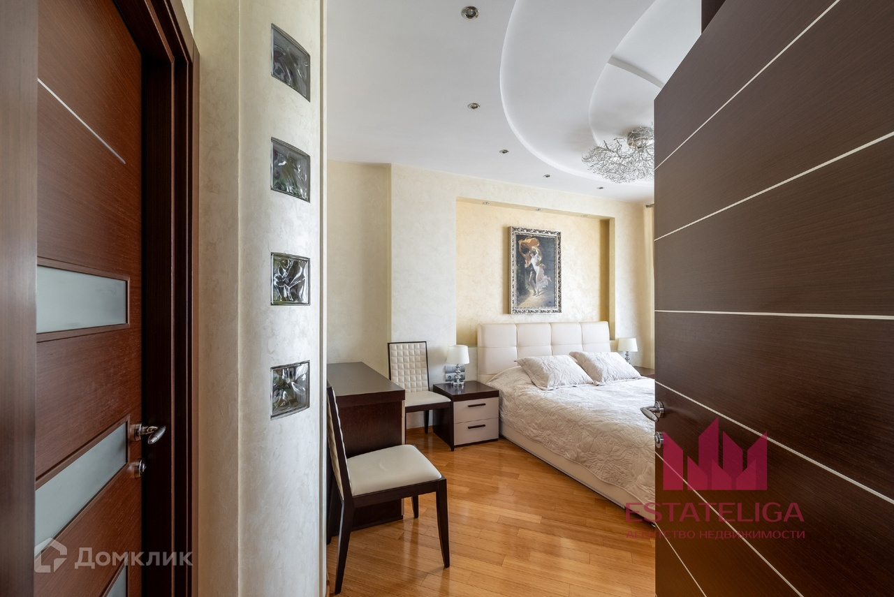 Квартира отличается удобной планировкой и включает в себя две просторные спальни, большую кухню, совмещенную с гостиной, два санузла и вместительную гардеробную. В гостиной, оформленной в современном стиле, установлены шесть окон, которые открывают захватывающий вид на МГУ и часть окон во двор.