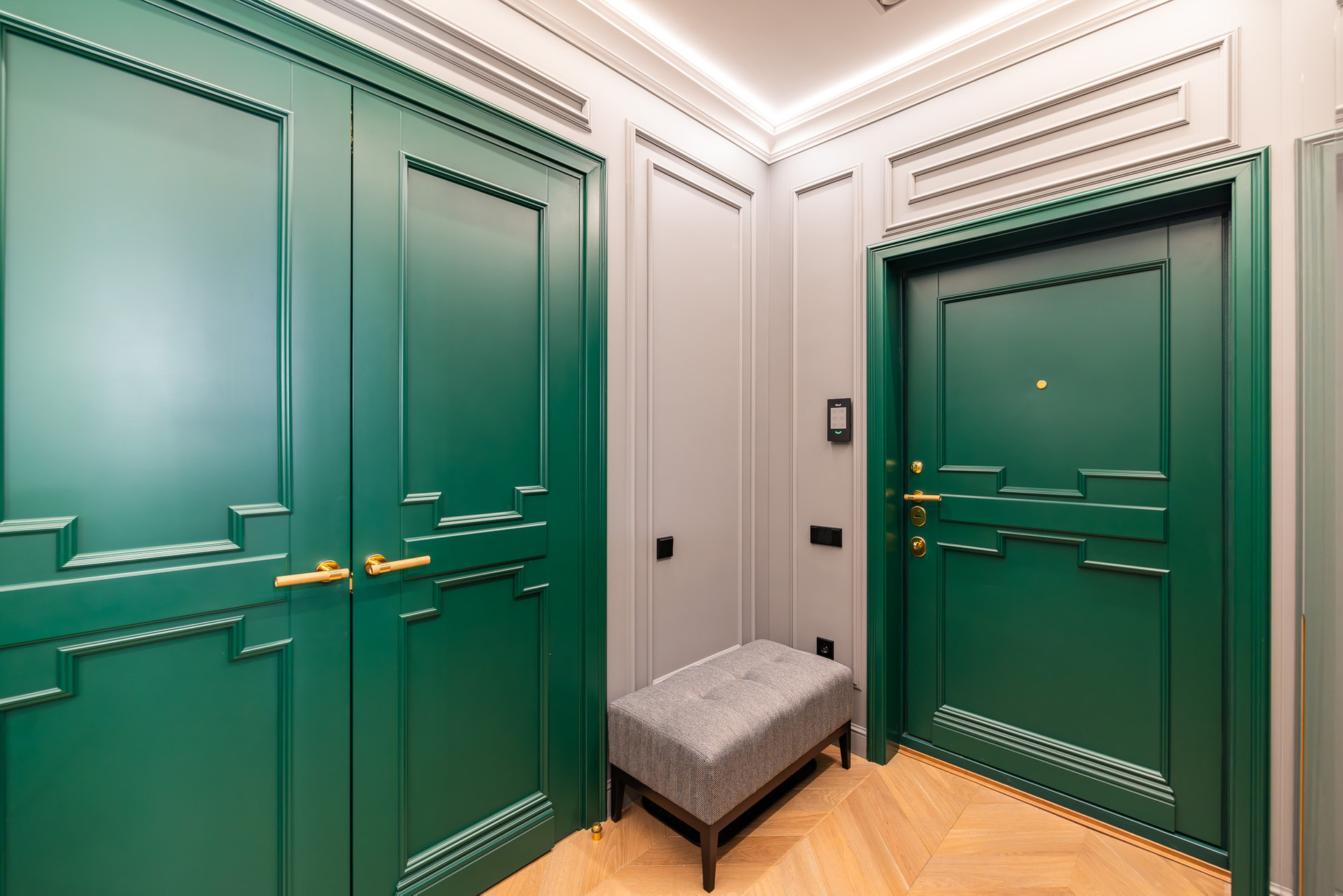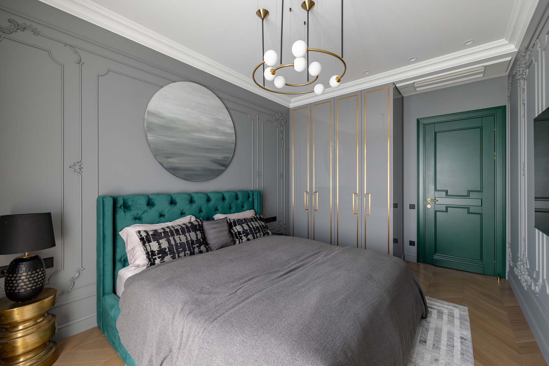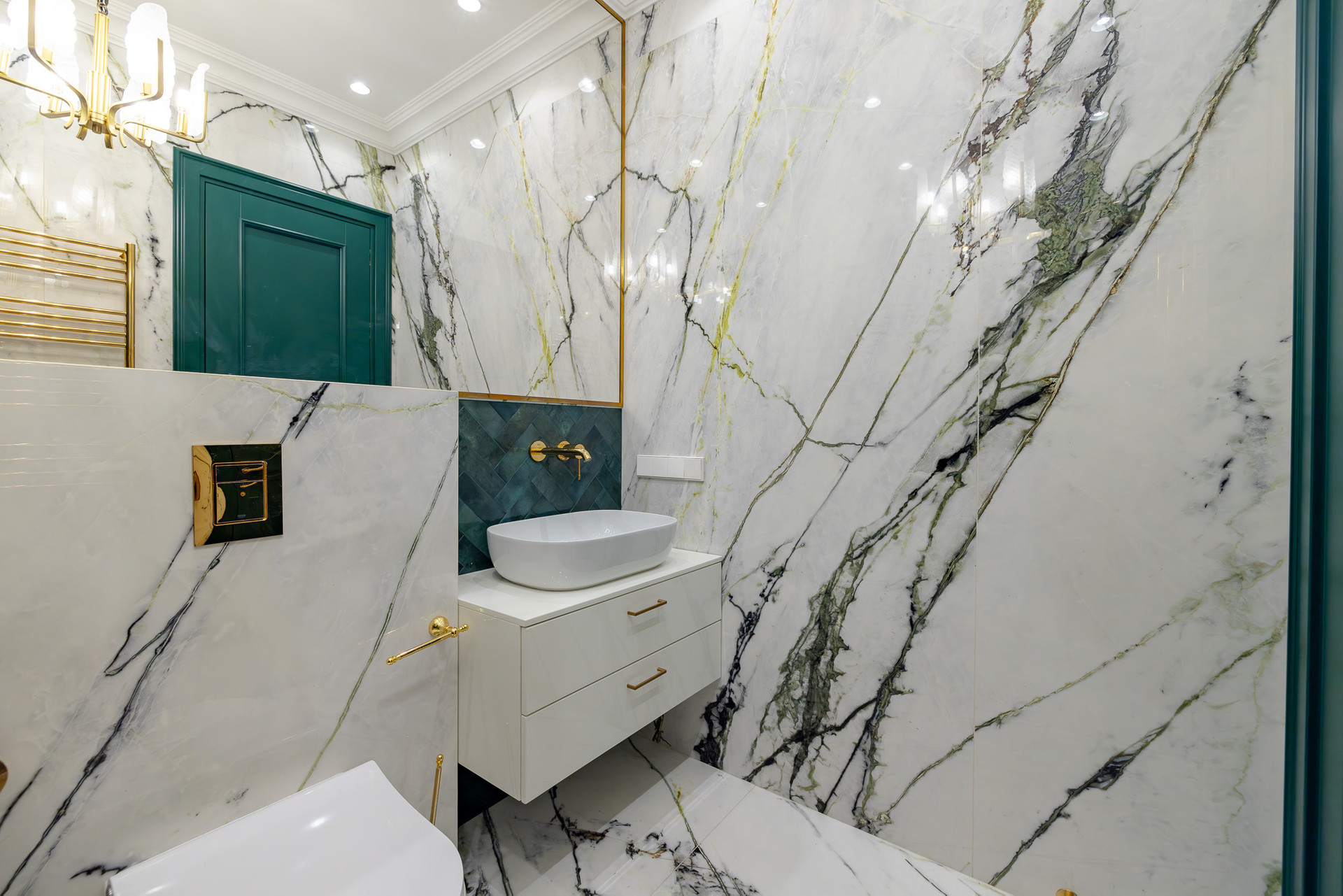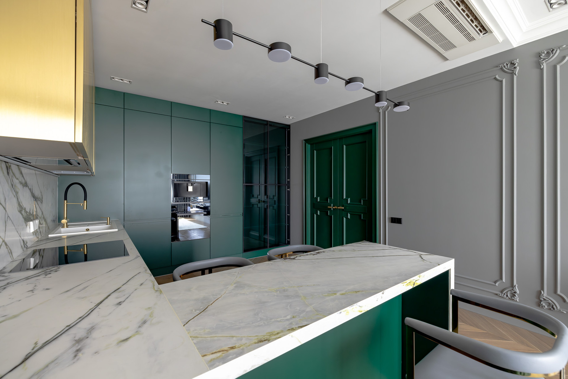 Глубокий зеленый, золотой и белый цвета доминируют в отделке.