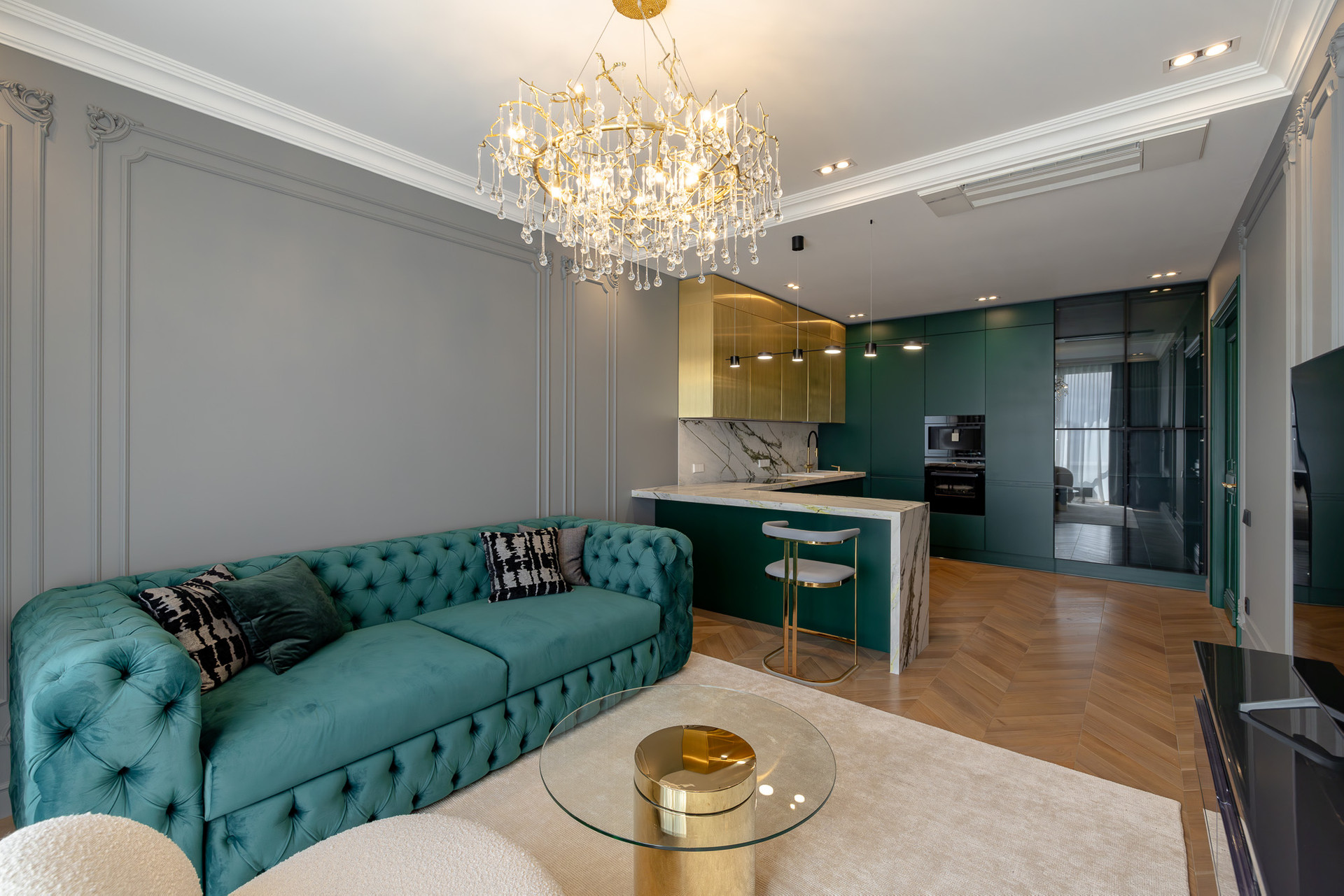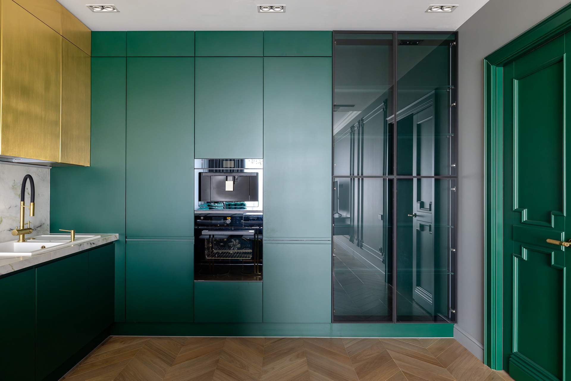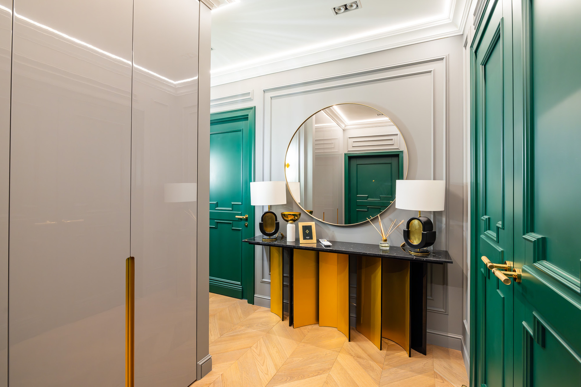 Глубокий зеленый, золотой и белый цвета доминируют в отделке.