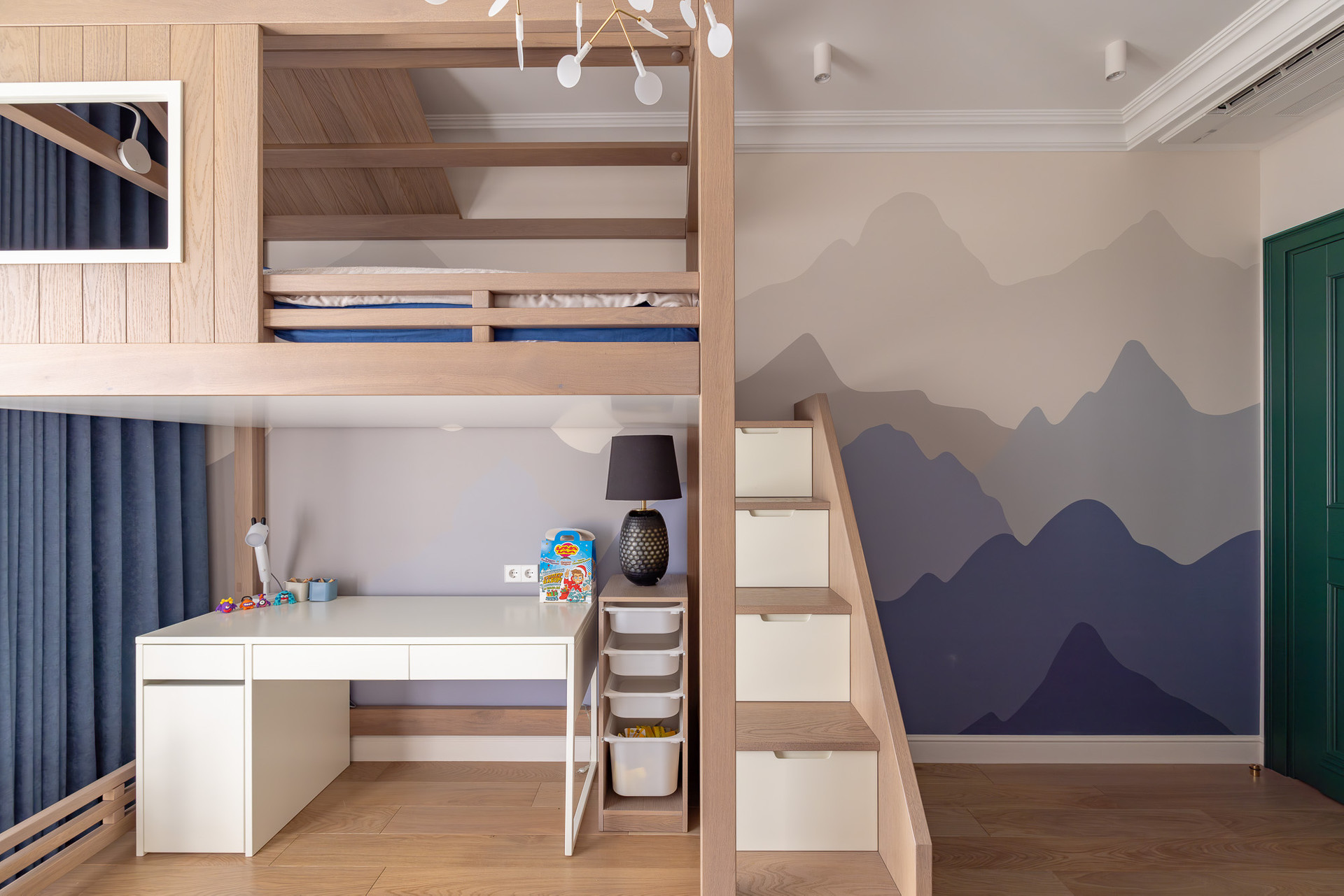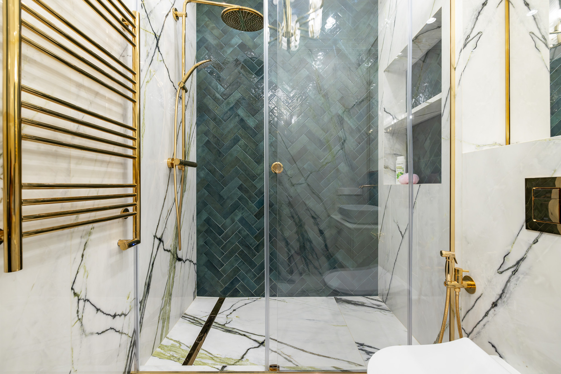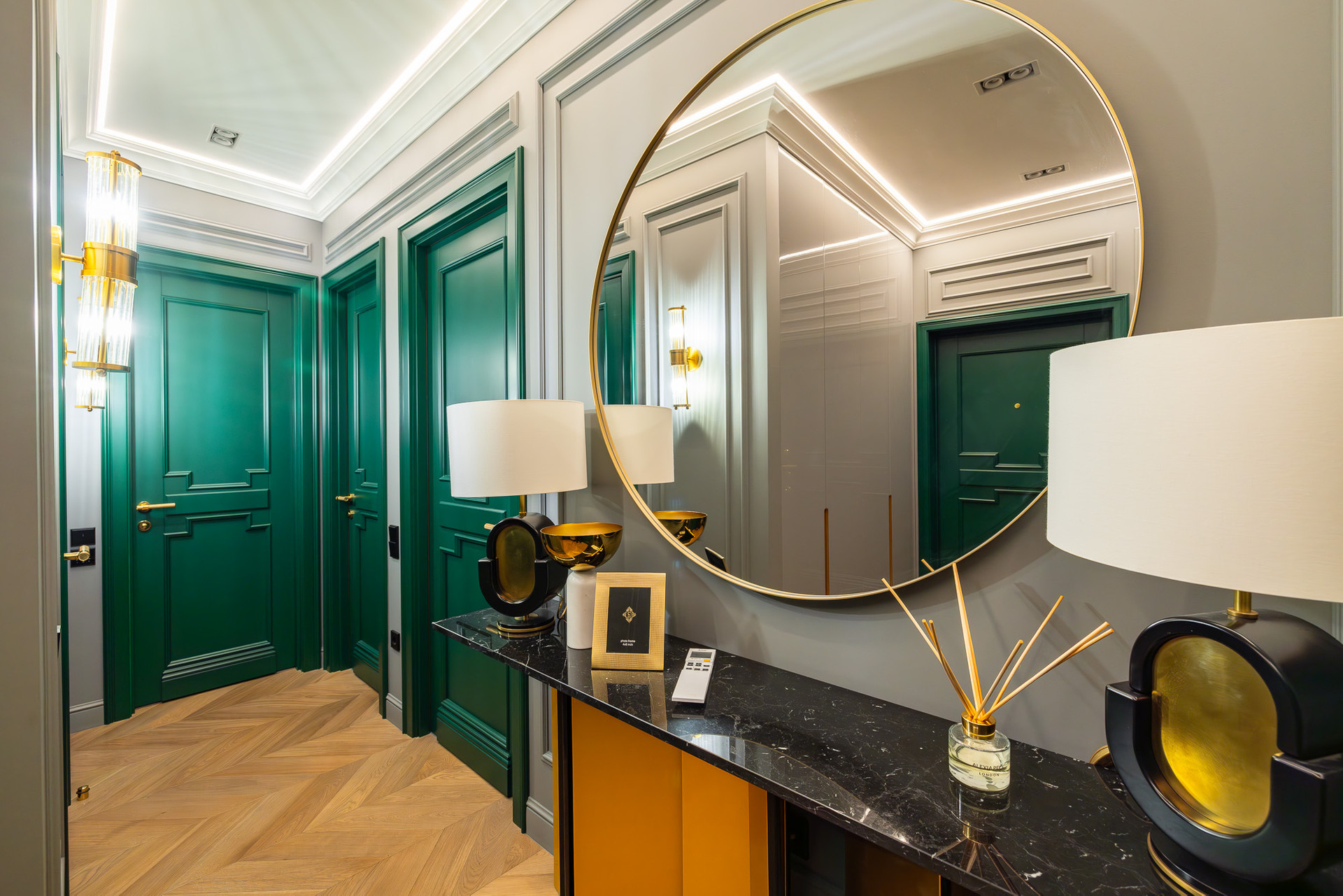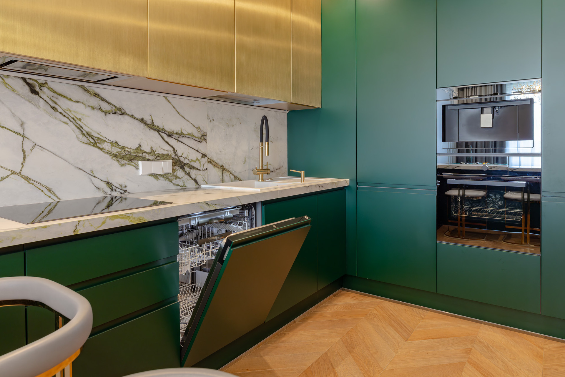 Глубокий зеленый, золотой и белый цвета доминируют в отделке.
