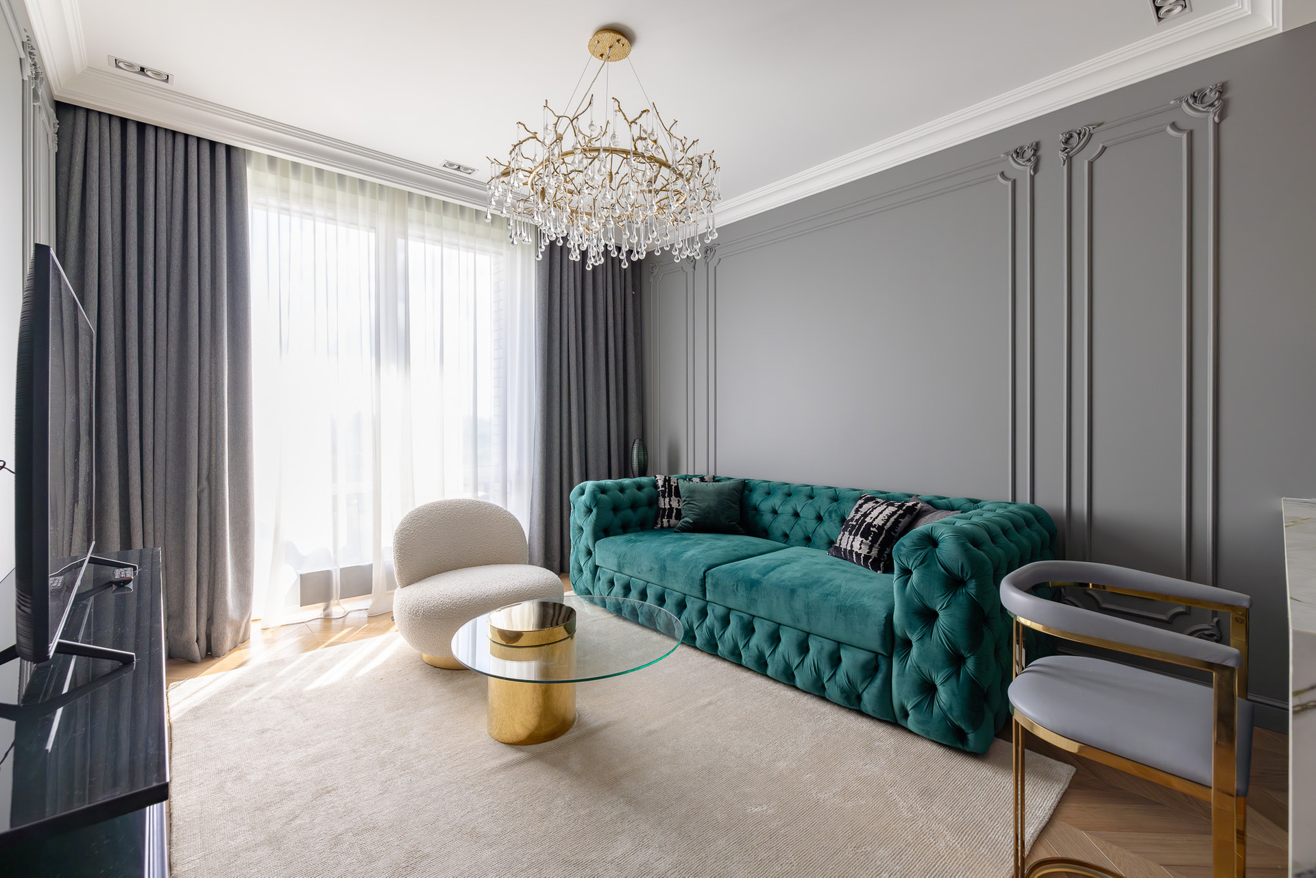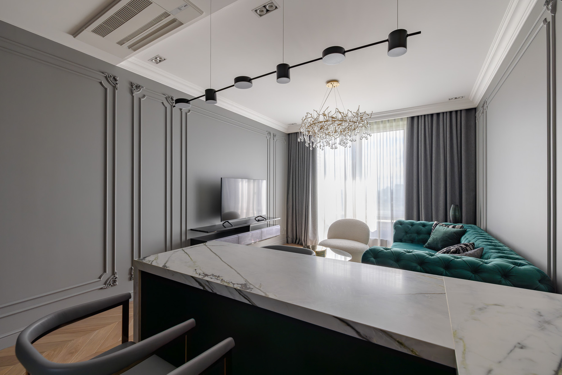 Темная мебель добавляет нотку роскоши, а лепнина подчеркивает изысканность интерьера.