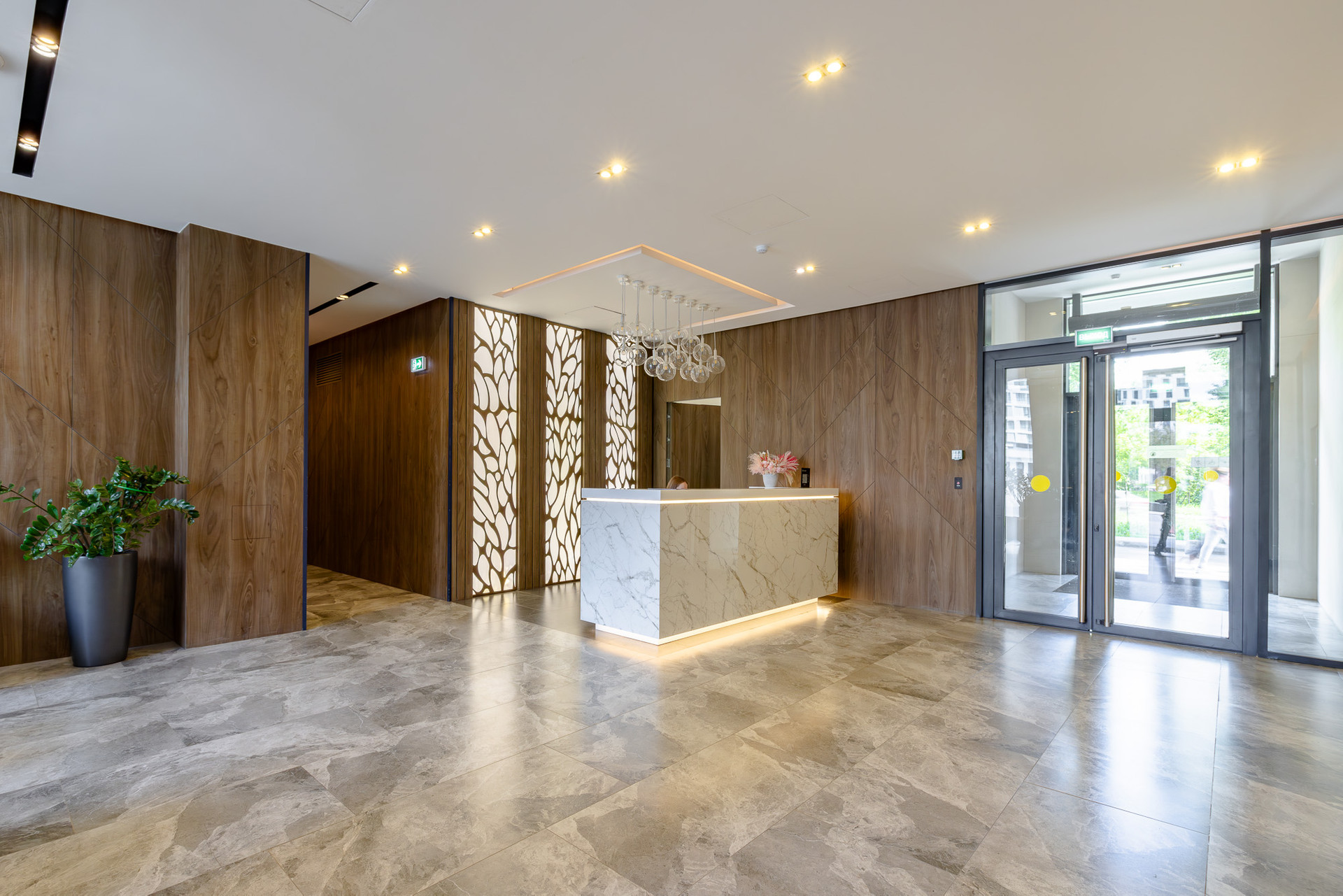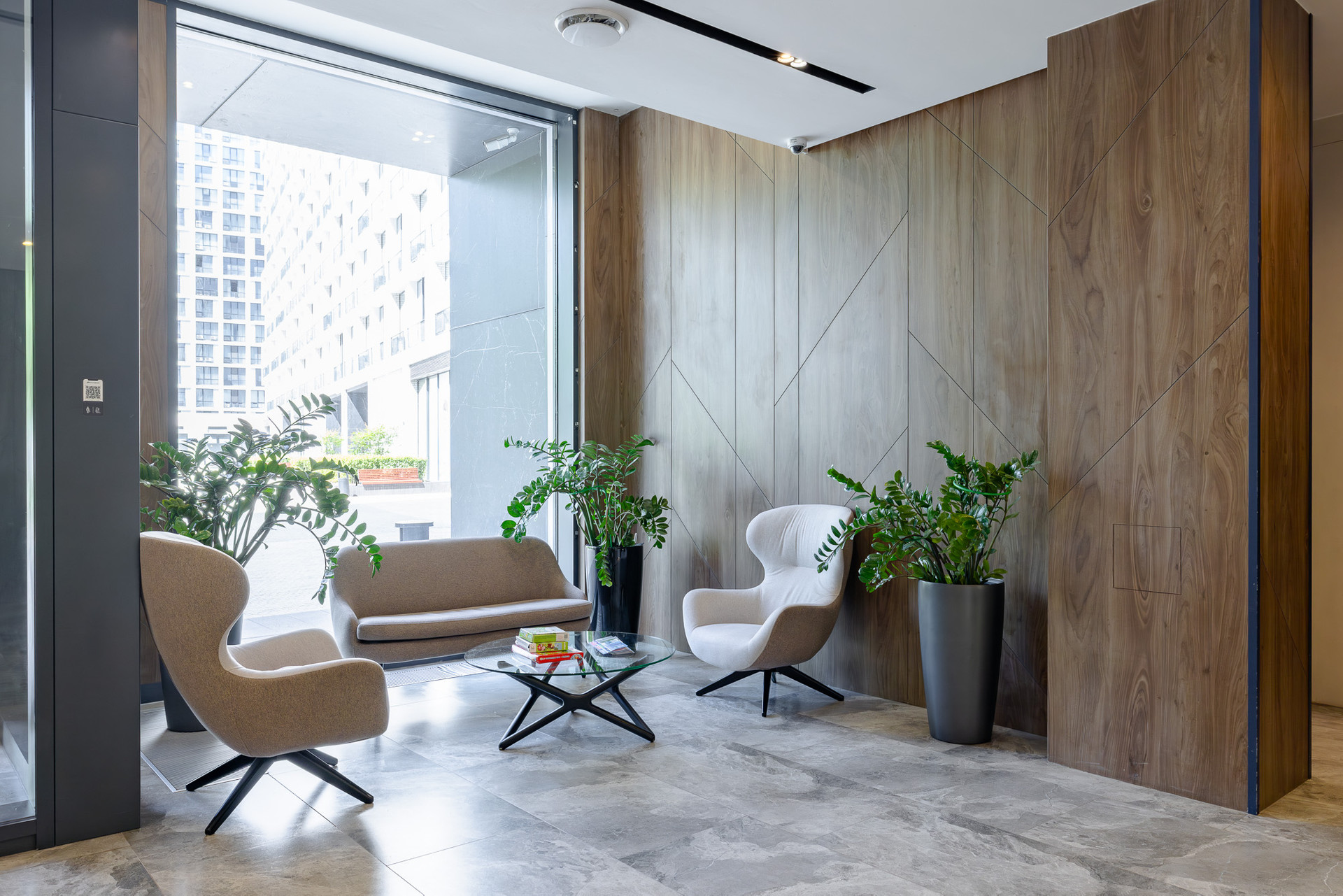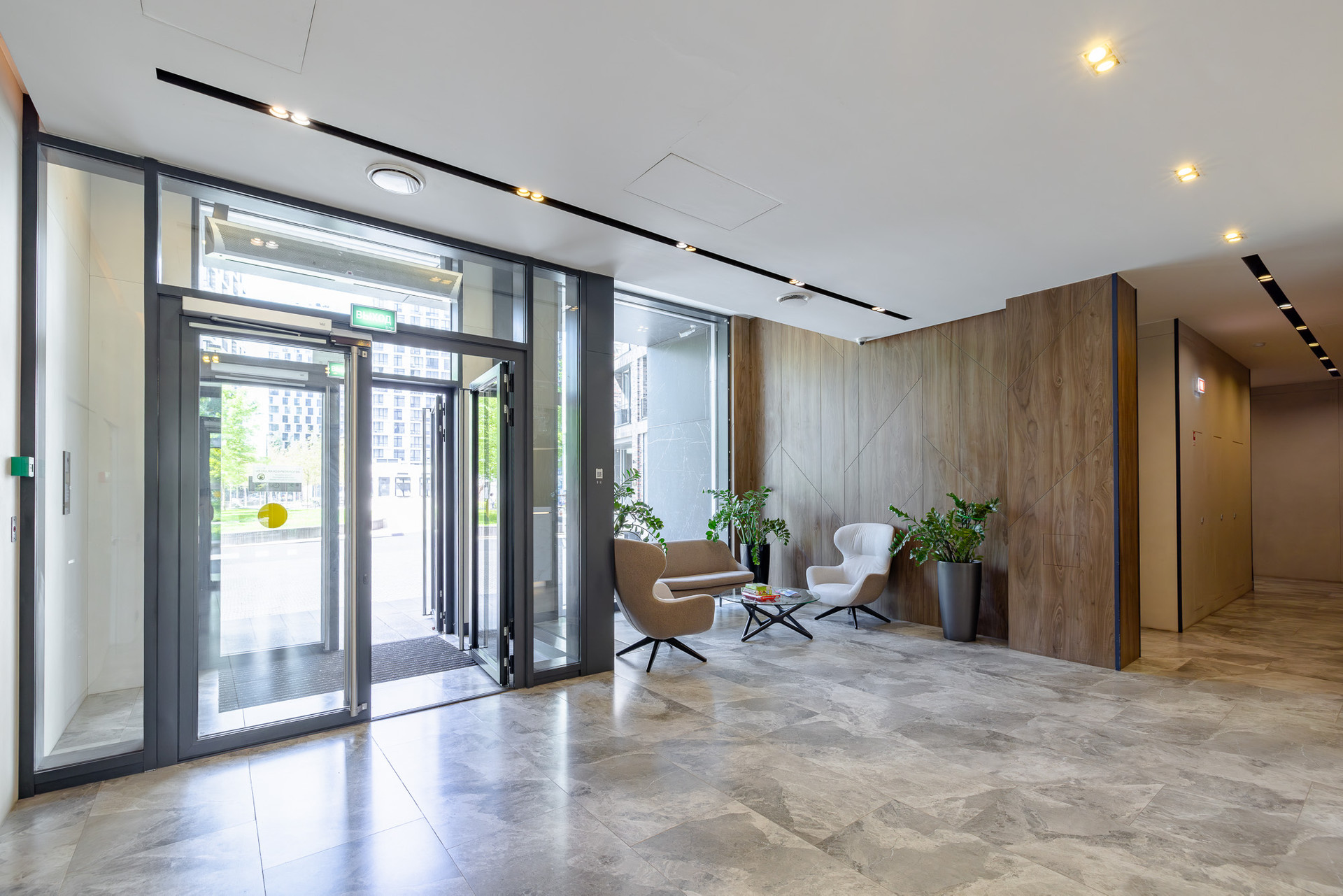 Входные группы и лобби продуманы по принципу безбарьерной среды, без порогов, ступеней и пандусов.