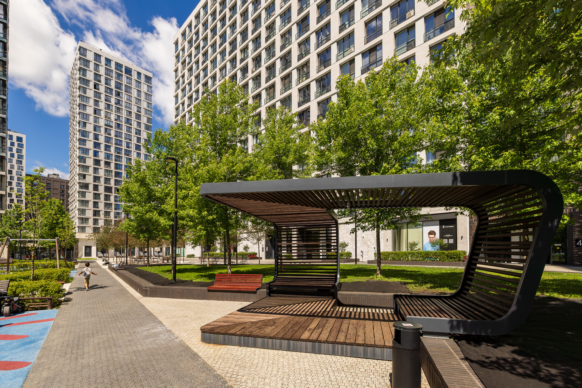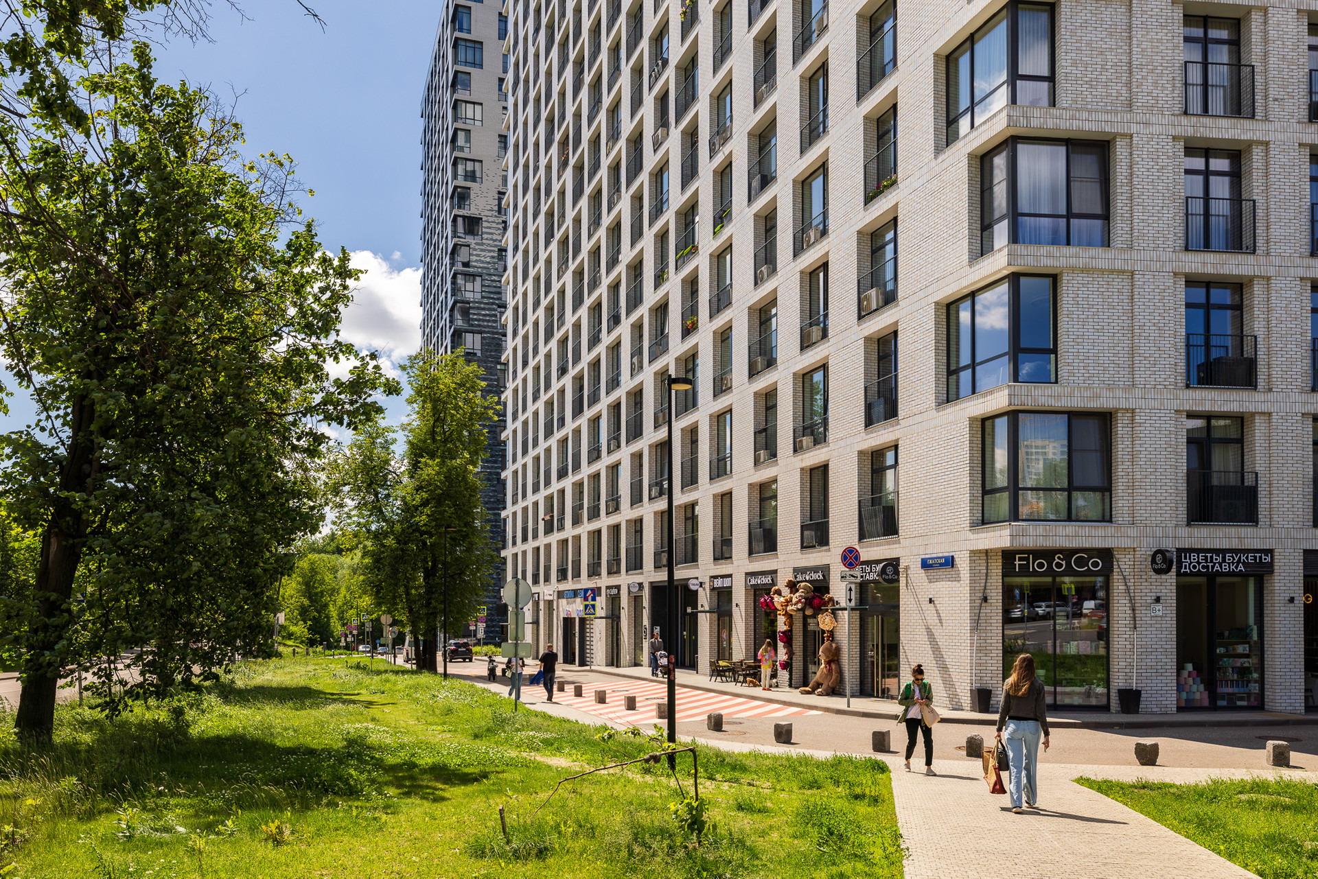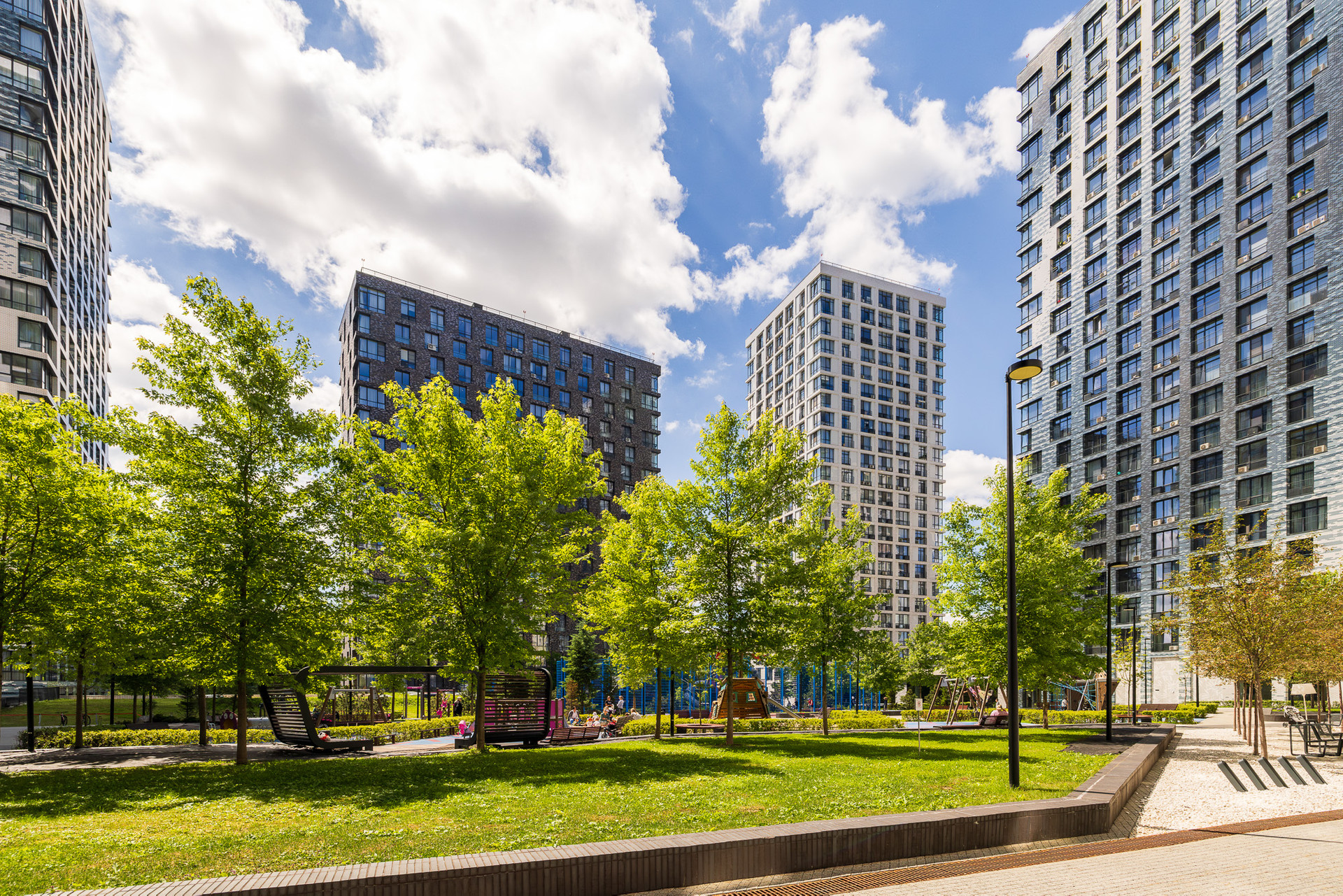 Корпуса переменой этажности от 17-ти до 23-х этажей образуют  два обособленных двора без машин. Территория комплекса разделена широким прогулочным бульваром,