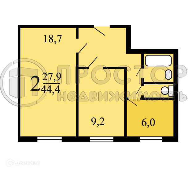 - Общая площадь 44,3 м.кв.( жилая площадь - 27,9, площадь кухни - 6)
