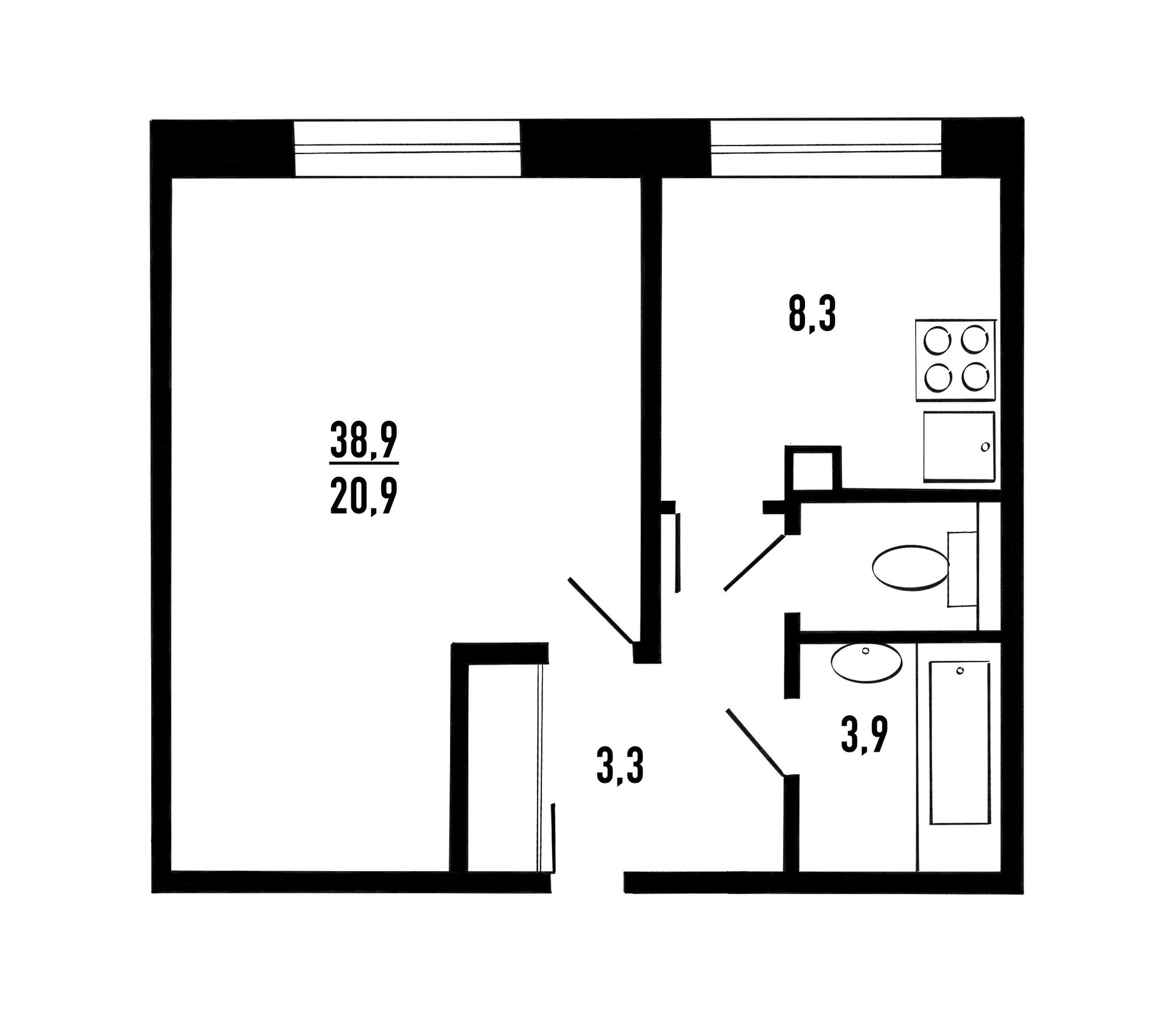 Планировка: Общая площадь квартиры 38,9 кв.м. (20,9 кв. м. жилая площадь), кухня 8,3 кв.м., раздельный с/у с ванной.  В квартире произведен евроремонт, что позволяет вам сразу заселиться и жить в комфортных условиях.