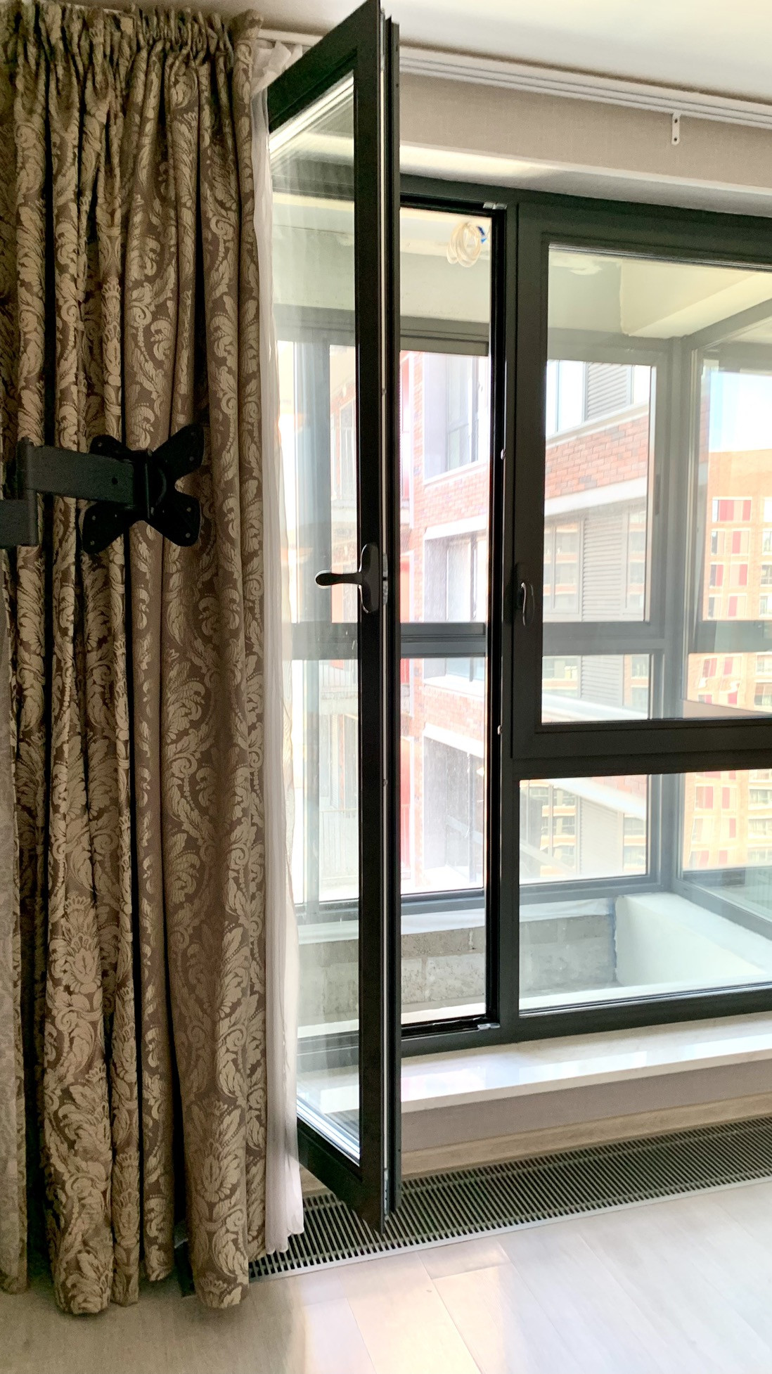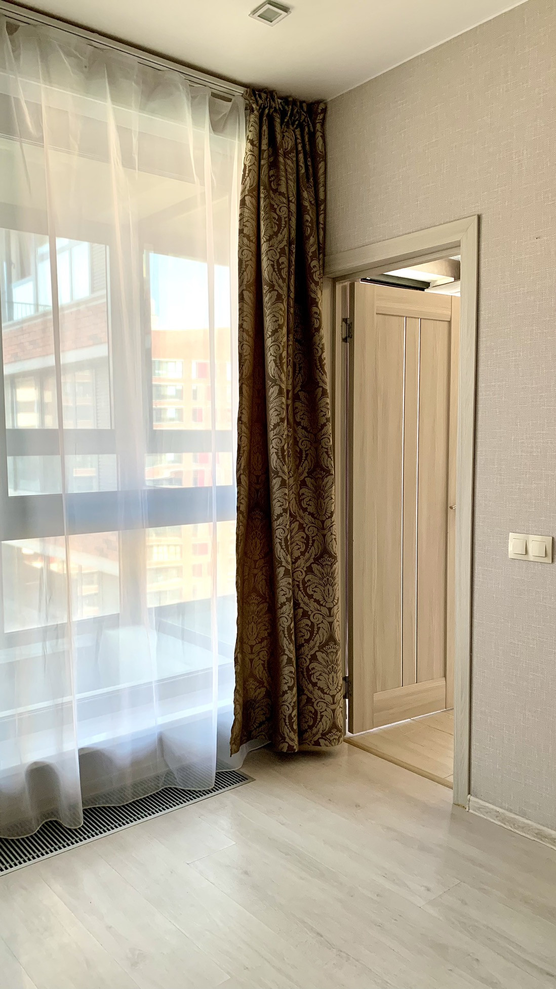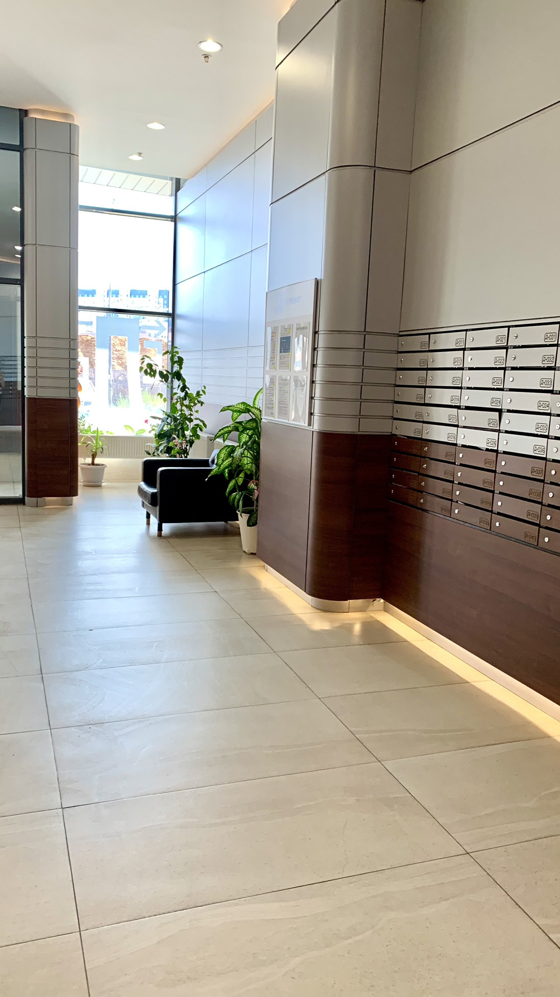 Панорамные окна от пола до потолка. Вид на закрытый внутренний двор без машин с детской площадкой и ландшафтным дизайном. За счет этого в помещении тихо, нет шума улицы. Колясочная на этаже.