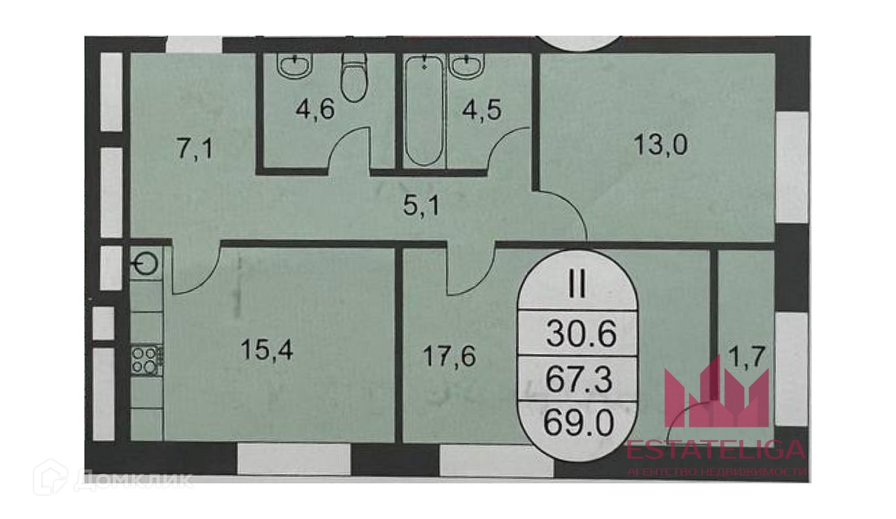 Жилая площадь 30.6 м2