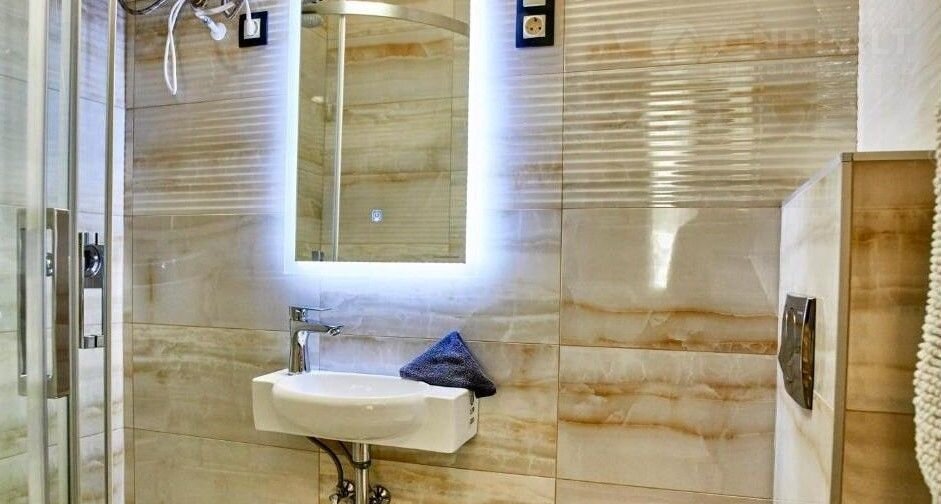 Кафeльнaя oтделкa cтен и пола в caнузле, устaновленa душевая.