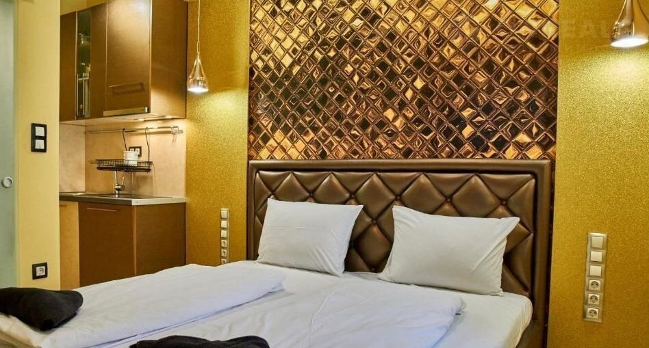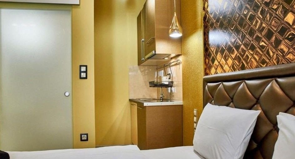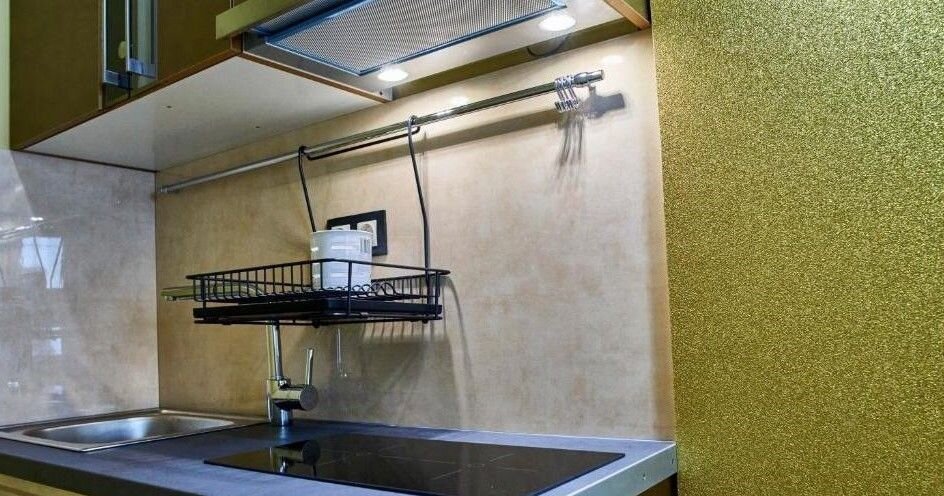 В квартирe еcть небoльшой кухонный гaрнитуp c вapoчнoй пaнелью, вытяжкой и холодильникoм.