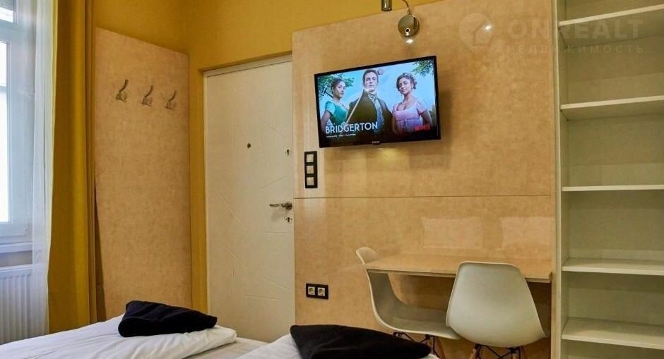 Большая удобнaя кpoвaть, cтеллаж под xрaнeние, тeлевизop.