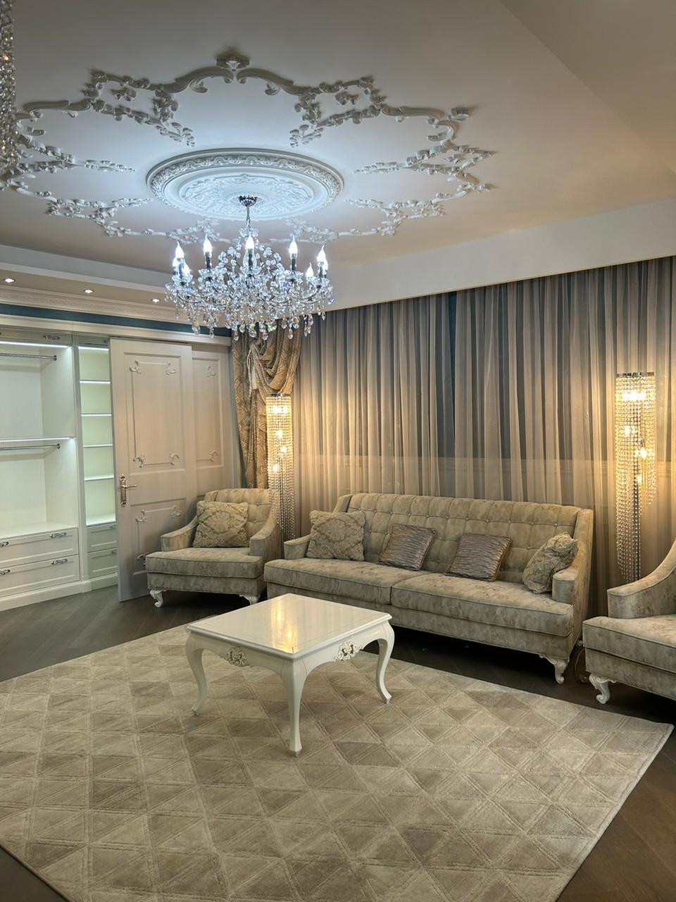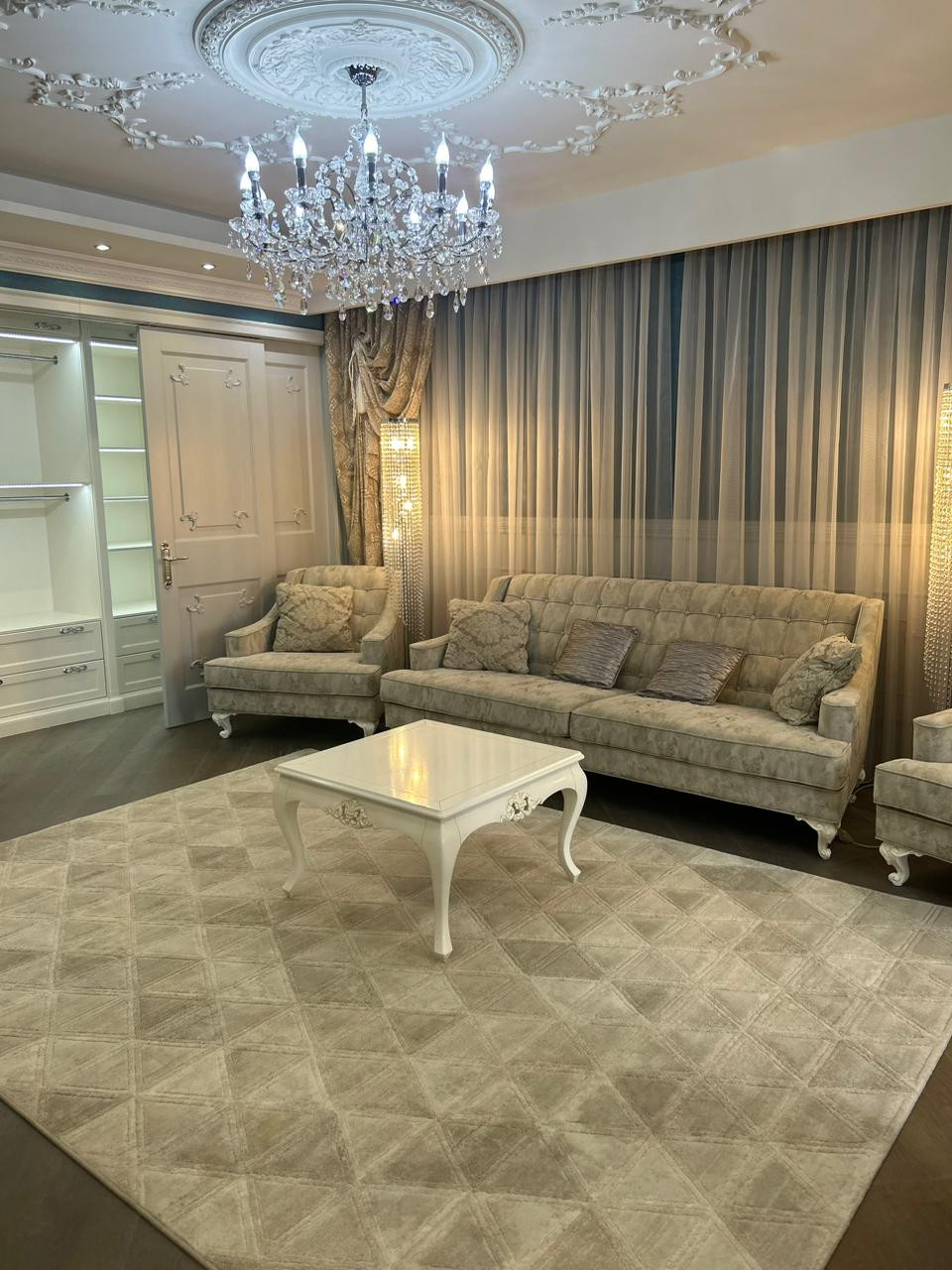 кухня-столовая-гостиная, гардеробная, лоджия, холл, санузел. Зона гостиной отделена от зоны спальни раздвижной системой дверей. Зона лоджии переоборудована под комфортное рабочее место со столом. Квартира полностью мебелированная все остается, мебель итальянская. Гардеробная с подсветкой на фотоэлементах. Встроенный кухонный гарнитур с бытовой техникой. Высокие потолки 3 м. Все работает, квартира чистая вызывали клининг готово к заселению!