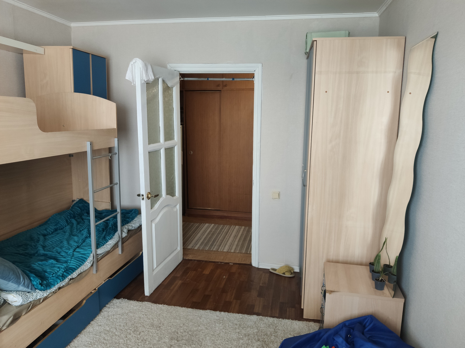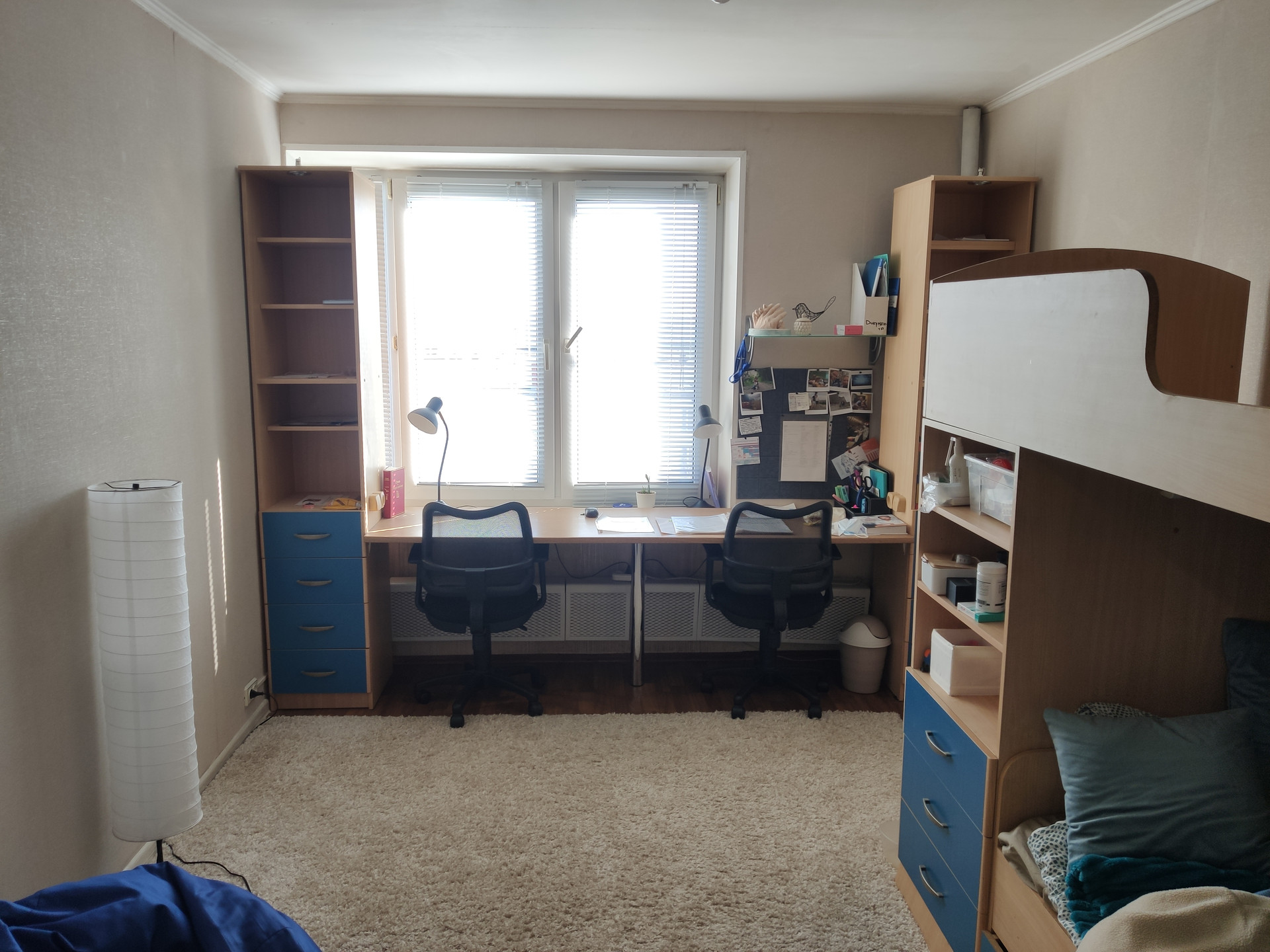 3. В детской комнате двух ярусная кровать, рабочие места и шкафы для двух детей.