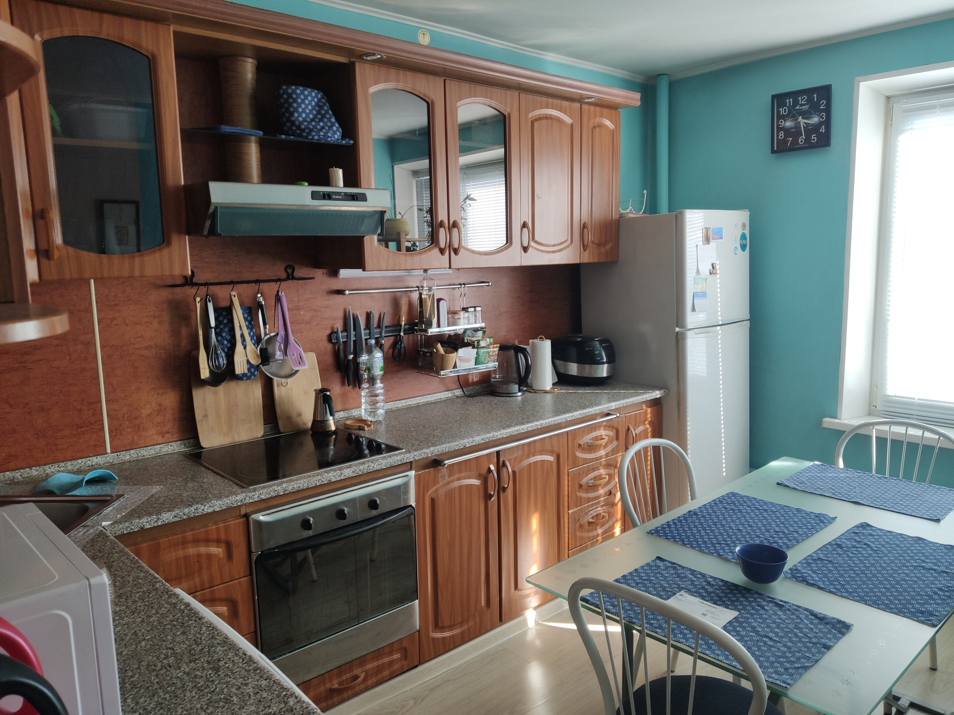 1. Кухня со всей необходимой техникой: варочная поверхность, духовка, вытяжка, холодильник, микроволновка. Площадь очень большая, даже диван поместился свободно.