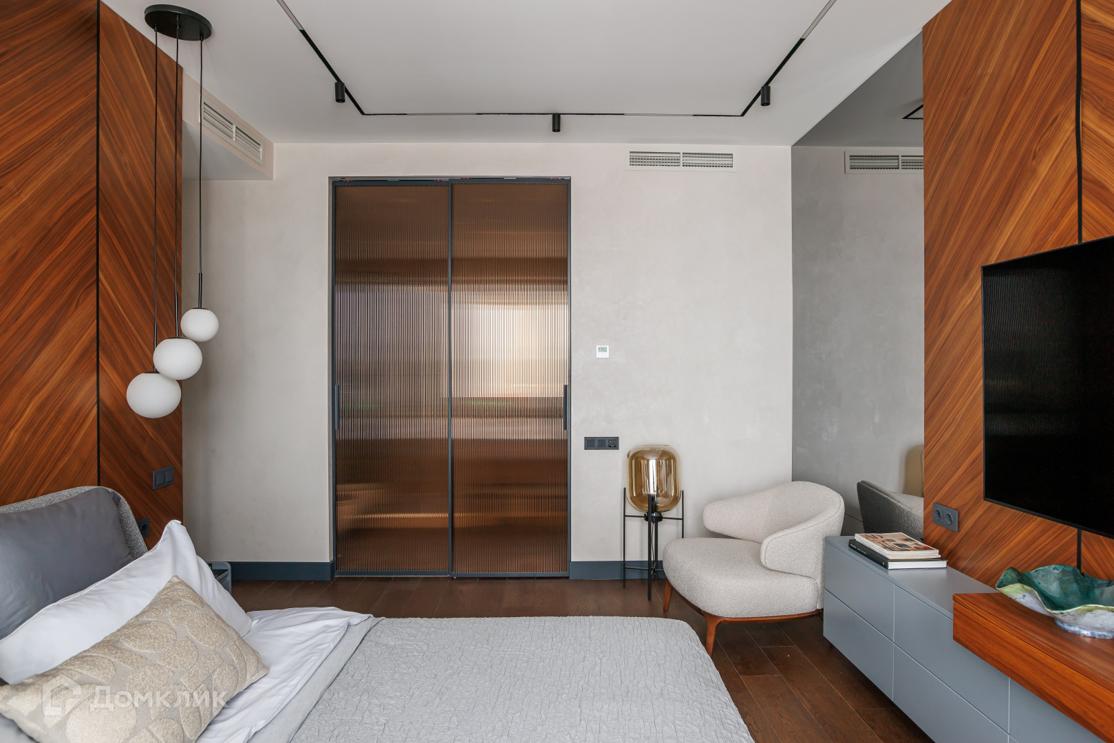 Для отделки стен выбраны светлая декоративная штукатурка, зеркальные панно, плитка с имитацией дерева, фактурные и текстильные панели.