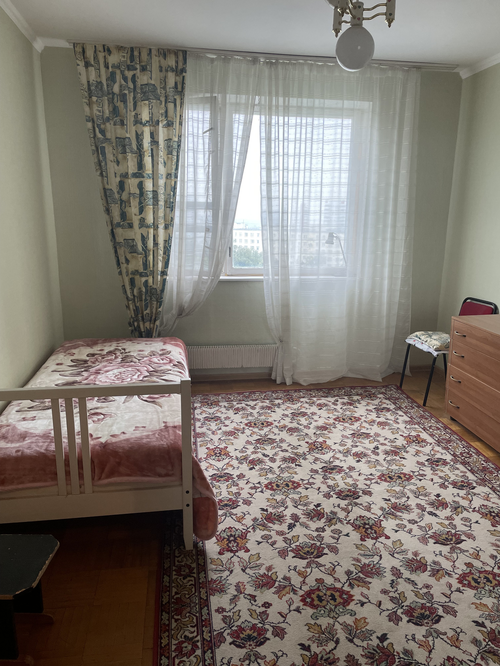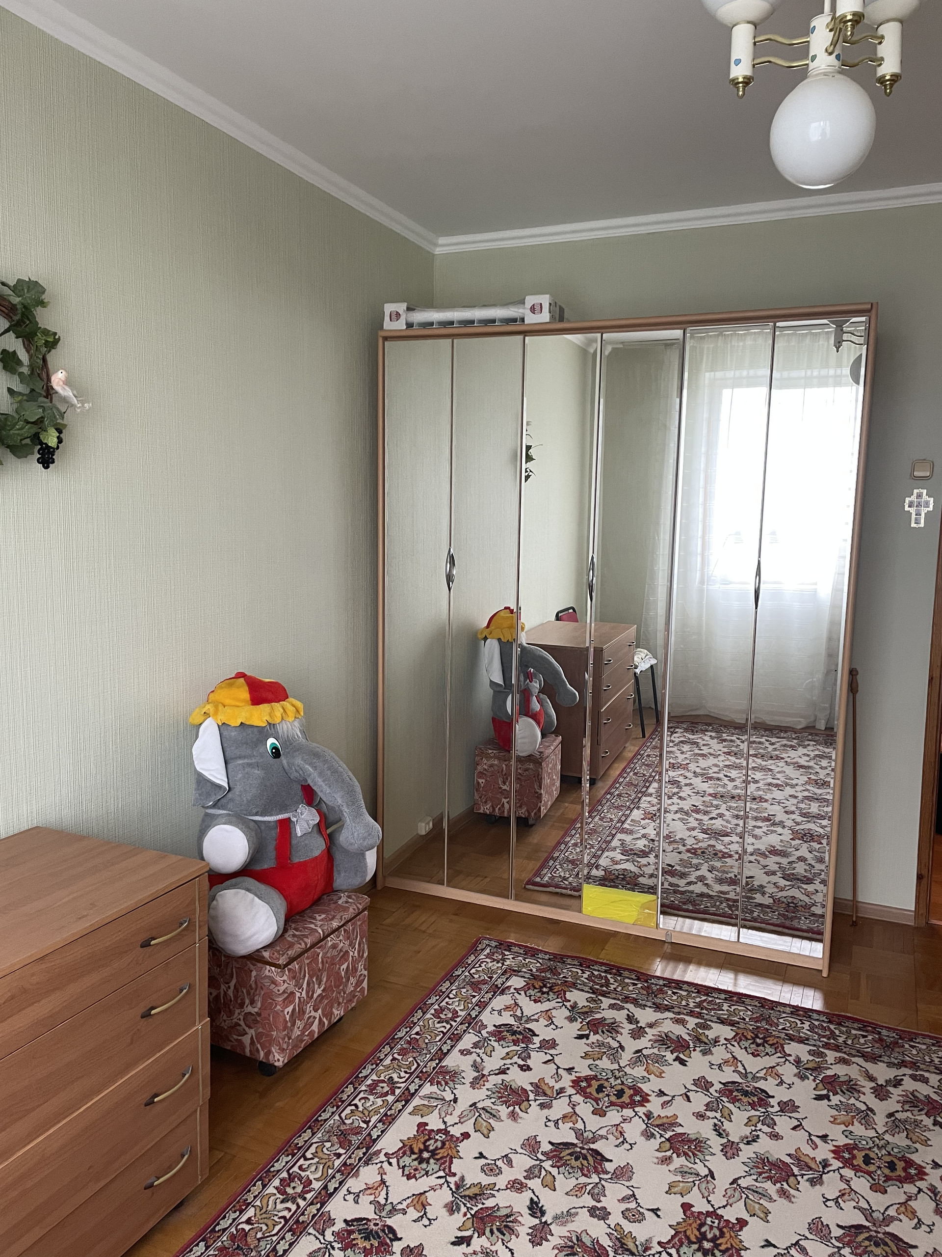 Окна квартиры выходят в тихий и зелёный двор, где расположены детская и спортивная площадки. Это идеальное место для семей с детьми, которые смогут наслаждаться играми и активностями на свежем воздухе прямо у себя во дворе.
