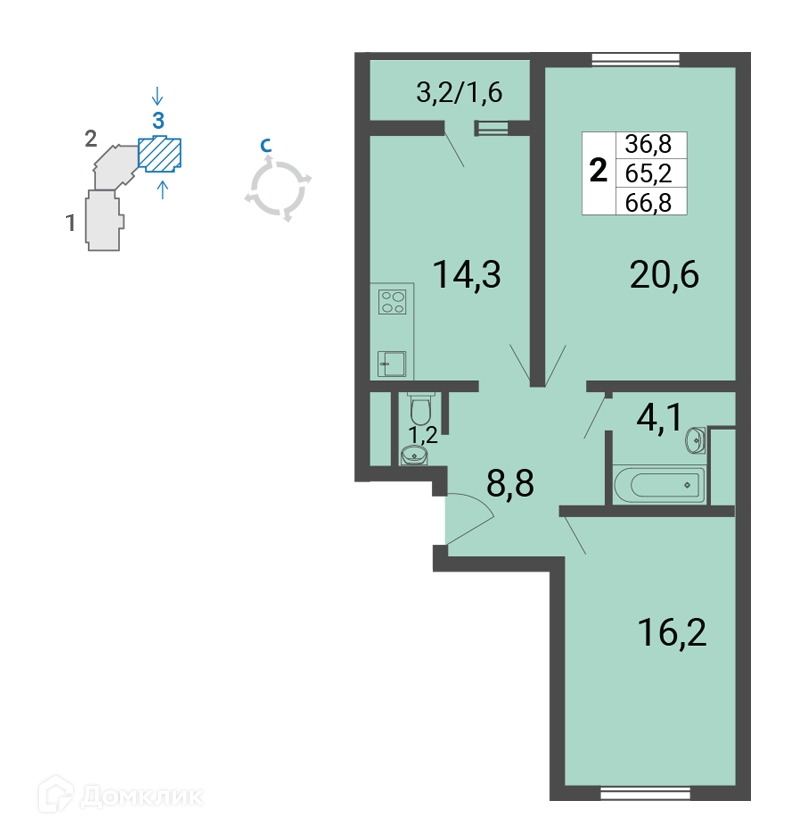 Общая площадь 66.8 м2