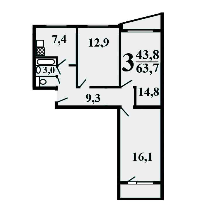3-комнатная квартира, 63.7 м2, этаж 11 / 12, на продажу в Москве, Троицкая улица, 10с1