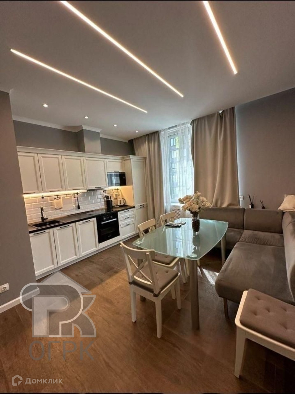 В квартире выполнен качественный дизайнерский ремонт. Натуральные материалы. Теплые полы, сплит система кондиционирования. Вся мебель и встроенная техника остается (холодильник, духовой шкаф, варочная панель, посудомойка, микроволновая печь, кондиционеры, телевизоры 3 шт). Высокие потолки.