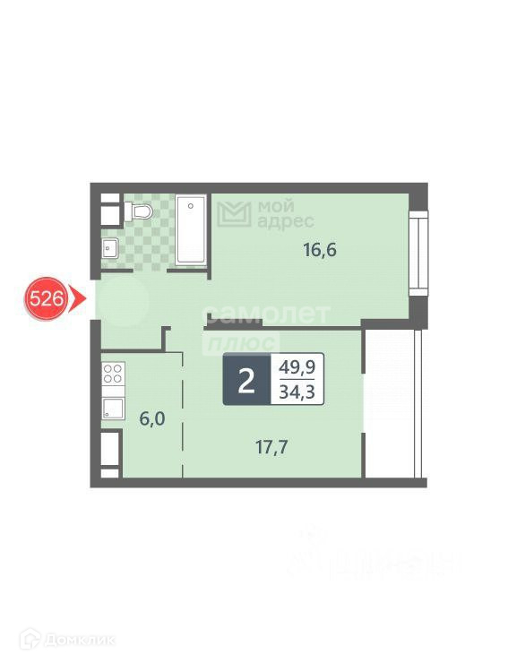 Жилая площадь 34.3 м2