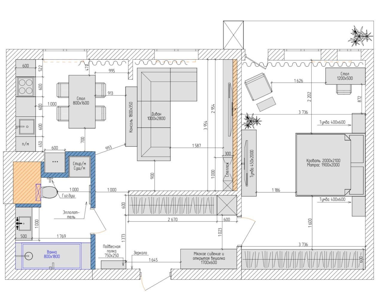 С порога вас встретит большой просторный коридор с местами хранения. Далее большая гостиная, в которой предусмотрены диван для большой компании, телевизор, зона для отдыха и места хранения. Гостиная объединена с кухней, что гарантирует пространство и атмосферу для уютных домашних вечером.