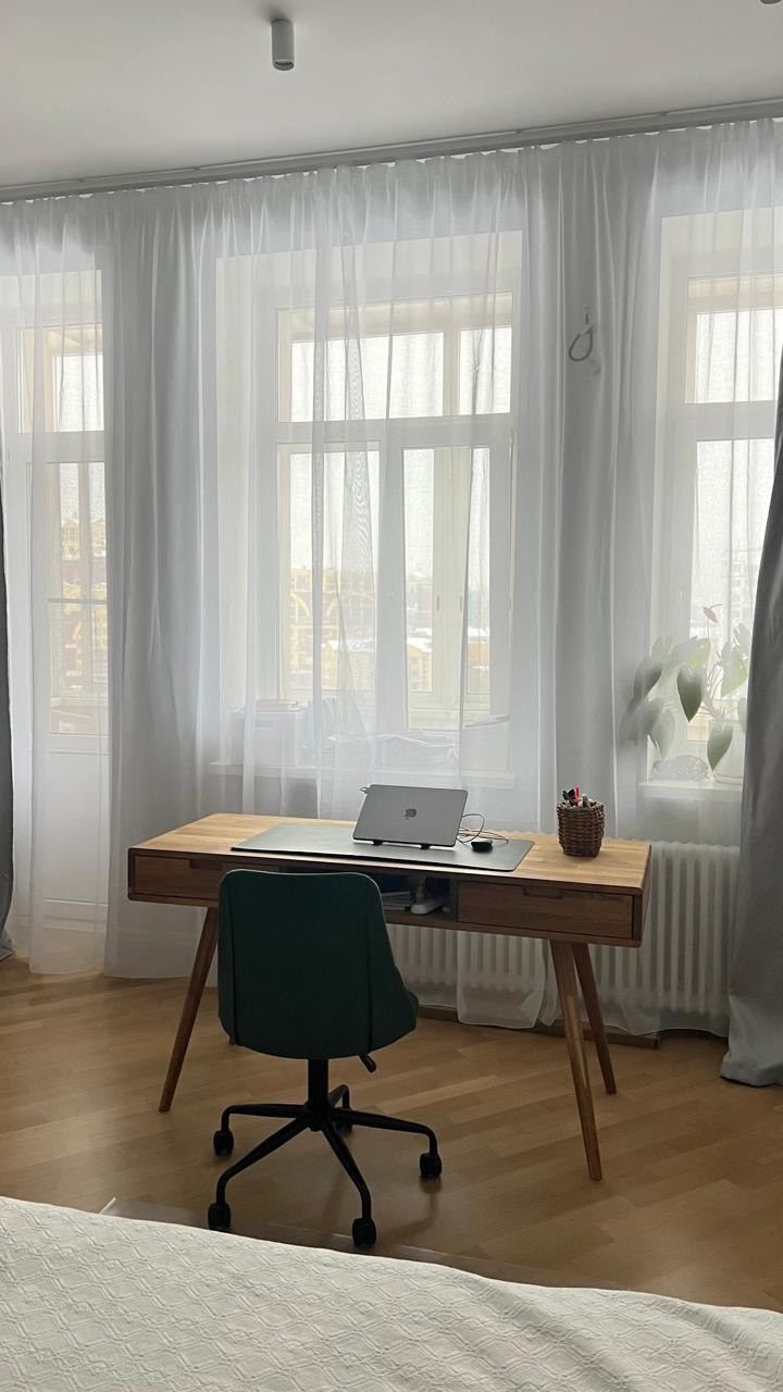 В отдельной комнате — спальне, большая двухместная кровать, рабочее место и вместительные шкафы. В спальне есть просторный балкон, с которого открывается панорамный вид на Москву.